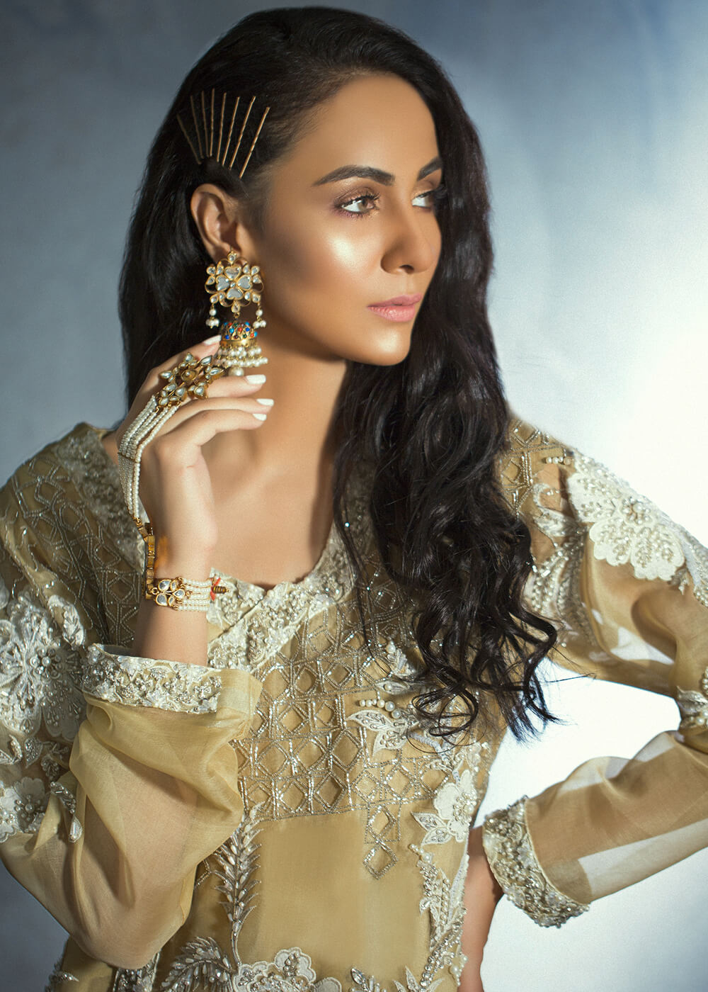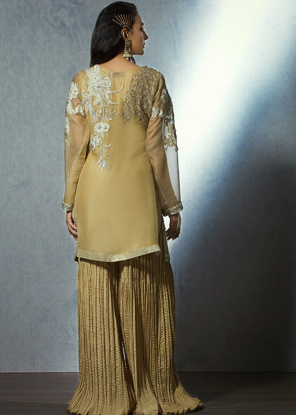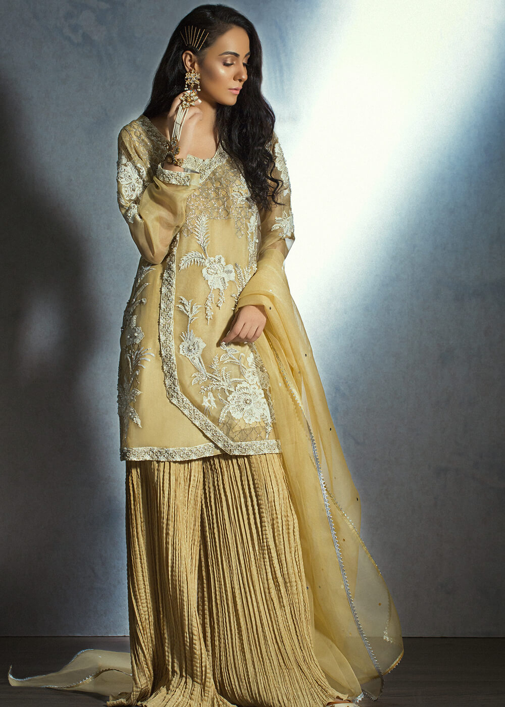 A lime yellow organza shirt adorned in applique work and beautiful crystals, sequence and beads embellishments. It is paired with crushed sharara and organza duppata, Just to add a luxurious dimension to the timeless elegance of this design.