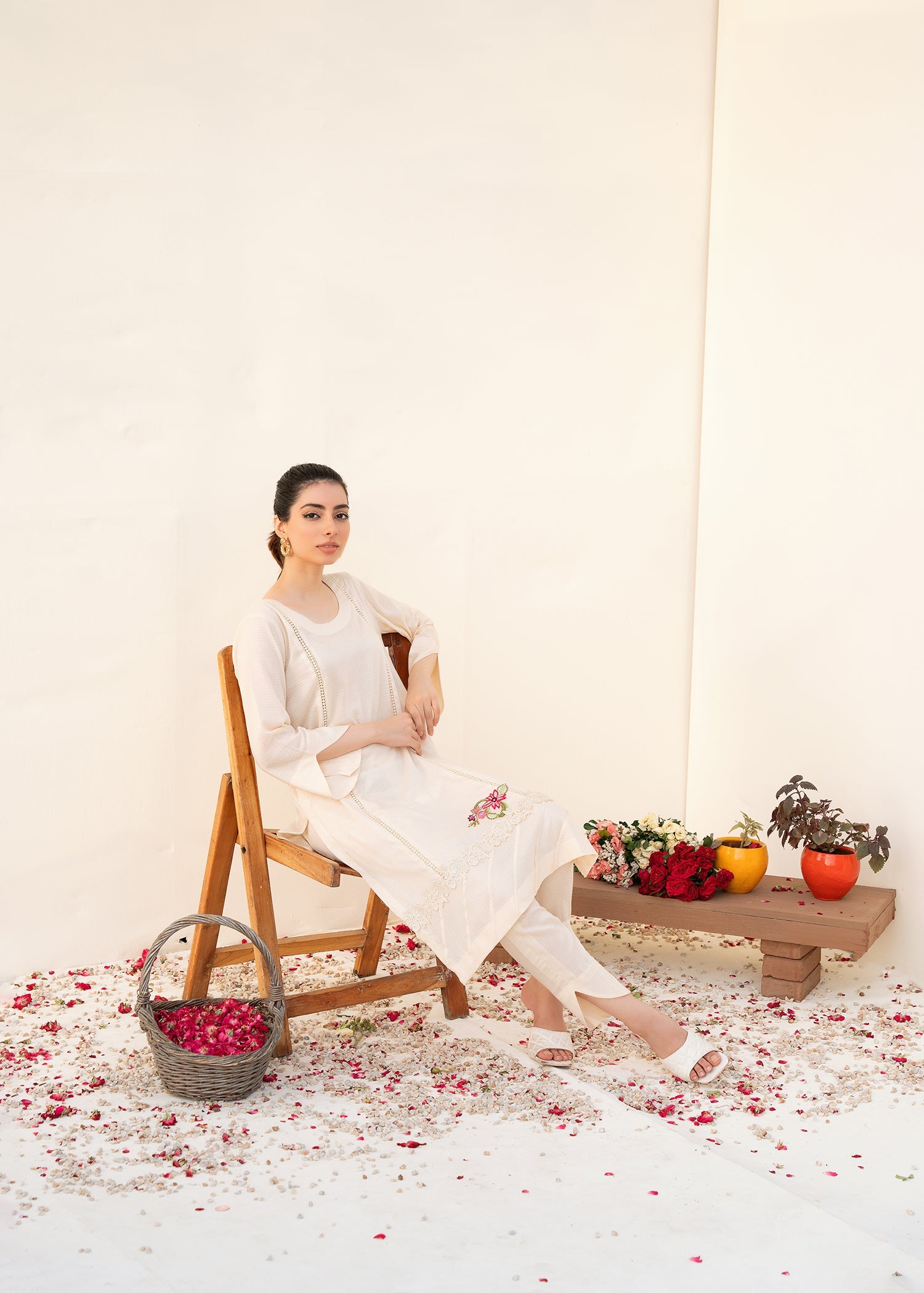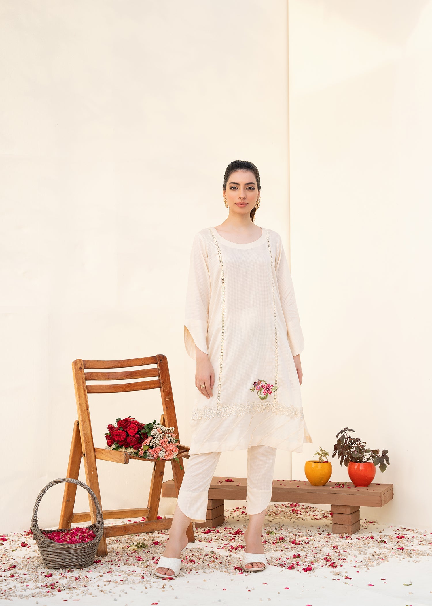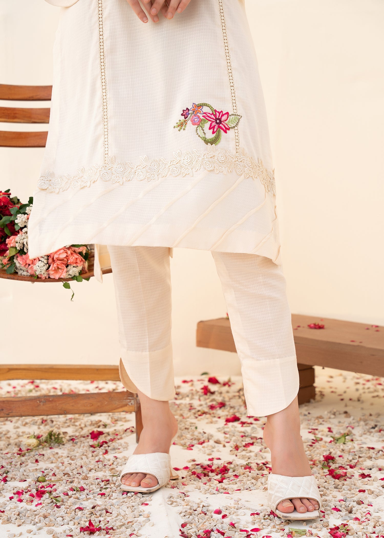 The dress features a calming ivory color and intricate details such as pin tucks at the sides, lace embellishments, and an embroidery motif at the daaman. These elements combine to create a visually appealing and culturally significant garment.