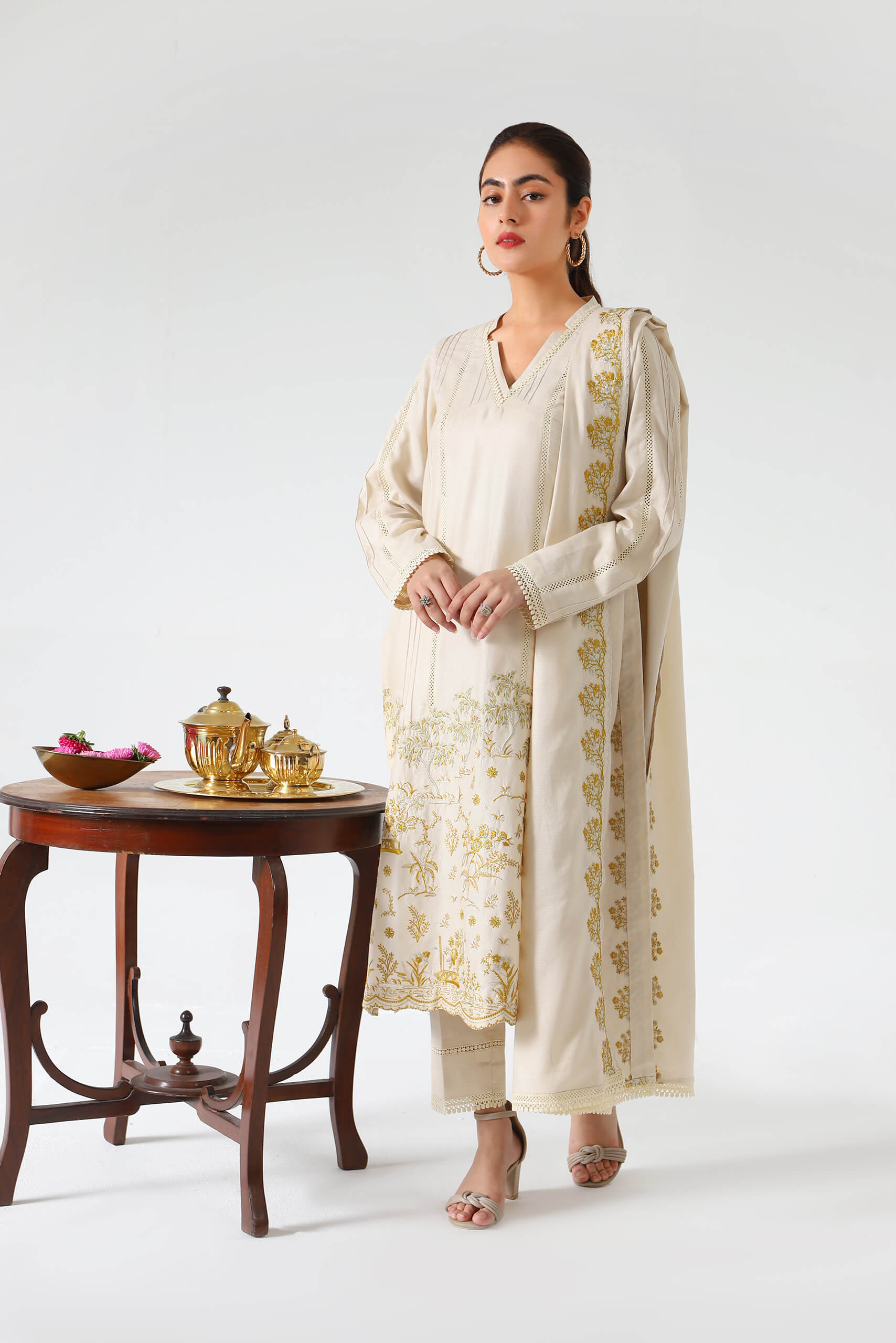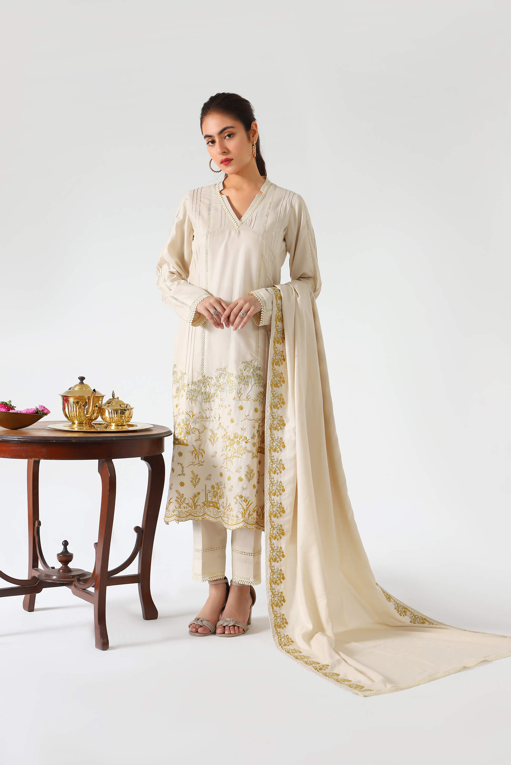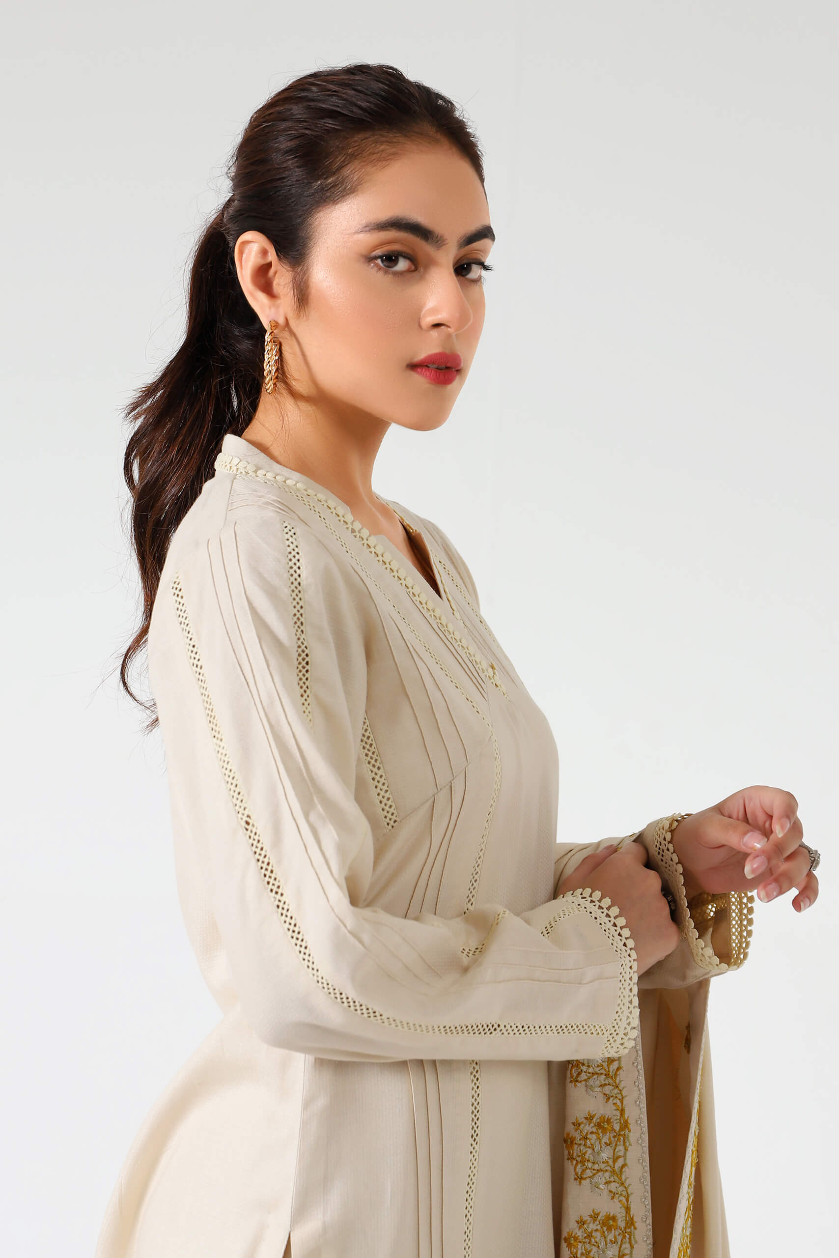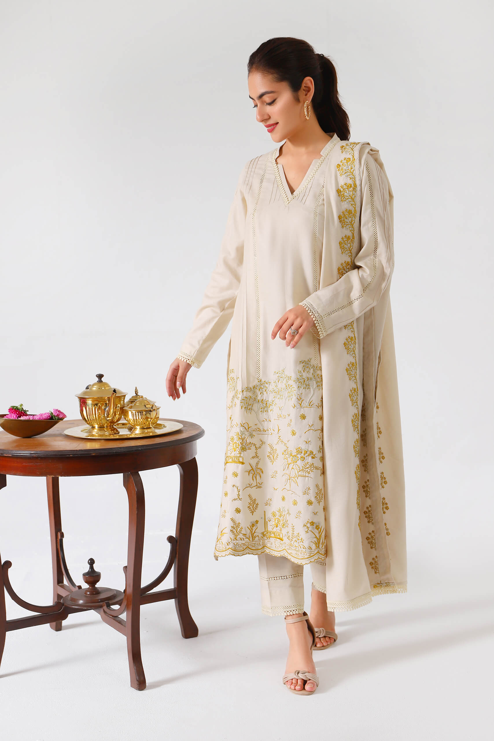 On a ivory canvas of self jacquard, artfully composed pale yellow embroidery is rendered on the daman. Stitched with pintucks and laces, thus giving it a Carmin's signature pret feel.