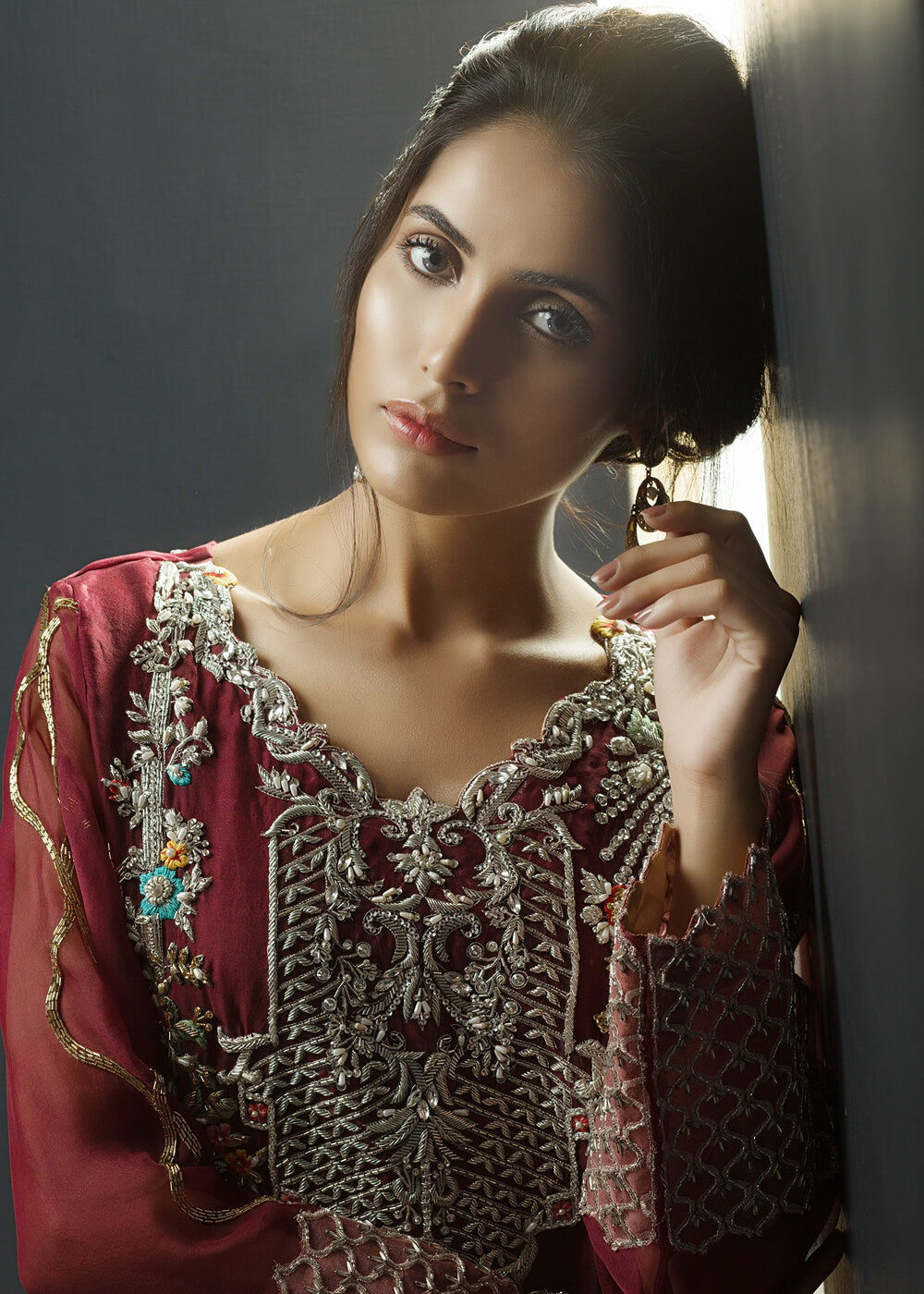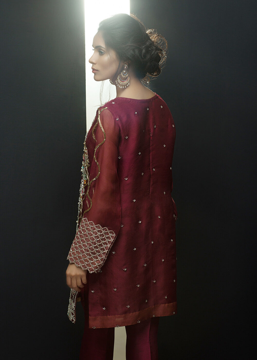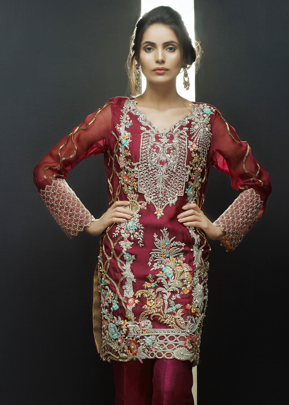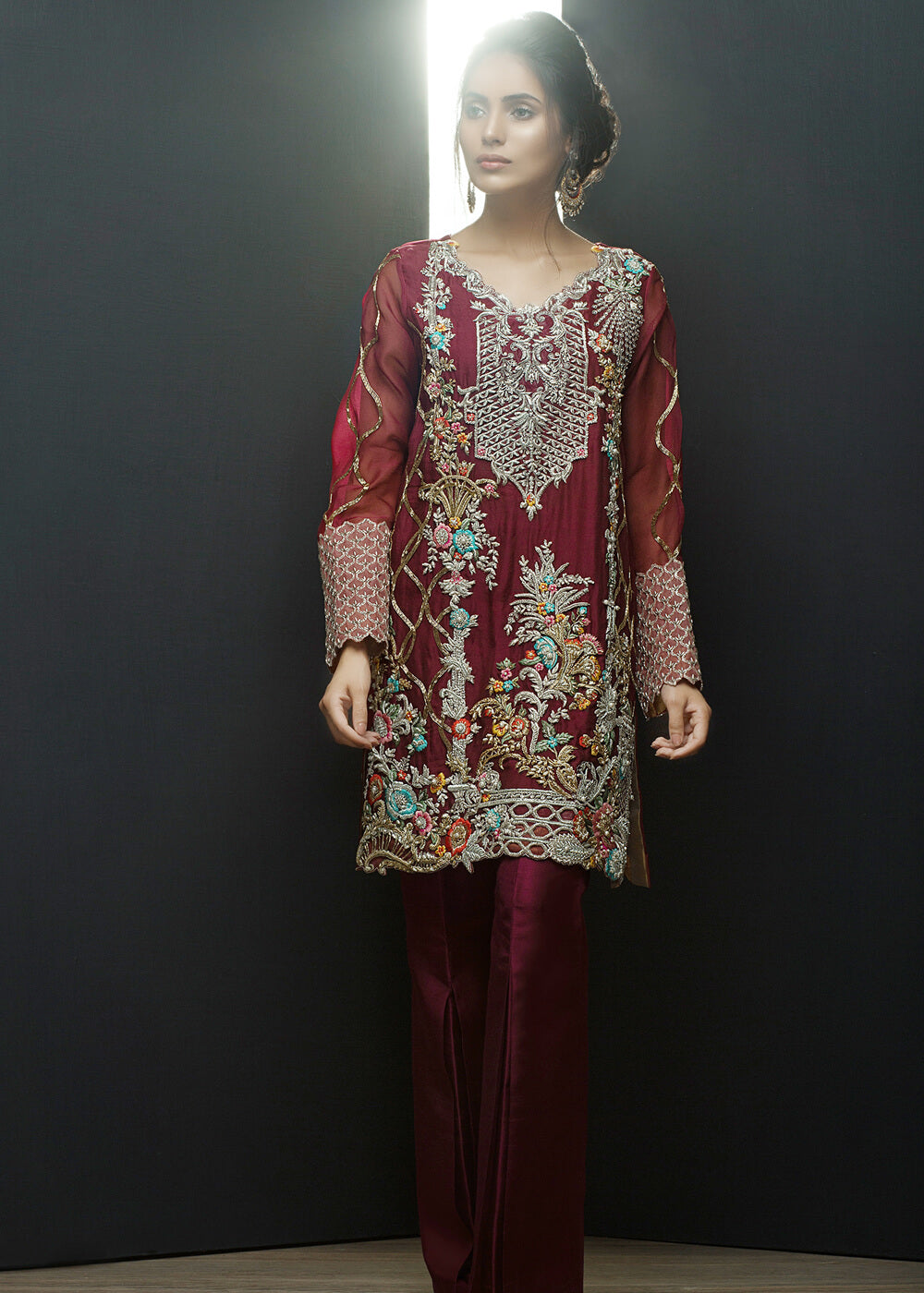 Scarlet Skies is a Maroon full heavily embroidered shirt embellished with kora dabka and resham in silver all over the front. The shirt is adorned with multi-coloured threadwork and is paired with maroon bell bottoms