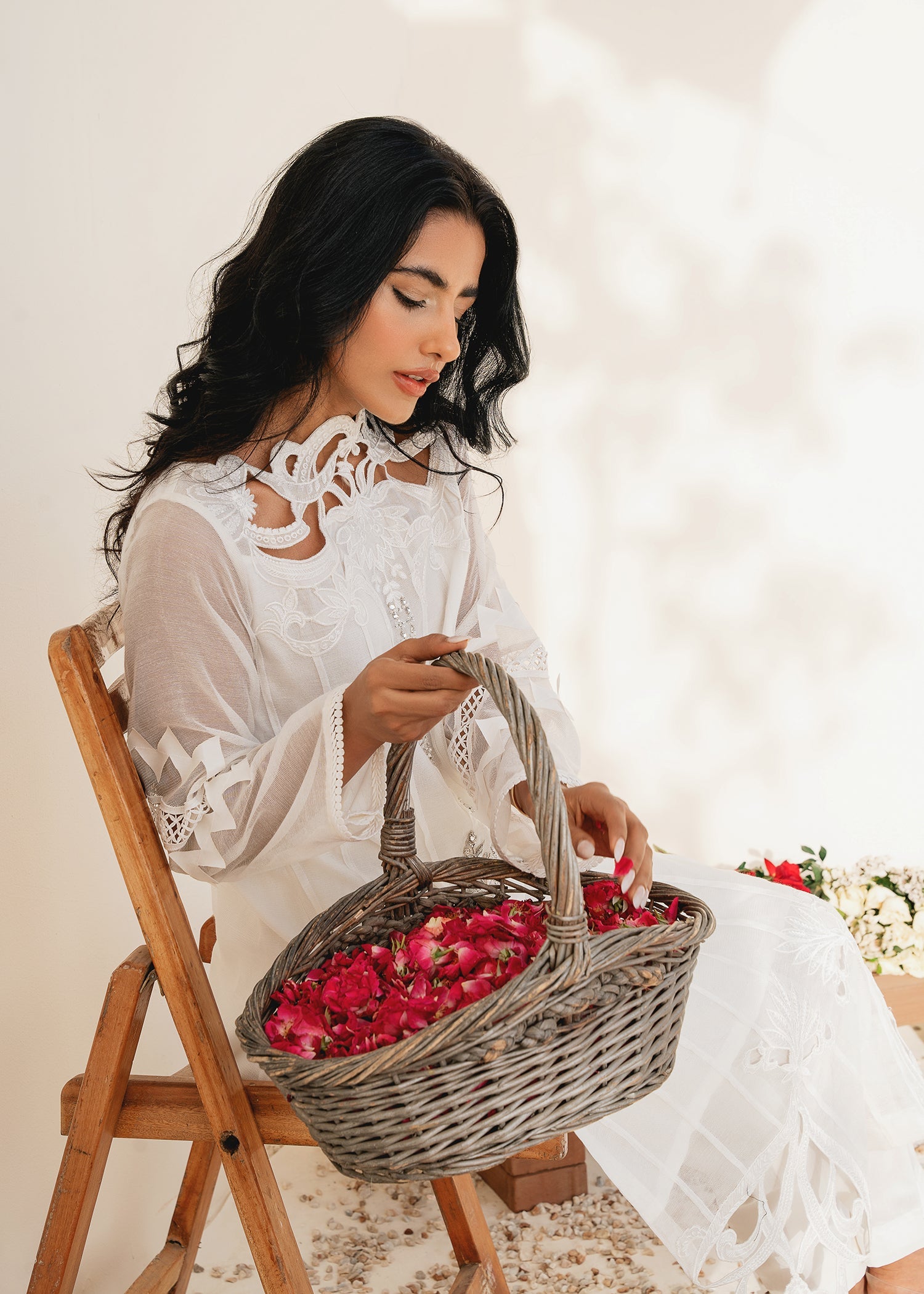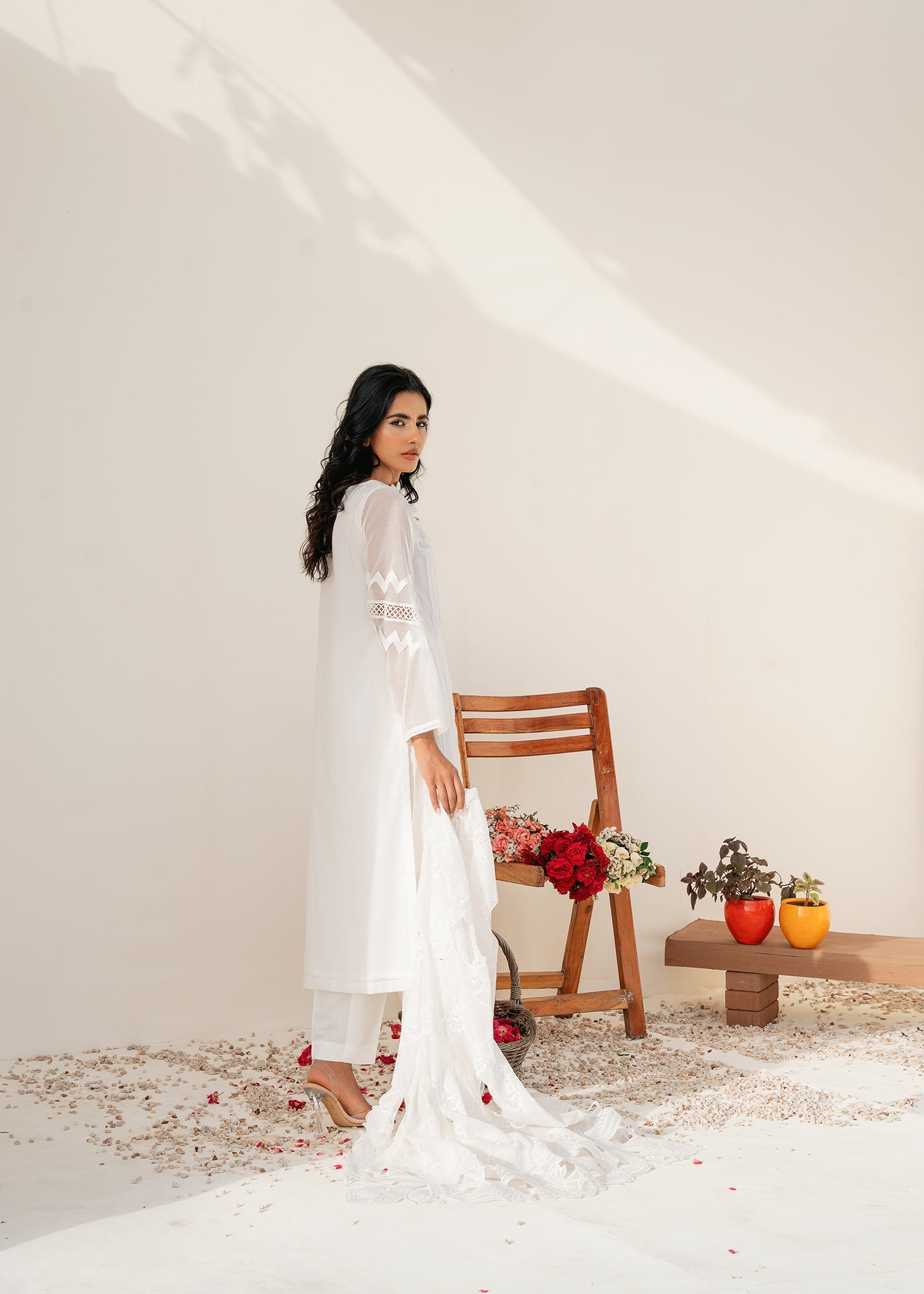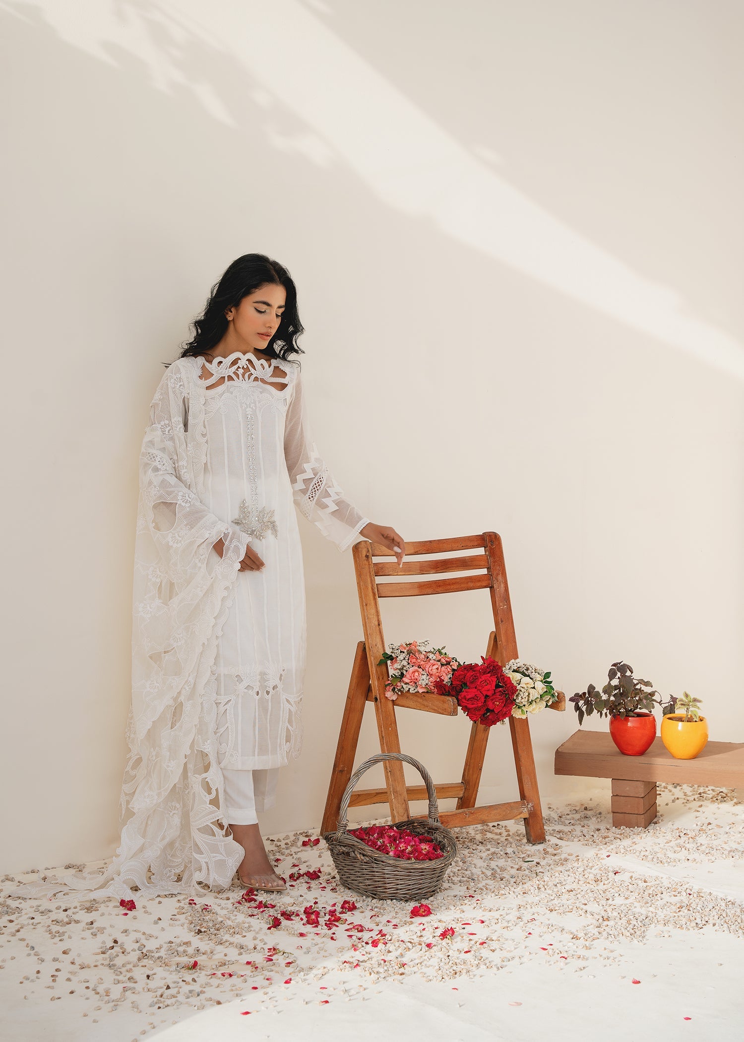 Seemal incorporates lightweight and breathable cotton net fabric. The white color adds a touch of purity and sophistication to the outfit, making it suitable for various occasions. The hand embroidery on the neck of the dress is meticulously crafted, thus adding a personalized and artistic touch to the dress, making it unique and eye-catching. The cutwork embroidery at daman adds a sense of texture and dimension to the dress, enhancing its overall aesthetic appeal.