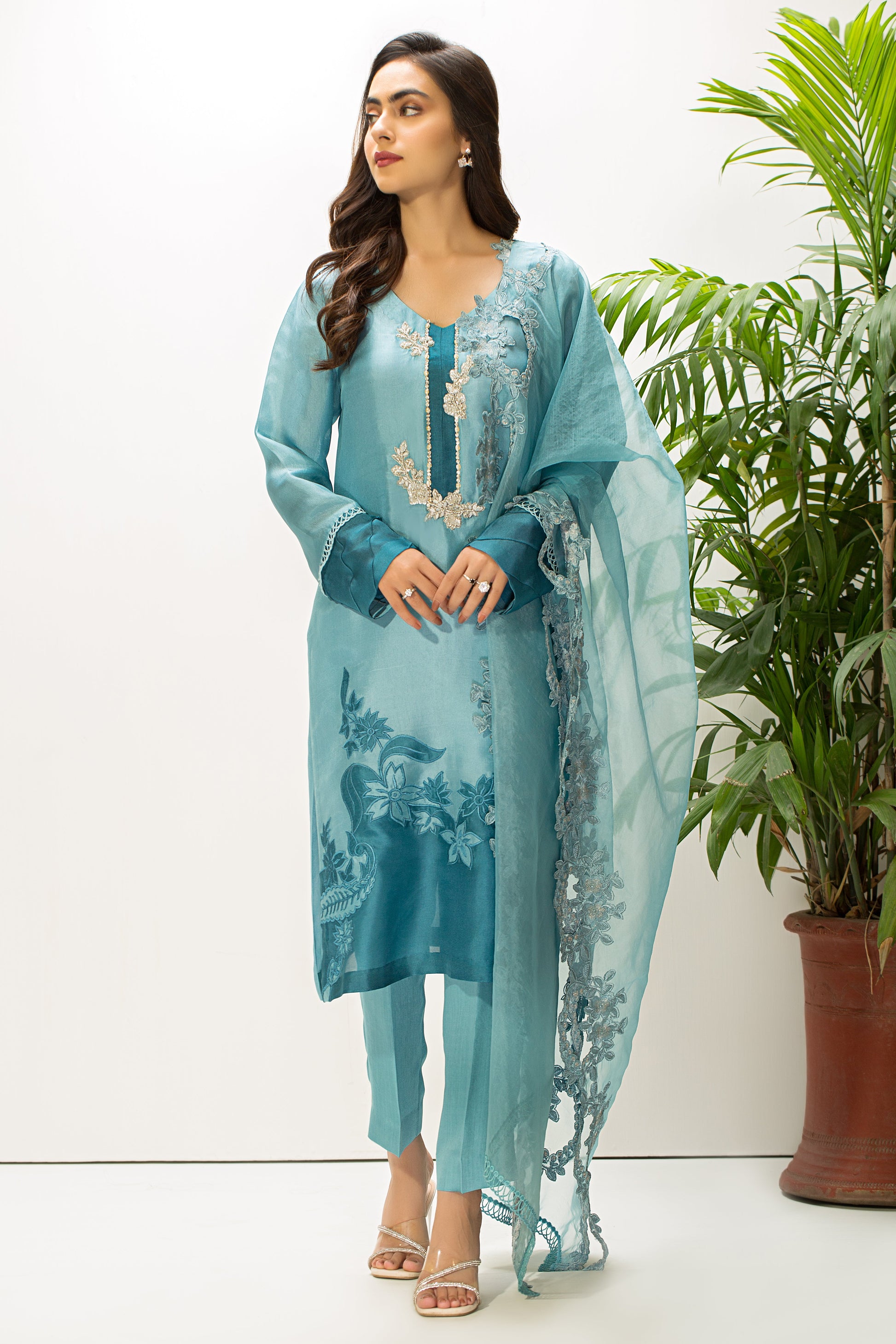 A pure silk net kurta with beautiful contrasting applique floral motifs at daman and hand embroidered neckline elements is the vibrant must-have wardrobe staple. The shirt and dupatta are complemented with straight viscose pants.