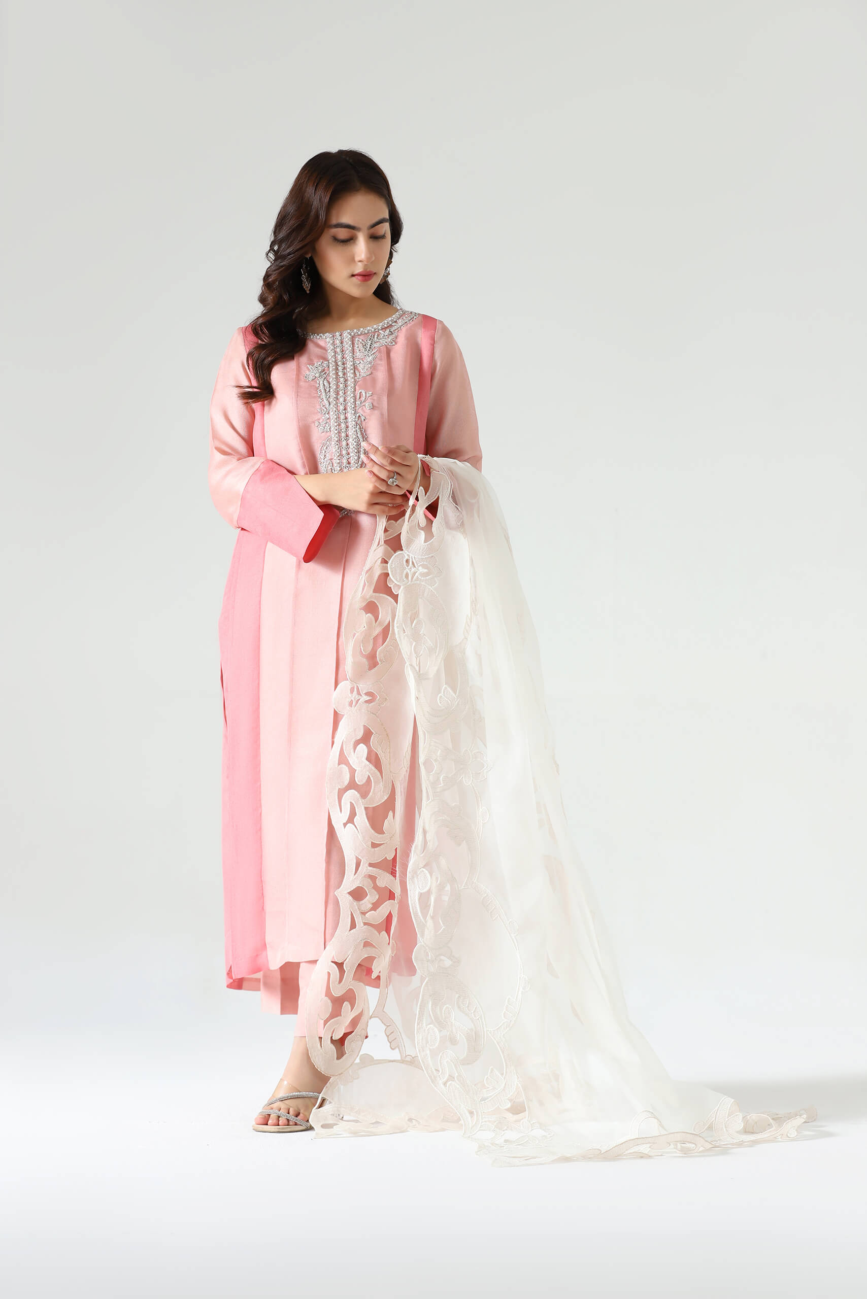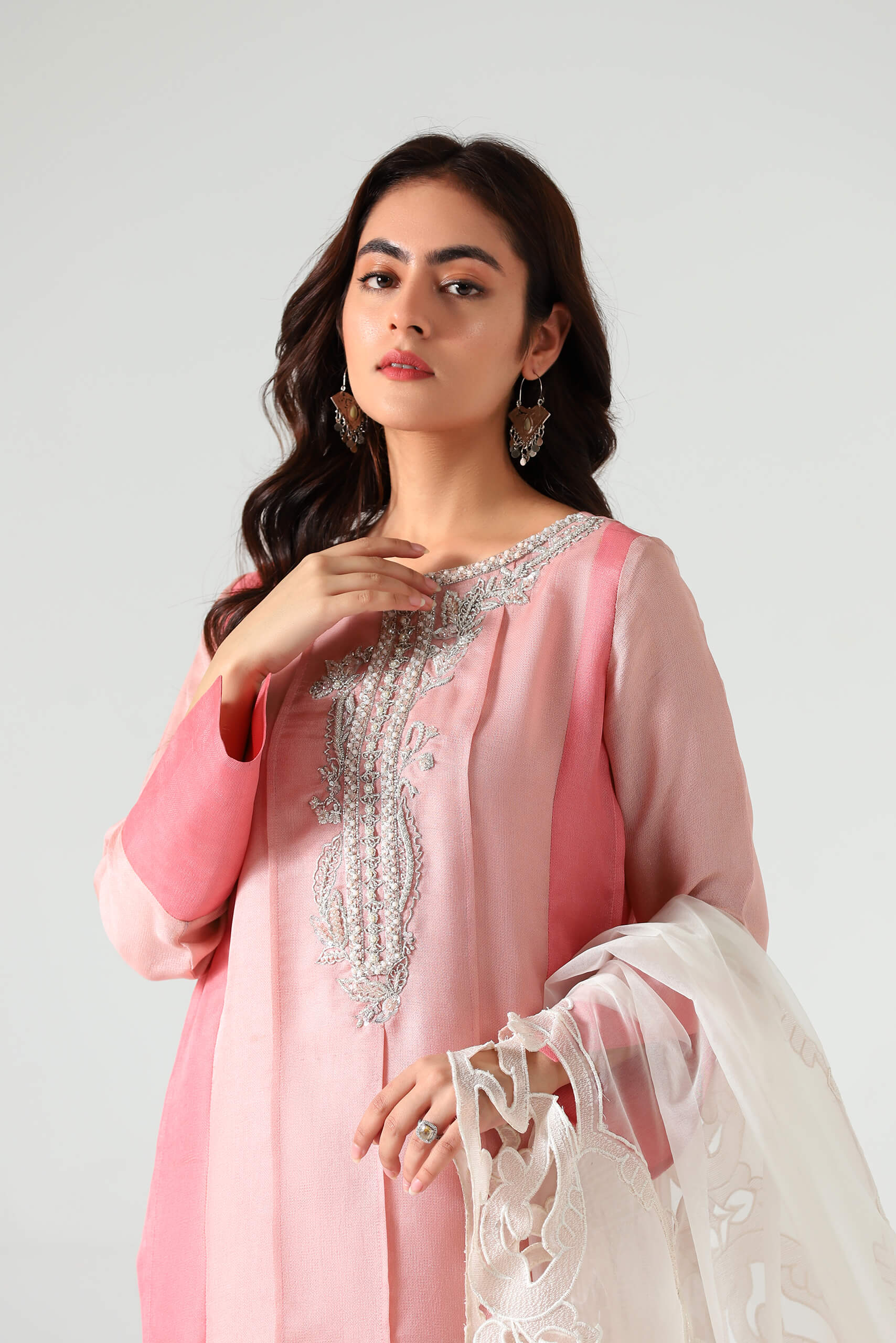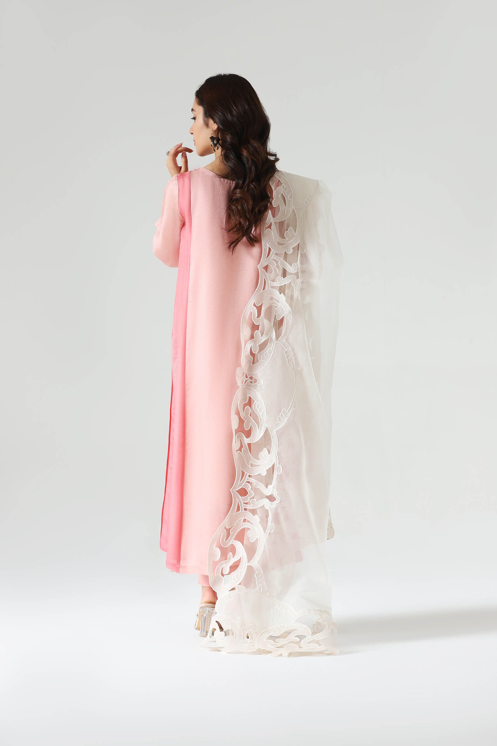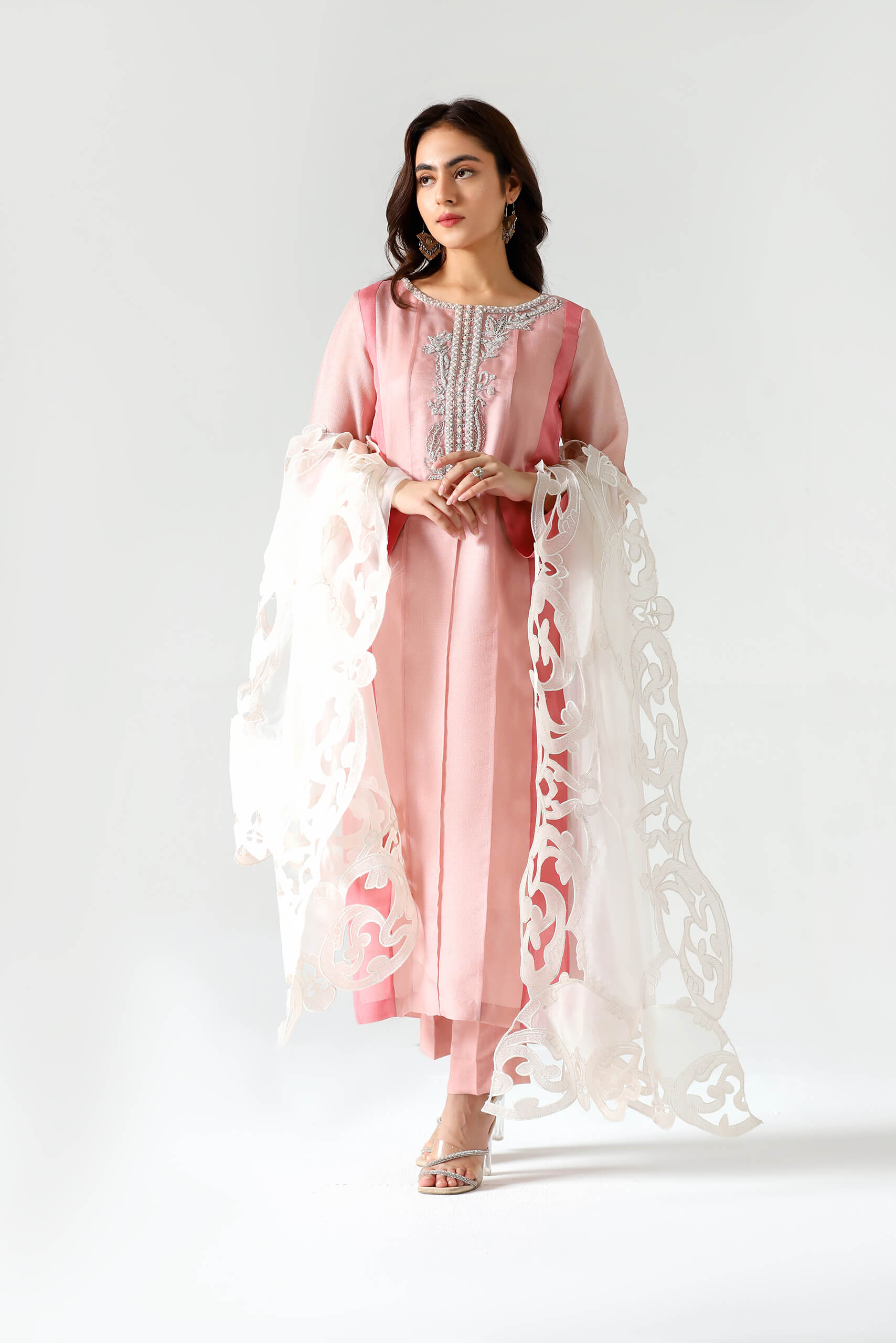 This tea pink colored pure silk net pleated shirt with plain pants is a summer delight. The signature cutwork organza duppata (priced separately) is a beautiful amalgamation of style and comfort for a eastern woman.