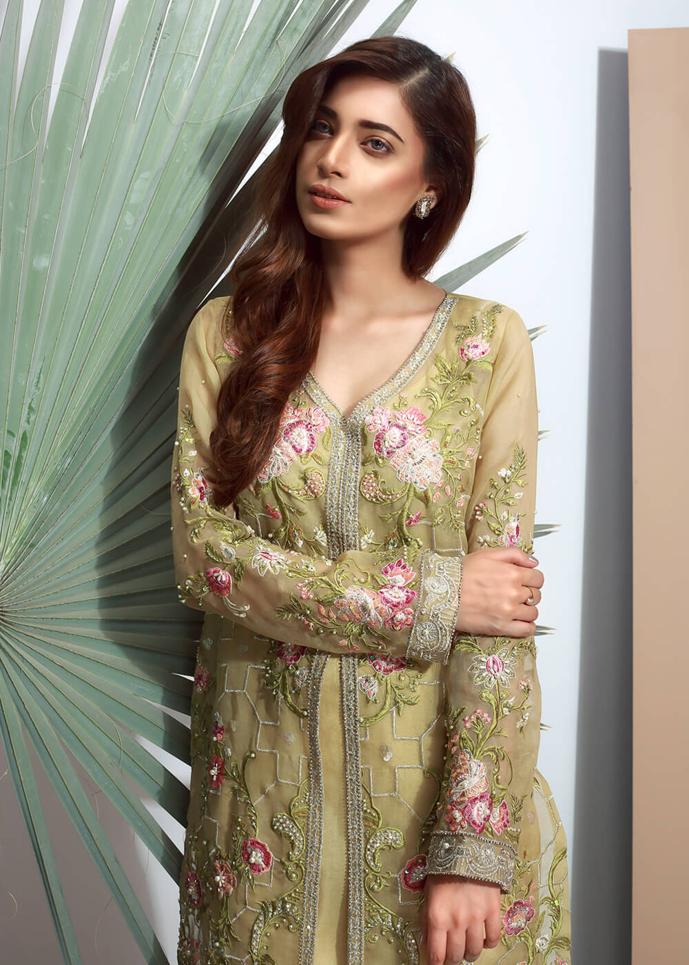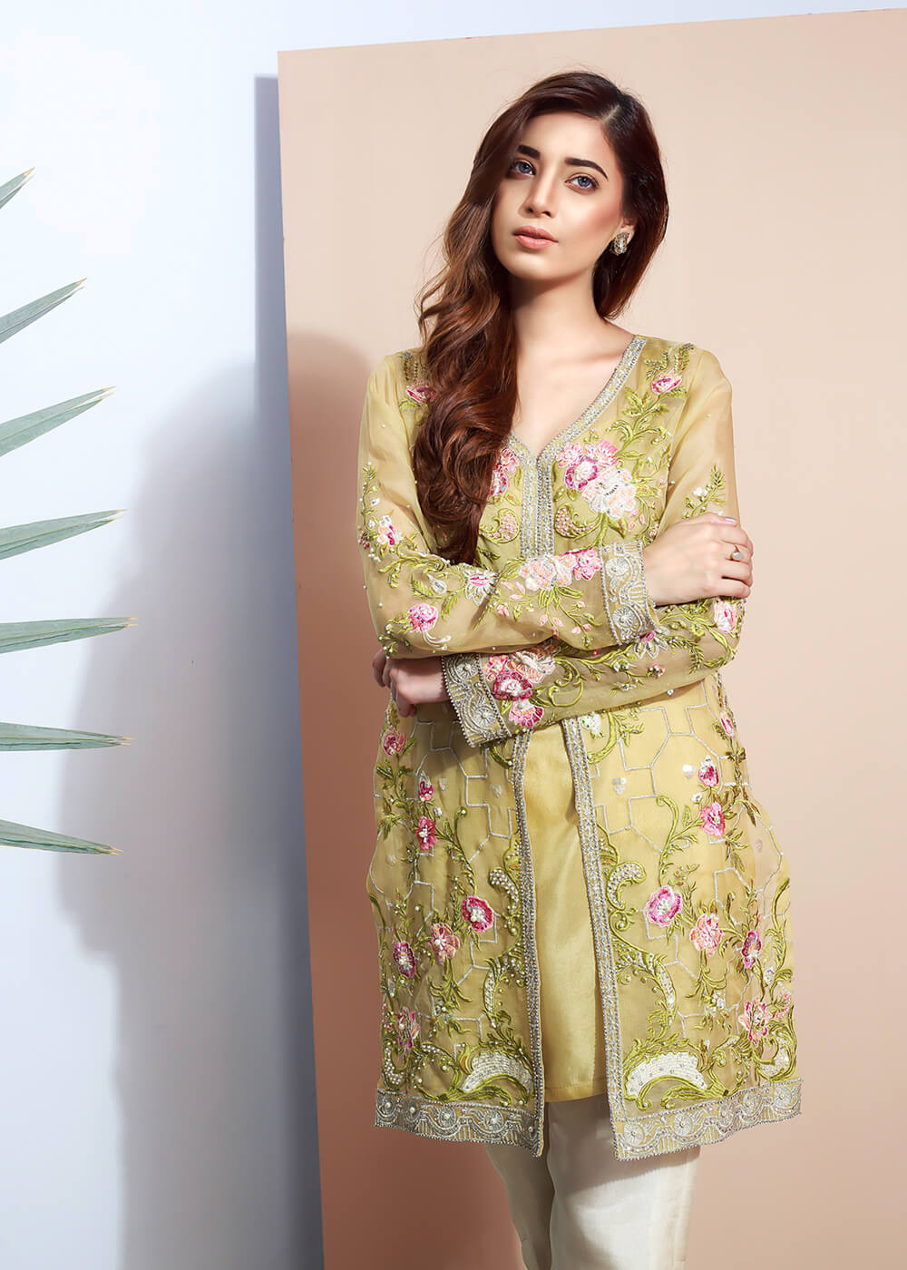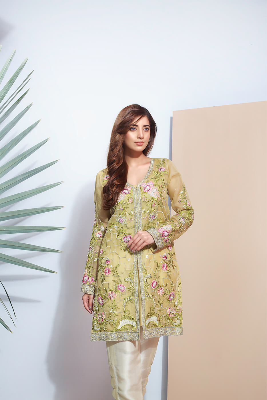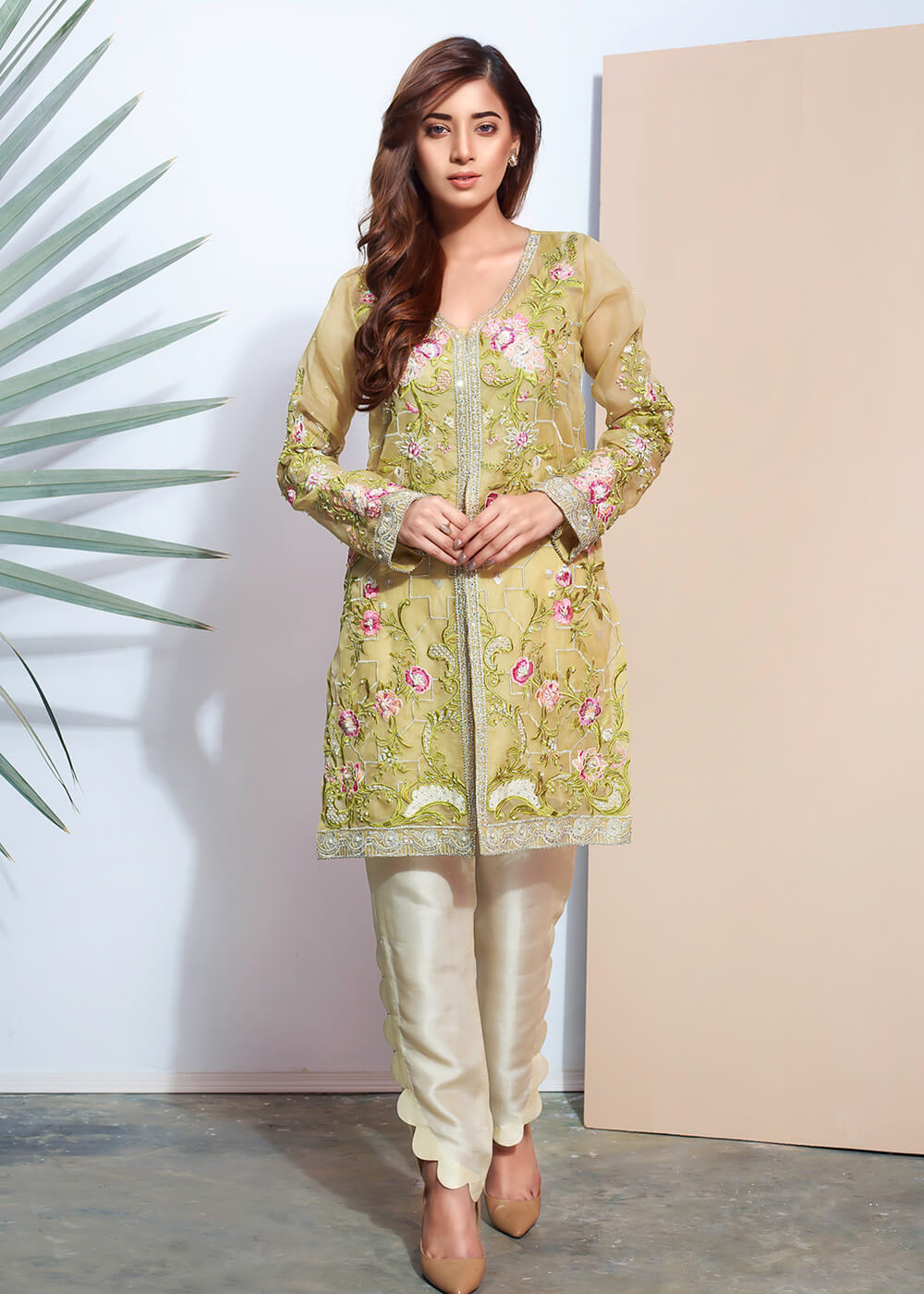 Make everyone skip their heartbeat by wearing this heavily embroidered lime yellow organza shirt. This shirt is exquisitely detailed with crystals, pearls and sequins.