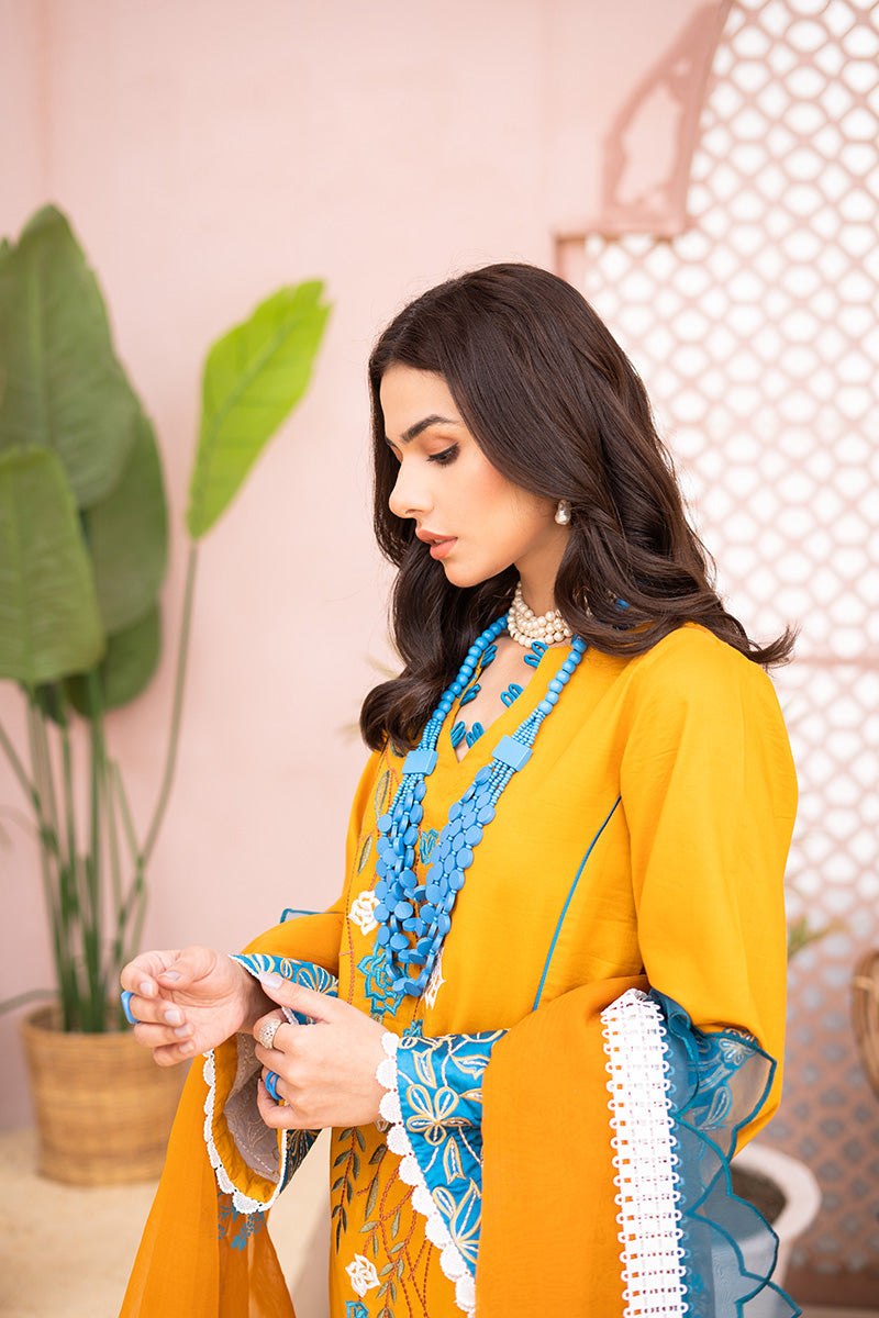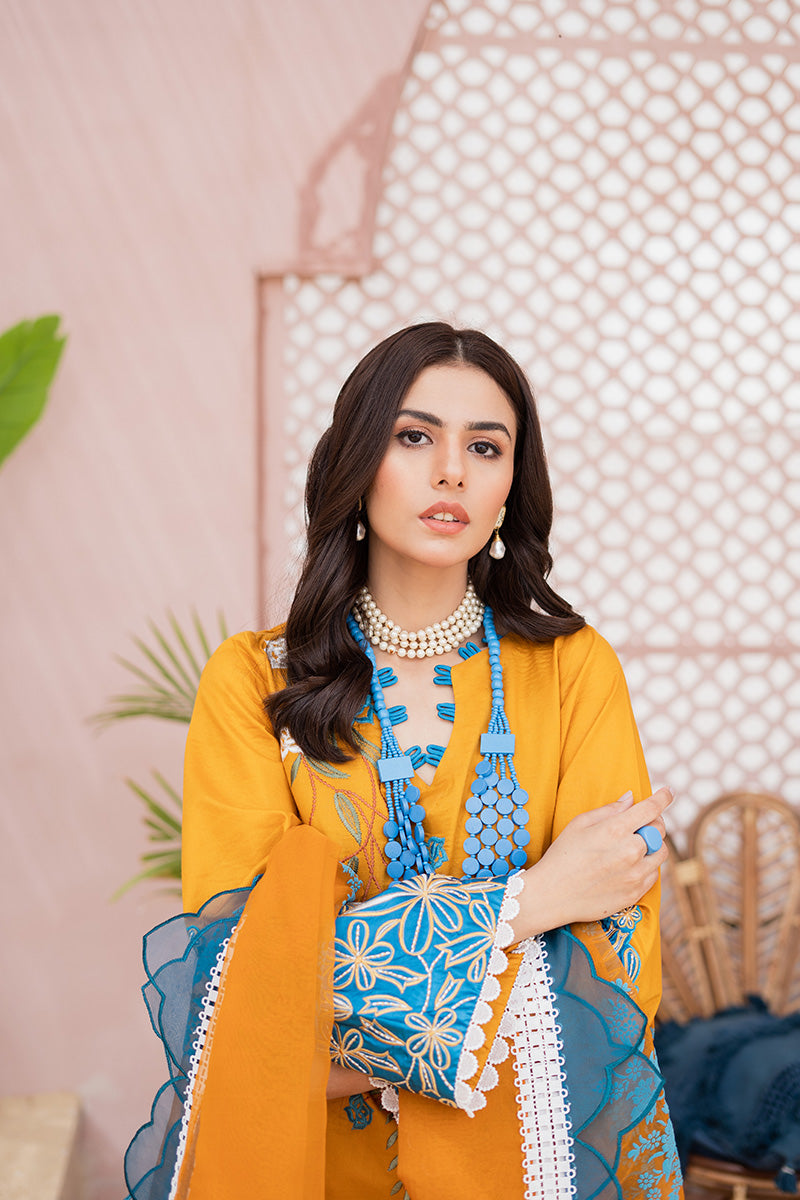 Carnation- the dress that radiates pure joy! This Mustard shirt is not for the faint of heart, with its bold color and intricate embroidery on the sleeves and all over the shirt that will make you stand out in a crowd. Paired with lawn trousers and an embroidered organza dupatta, this outfit is perfect for any occasion that calls for a little bit of extra pizzazz.