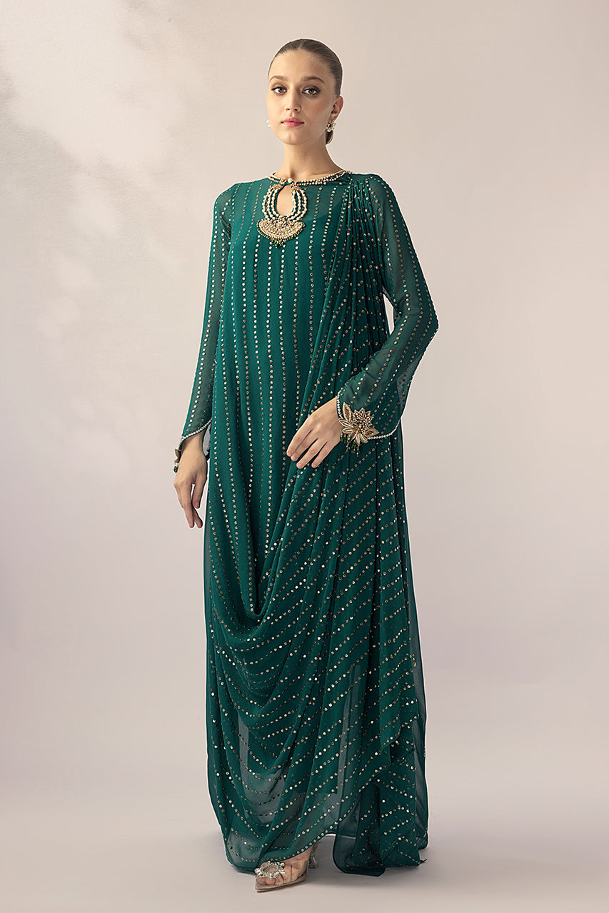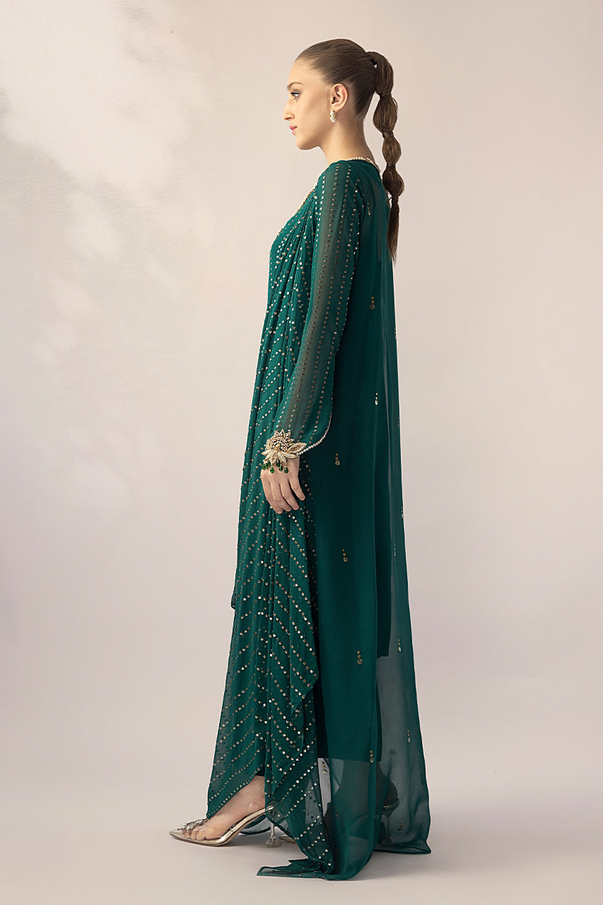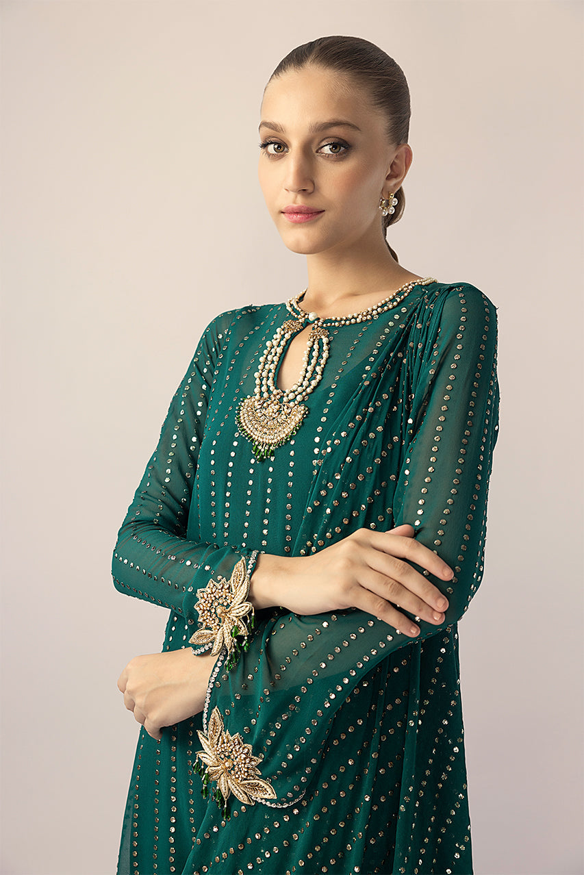 An emerald georgette long shirt with a draped dupatta is handworked with delicate kamdani. The sleeves and neckline are detailed with jewelled floral motifs. An elegant ensemble for any formal event or soiree.