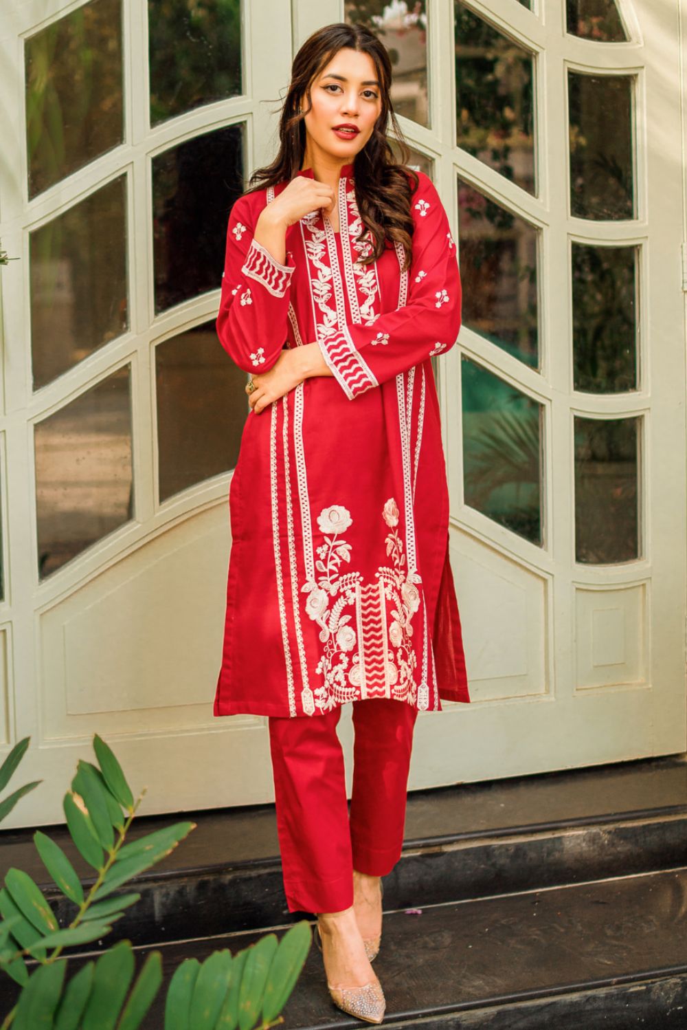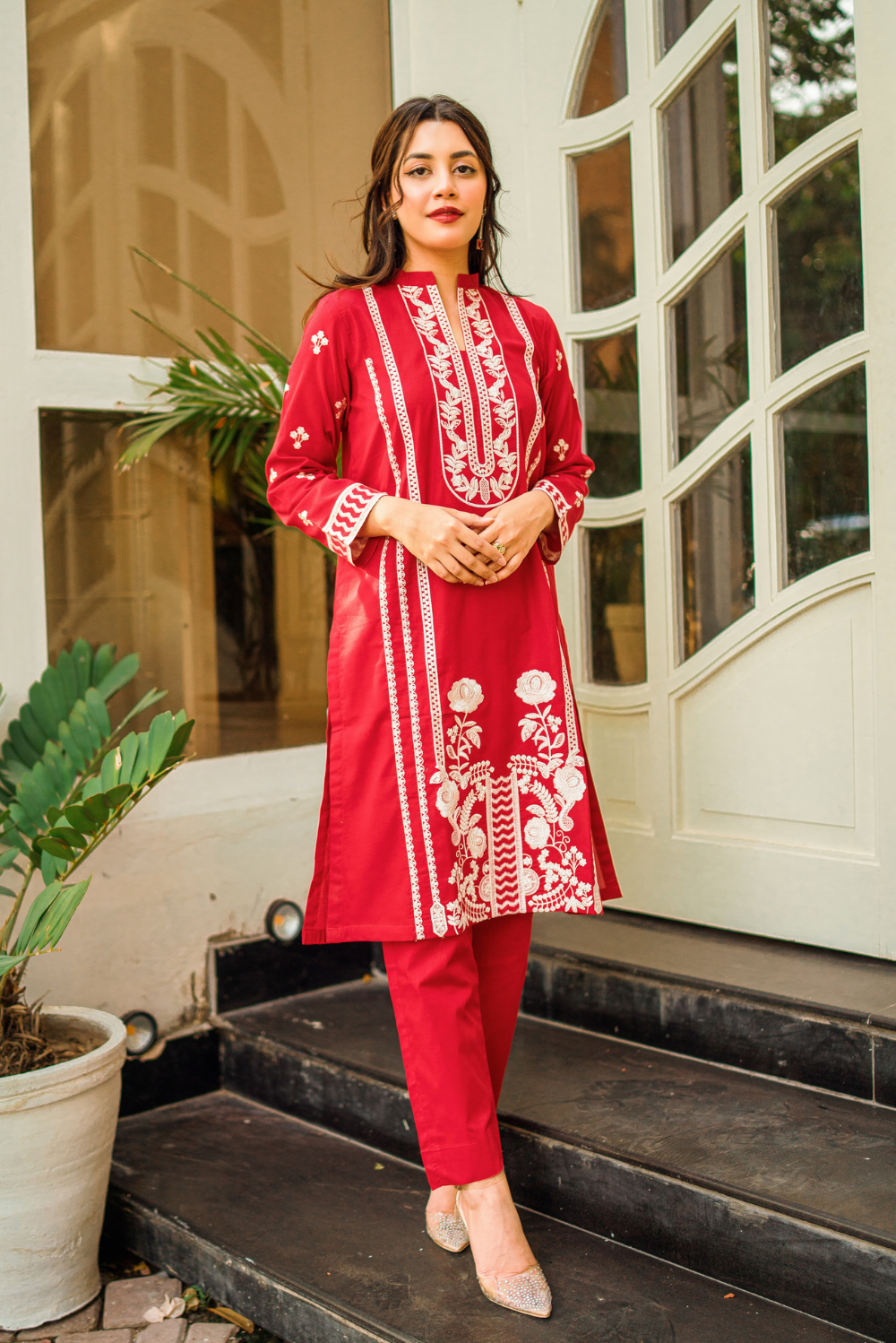 2 piece suit ready-to-wear dobby lawn suit with white embroidery details on red shirt neckline, border front and sleeves paired with plain straight trousers.