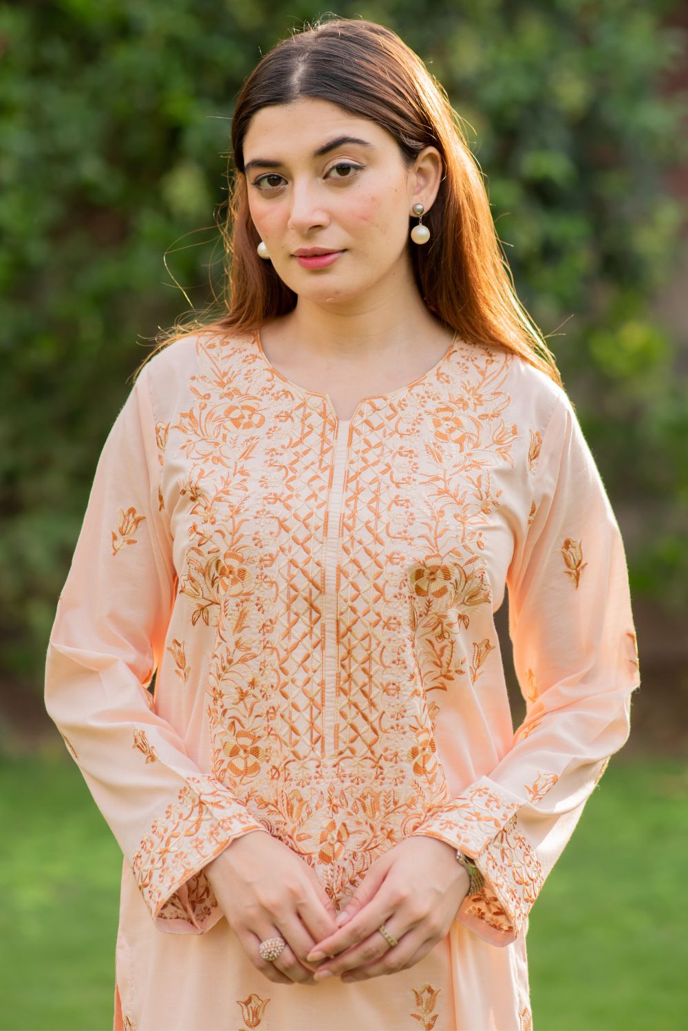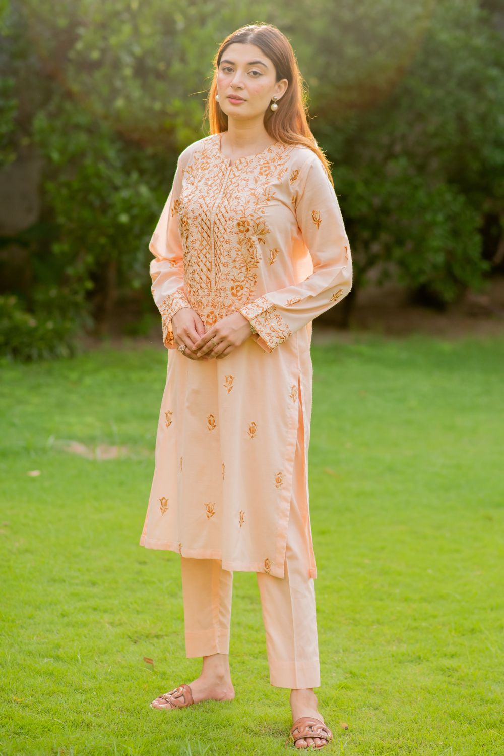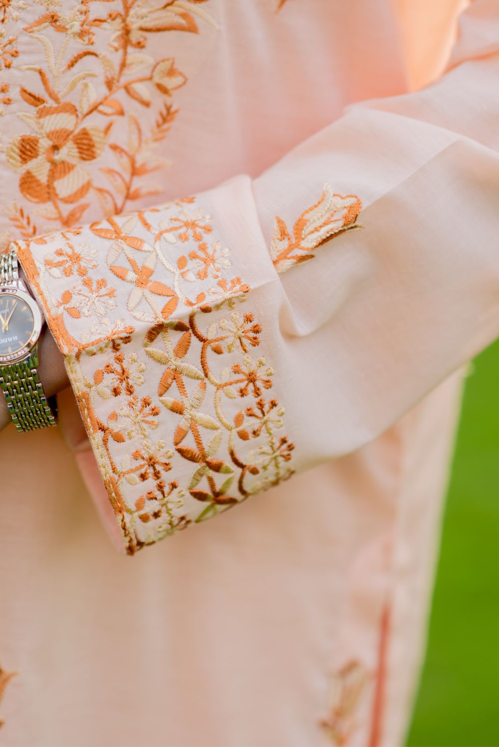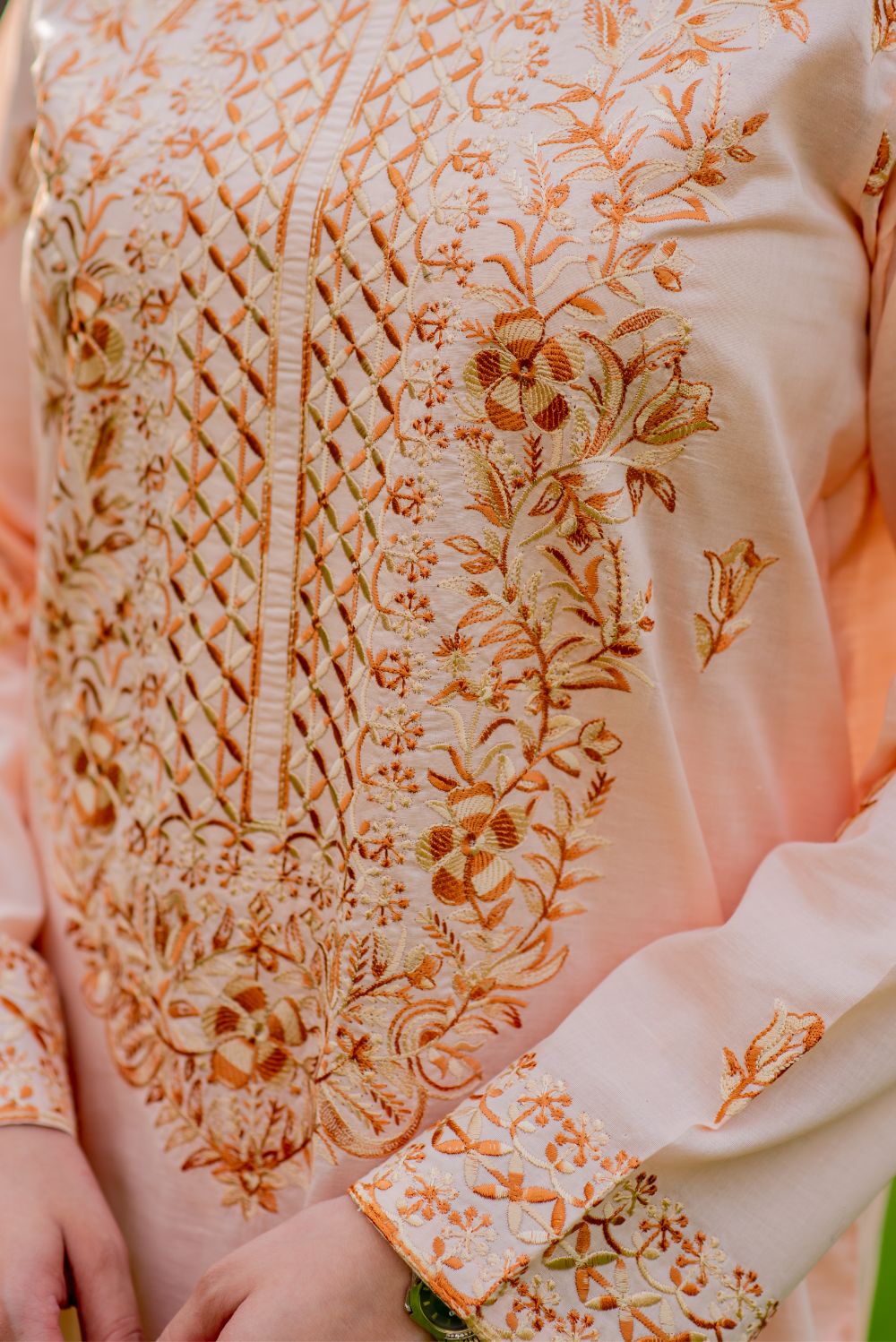 A pastel rose hue, ready-to-wear two-piece suit with contrasting embroidery on the neck, shirt front, and sleeves, accompanied by matching straight trousers.