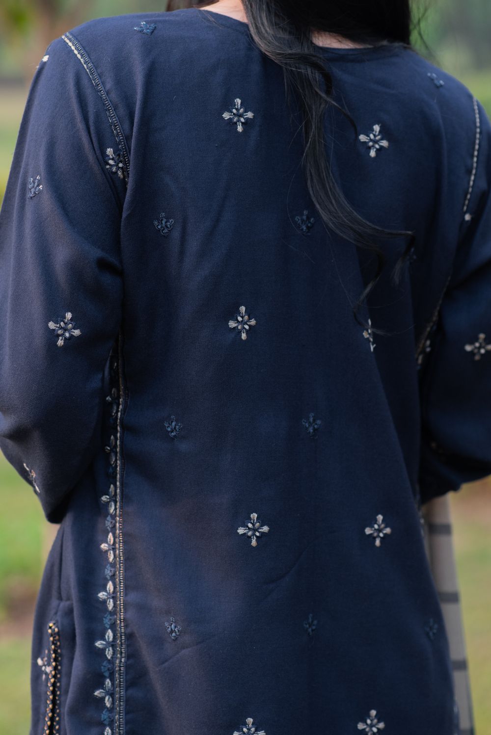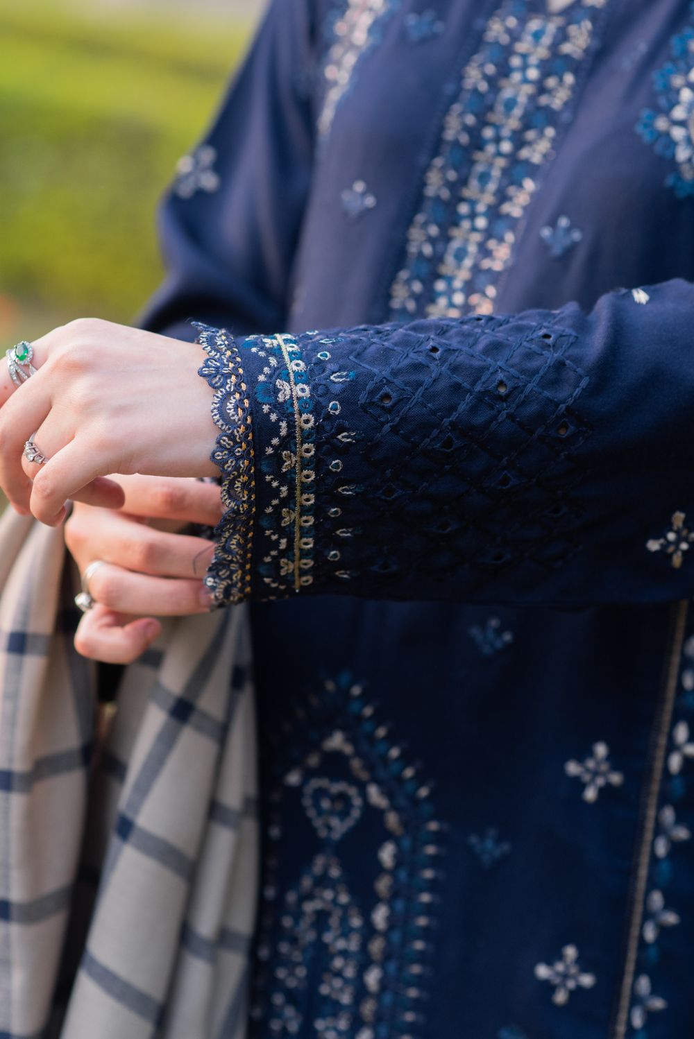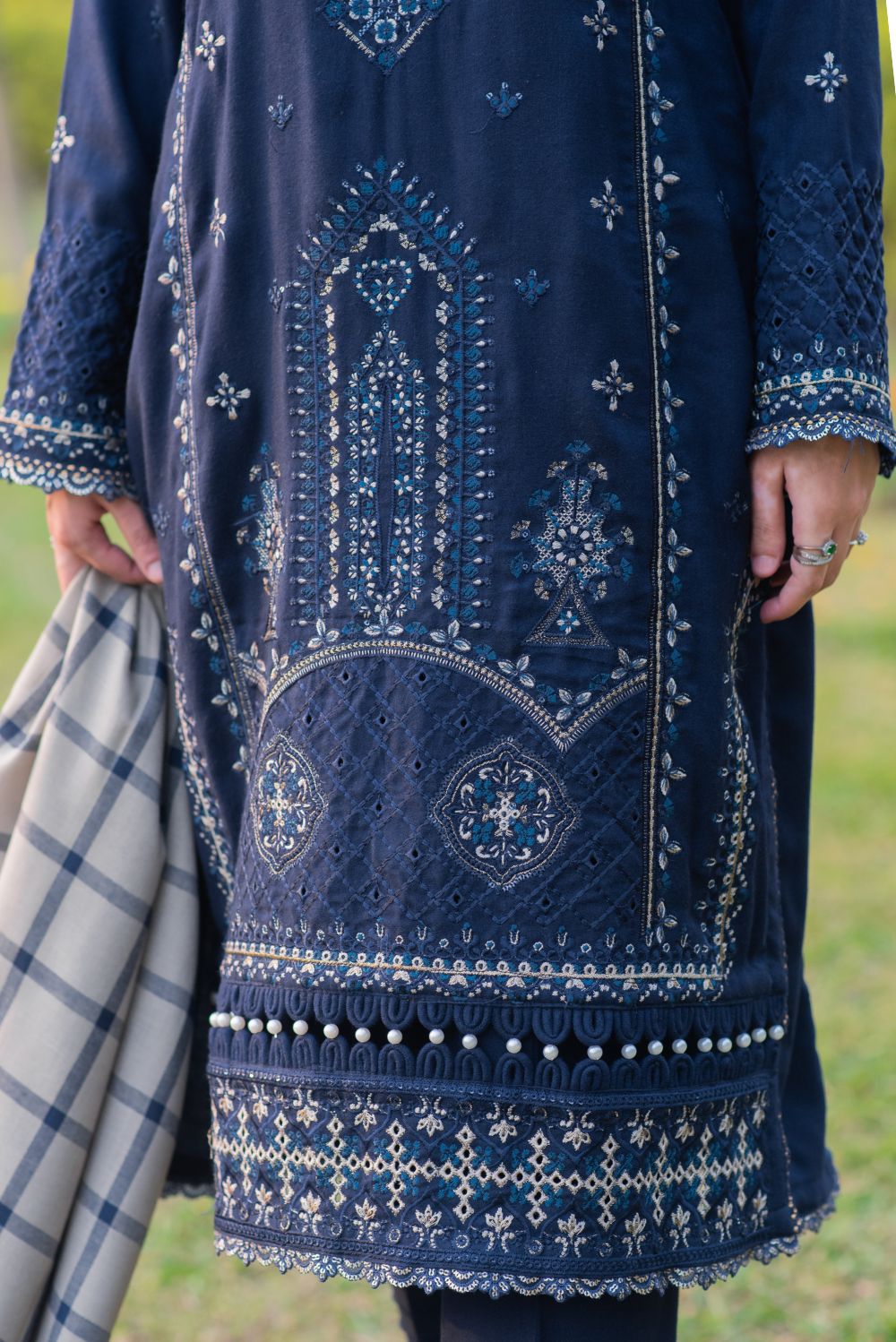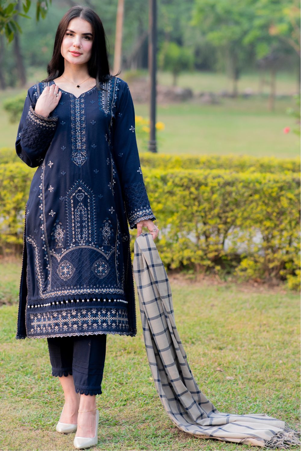 Three-piece unstitched suit featuring royal blue shirt adorned with all-over embroidery on shirt front and sleeves, paired with matching trousers fabric, and complemented by a contrasting printed shawl.