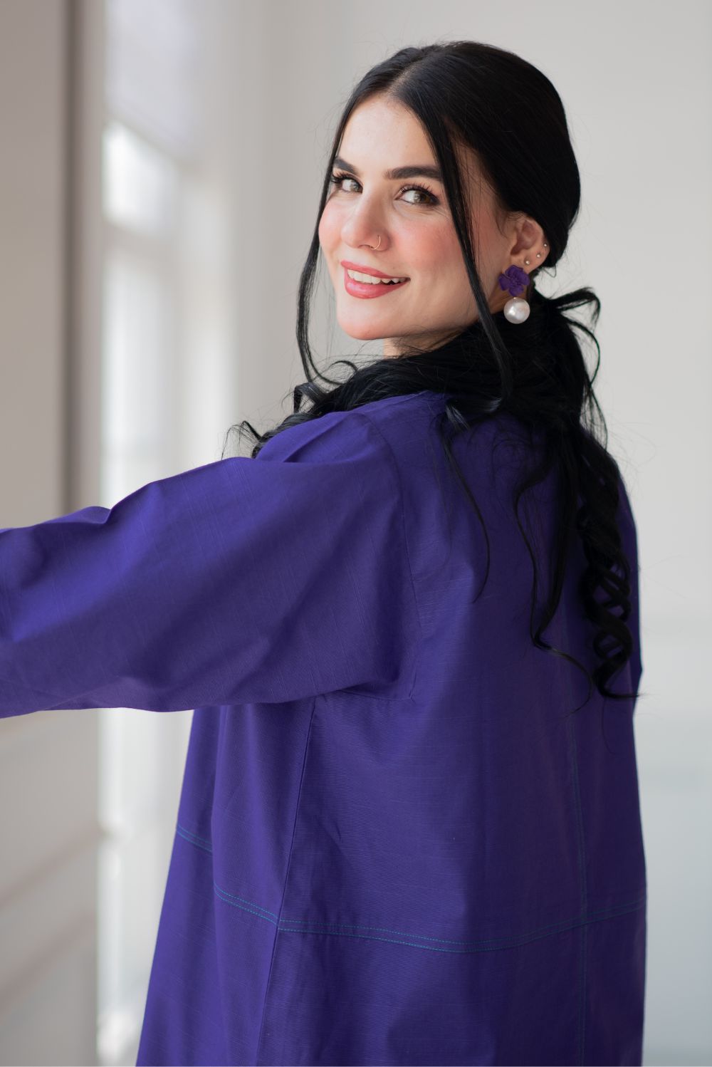 Embrace the serenity of twilight with our dusk blue matching separates set, a graceful and versatile full-length shirt with buttons on the shirt front, paired with matching trousers.