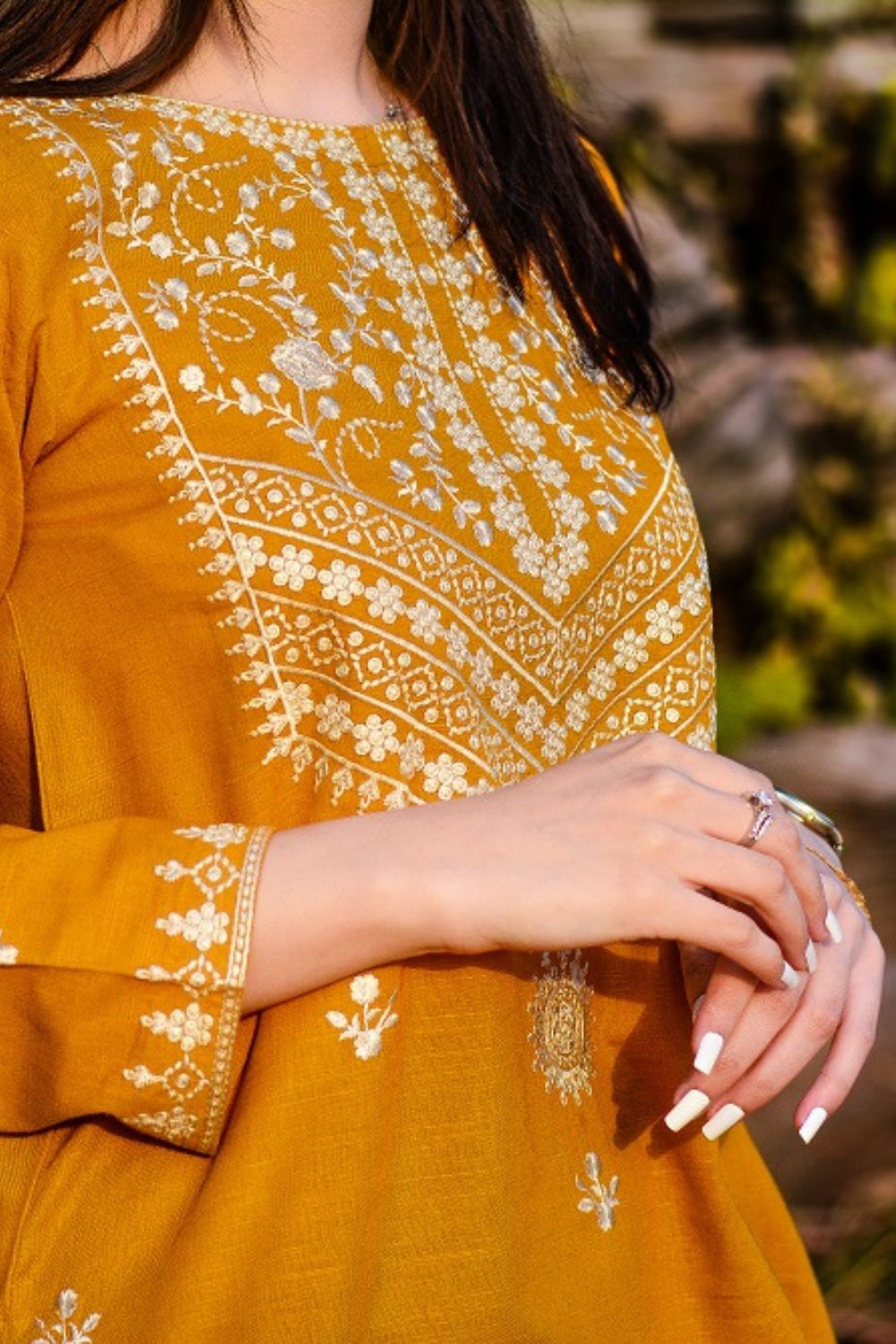 A Mustardy Yellow colour article with ivory-coloured embroidery on the neckline and sleeves.