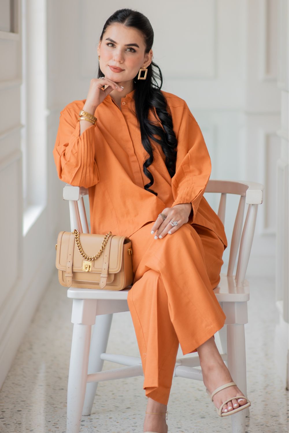 Elevate your look with our vibrant orange co-ord set - a trendy ensemble featuring a button-down shirt with collar and cuff details.