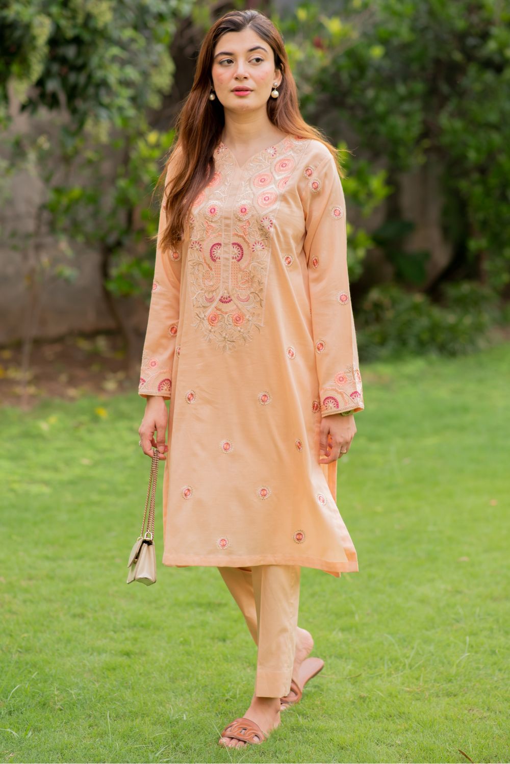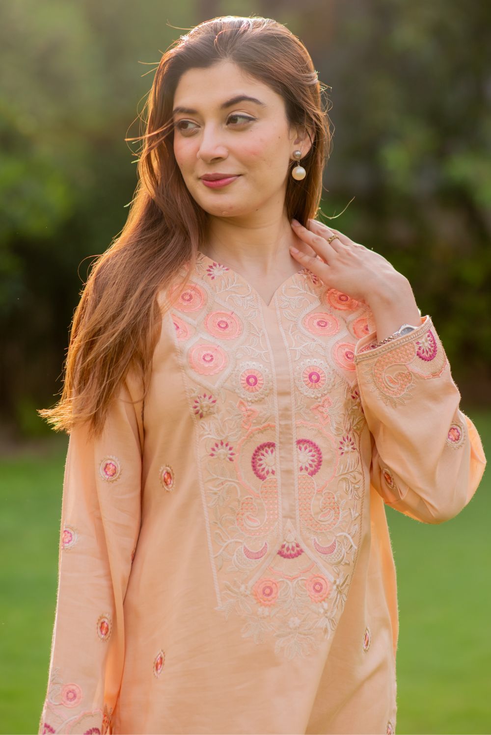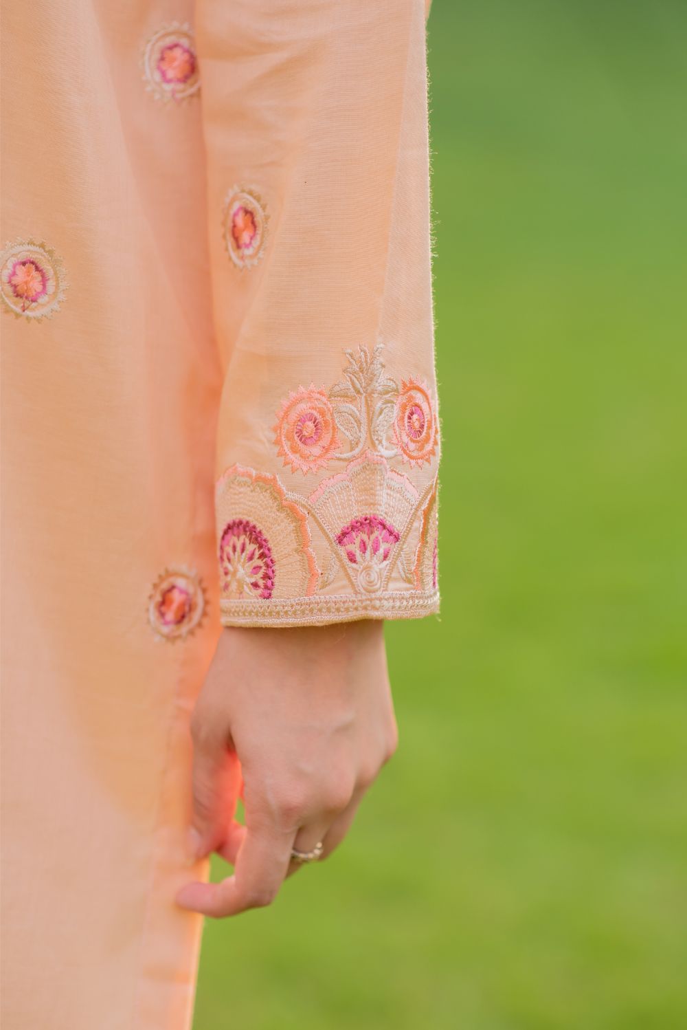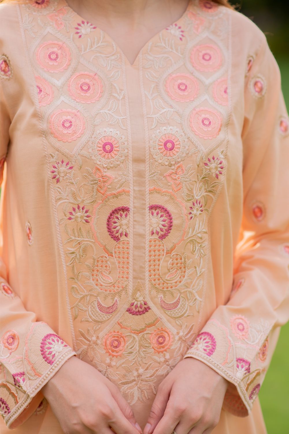 Peachy cashmere shade ready-to-wear, two-piece summer dress with multi-coloured embroidery on shirt front and sleeves, paired with matching straight trousers.