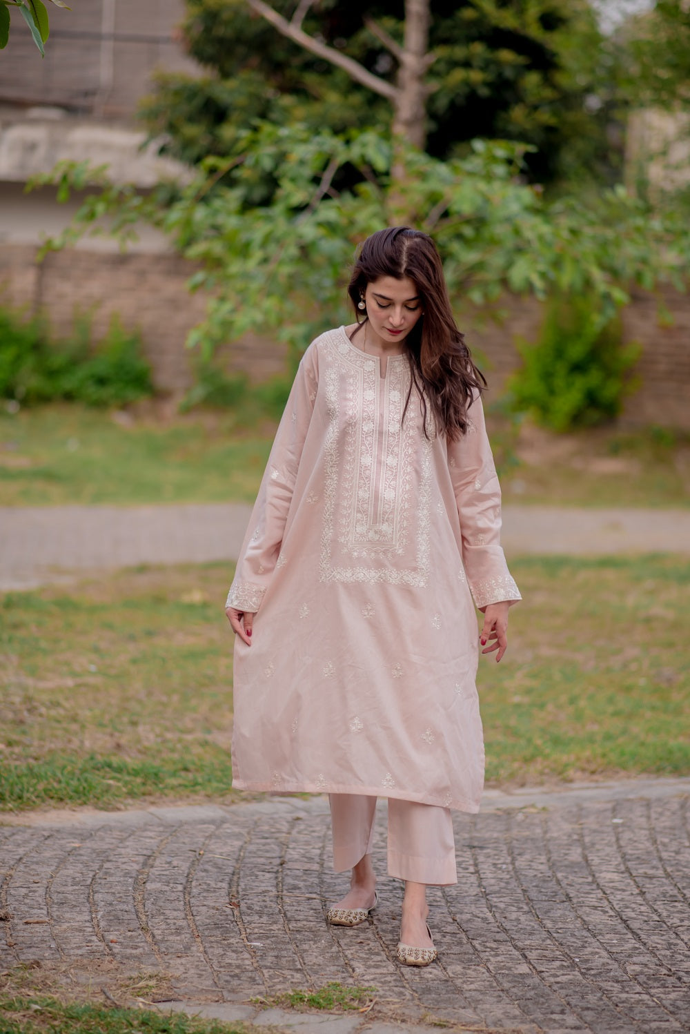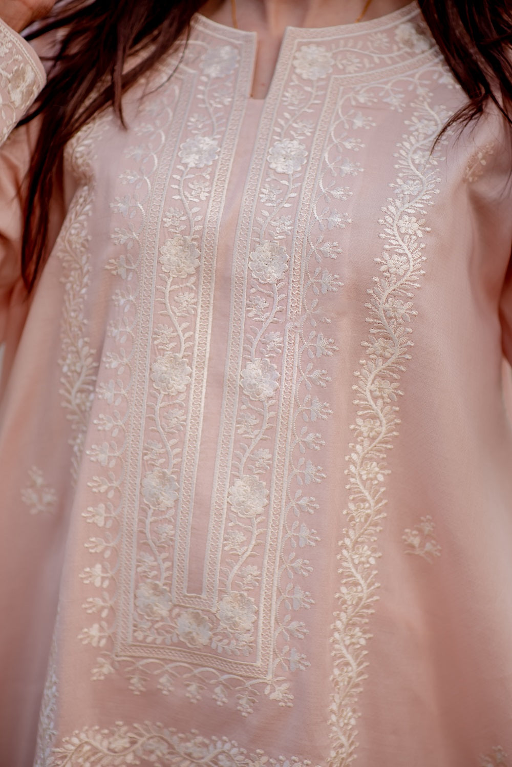This subtle baby pink in a light tone is ready to wear, a 2-piece suit with ivory-coloured embroidery encompassing a huge neckline and motif all over the front panel, this ensemble gives a fresh feel.