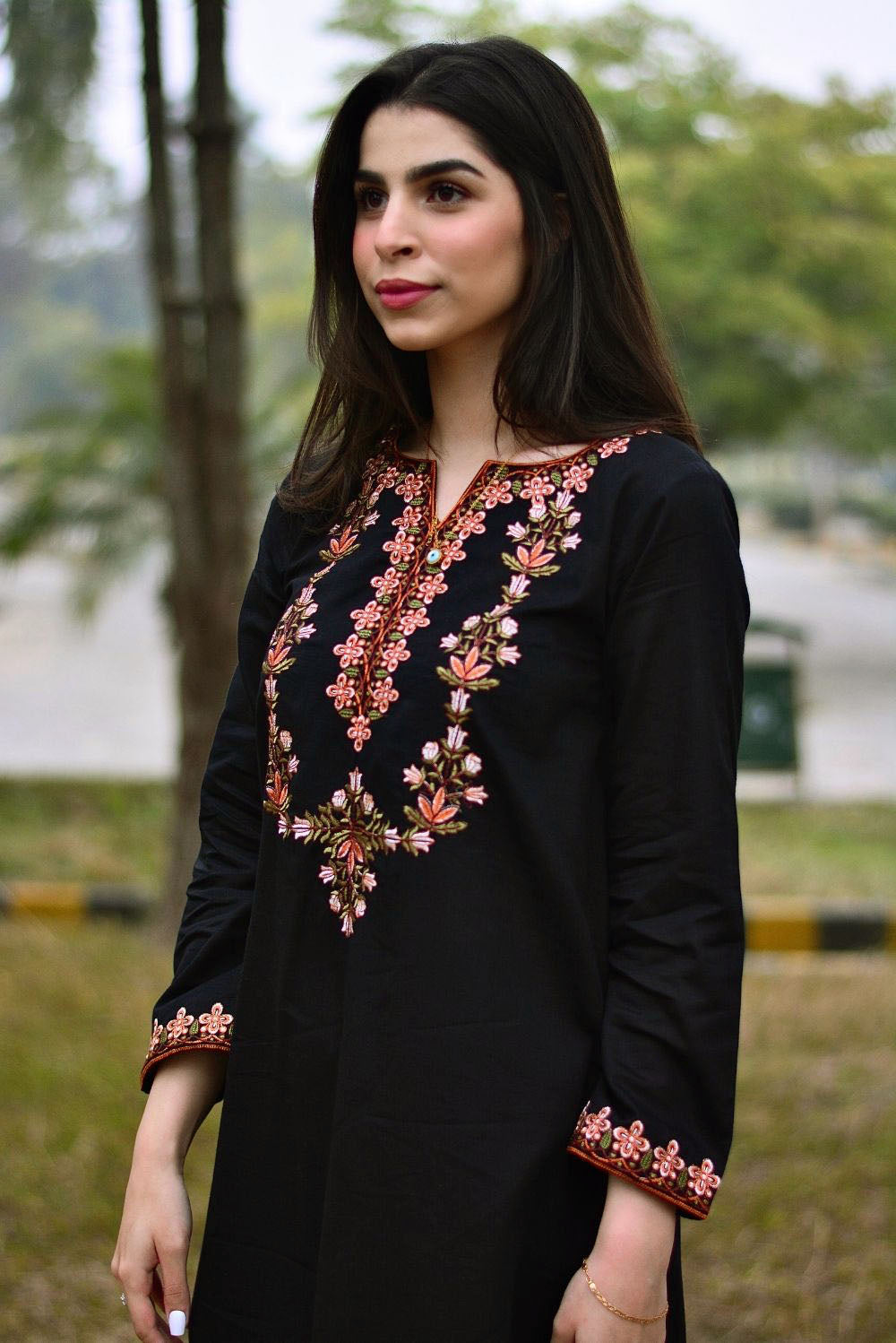 A Black coloured beautiful outfit with contrasted floral embroidery on sleeves and neckline.