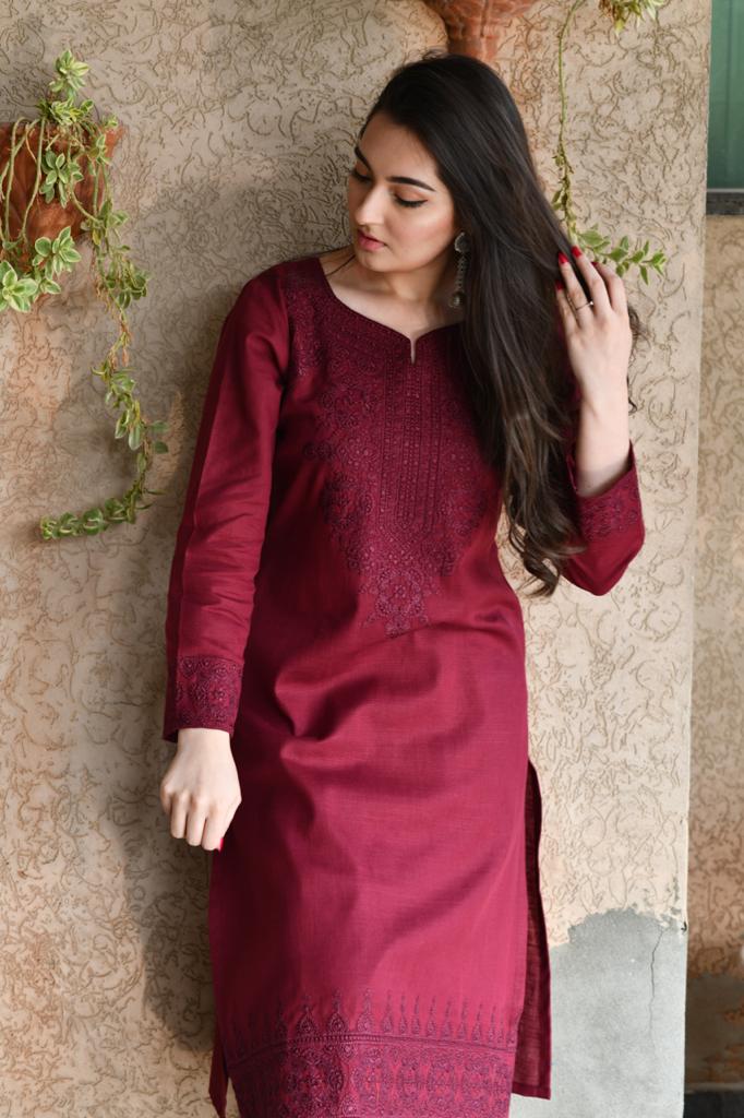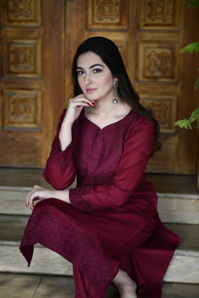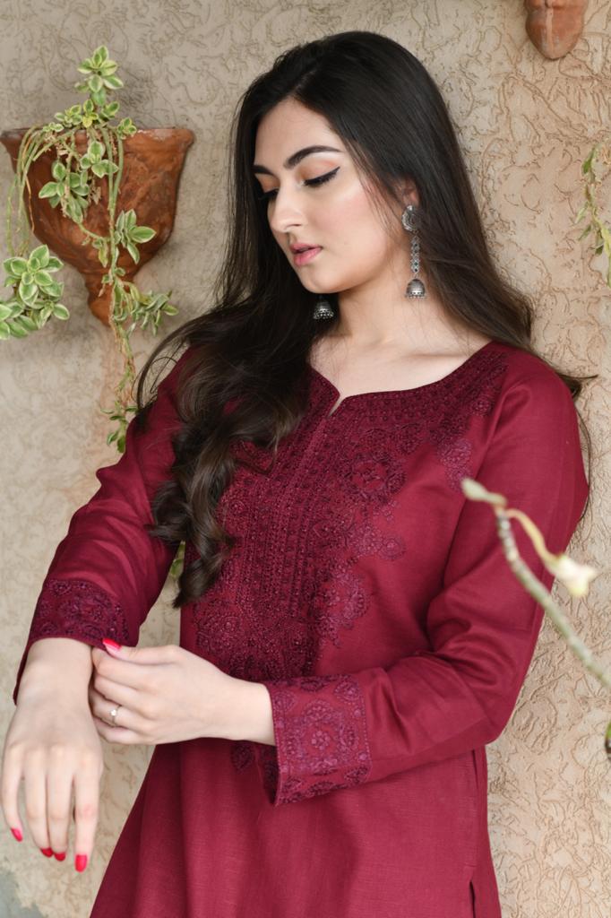 “Lyab”, is a beautiful maroon embroidered, two-piece suit stitched article, oozing comfort and elegance.