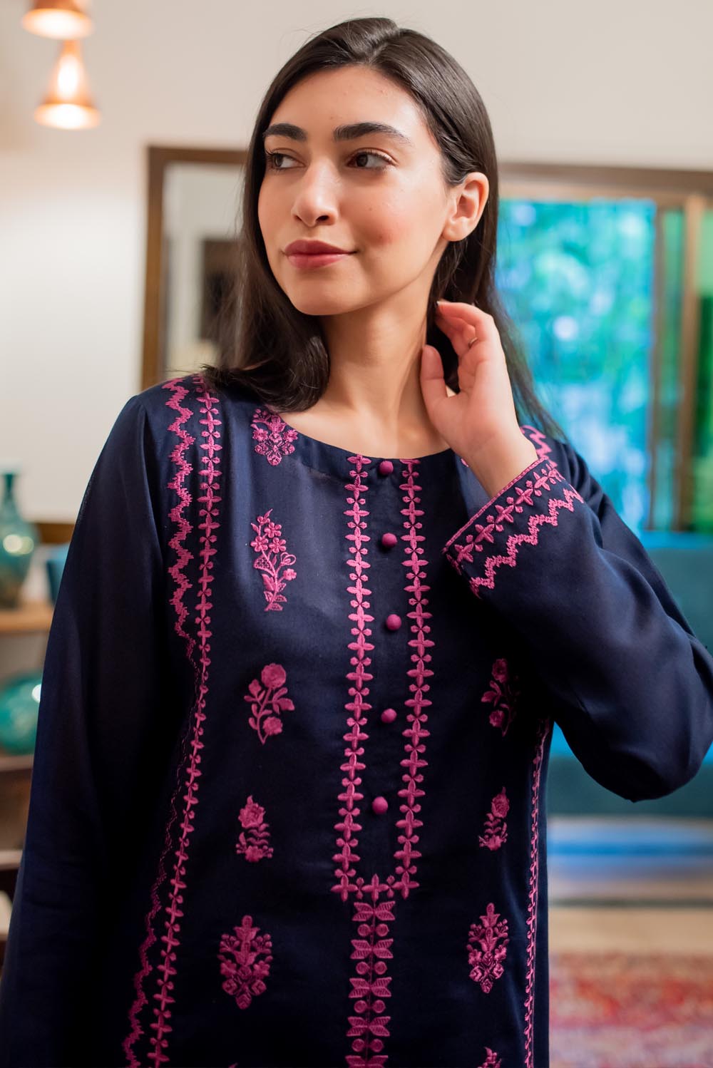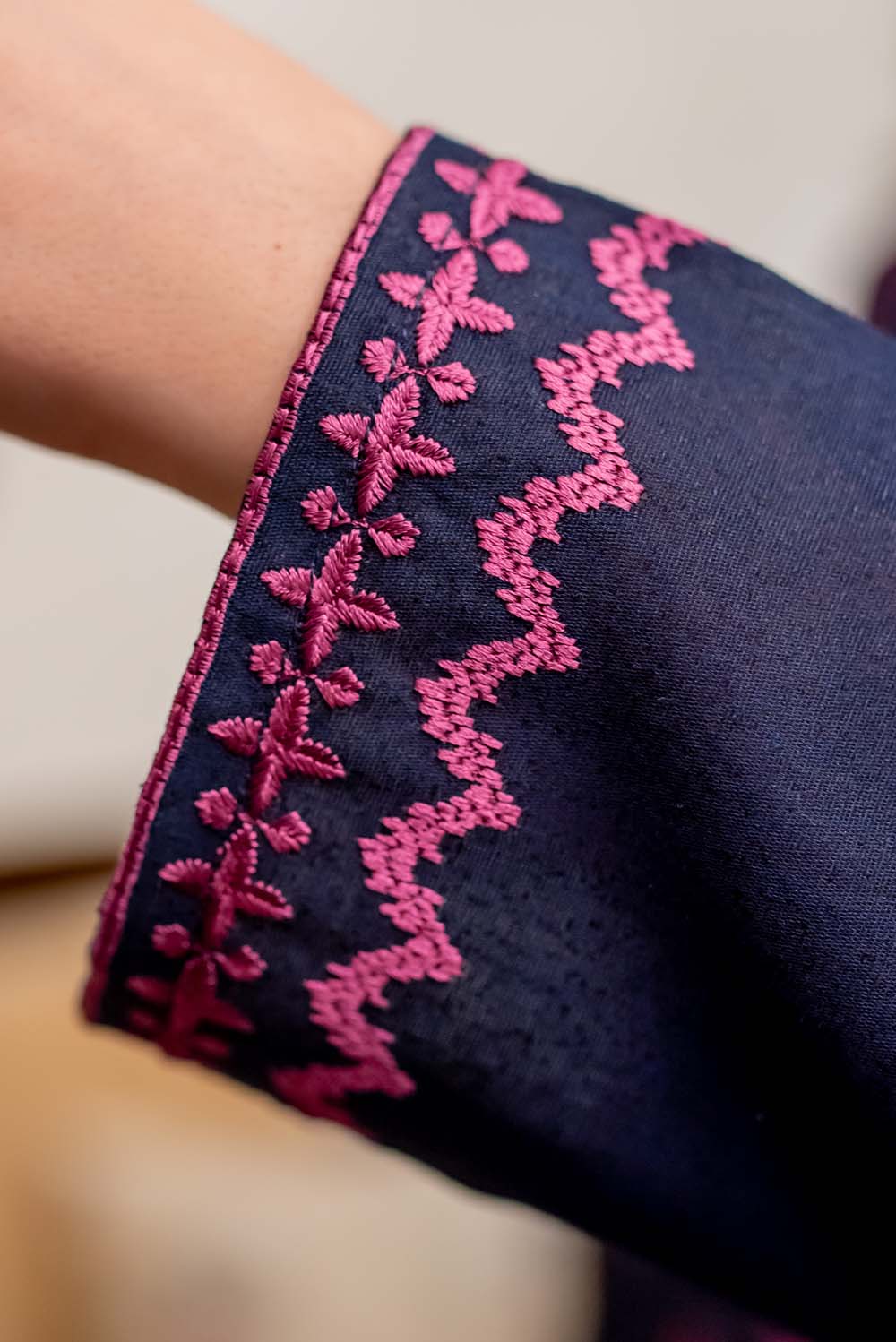A ready-to-wear 2-piece suit in dark purple base with intricate magenta embroidery details all over the shirt front and sleeve cuffs, paired with matching straight trousers.