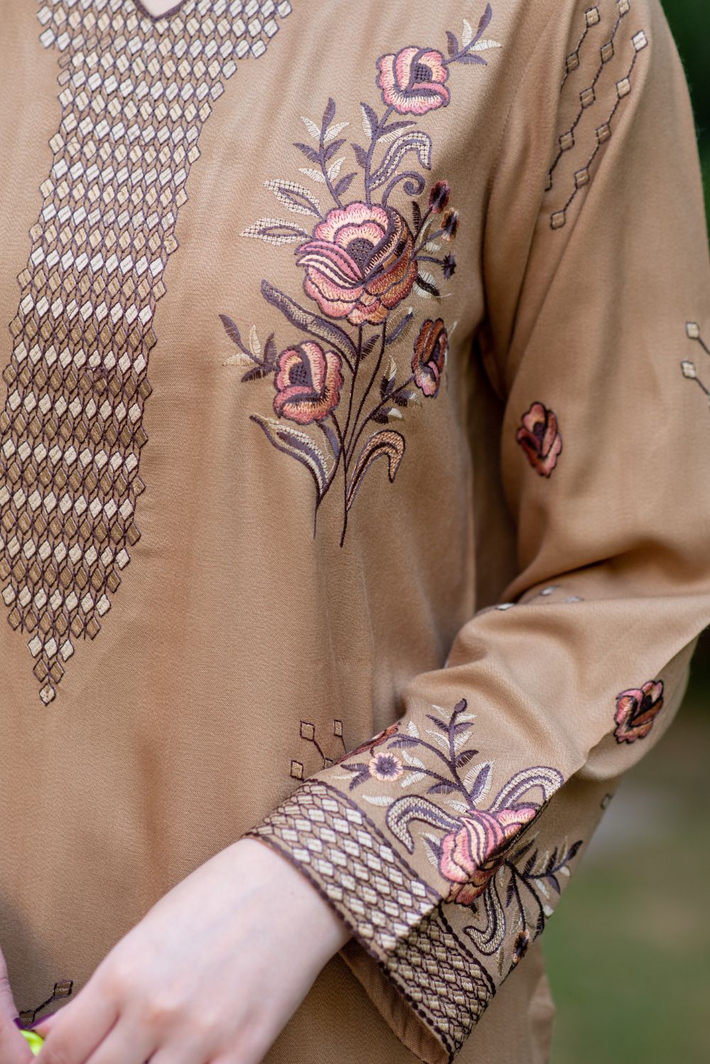 Pinkish Tan 2 piece, ready-to-wear suit with exquisite embroidery details on shirt front, neckline and sleeves, paired with matching straight pants.