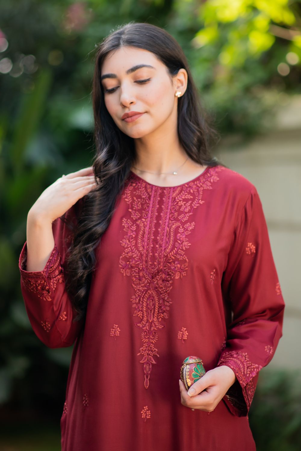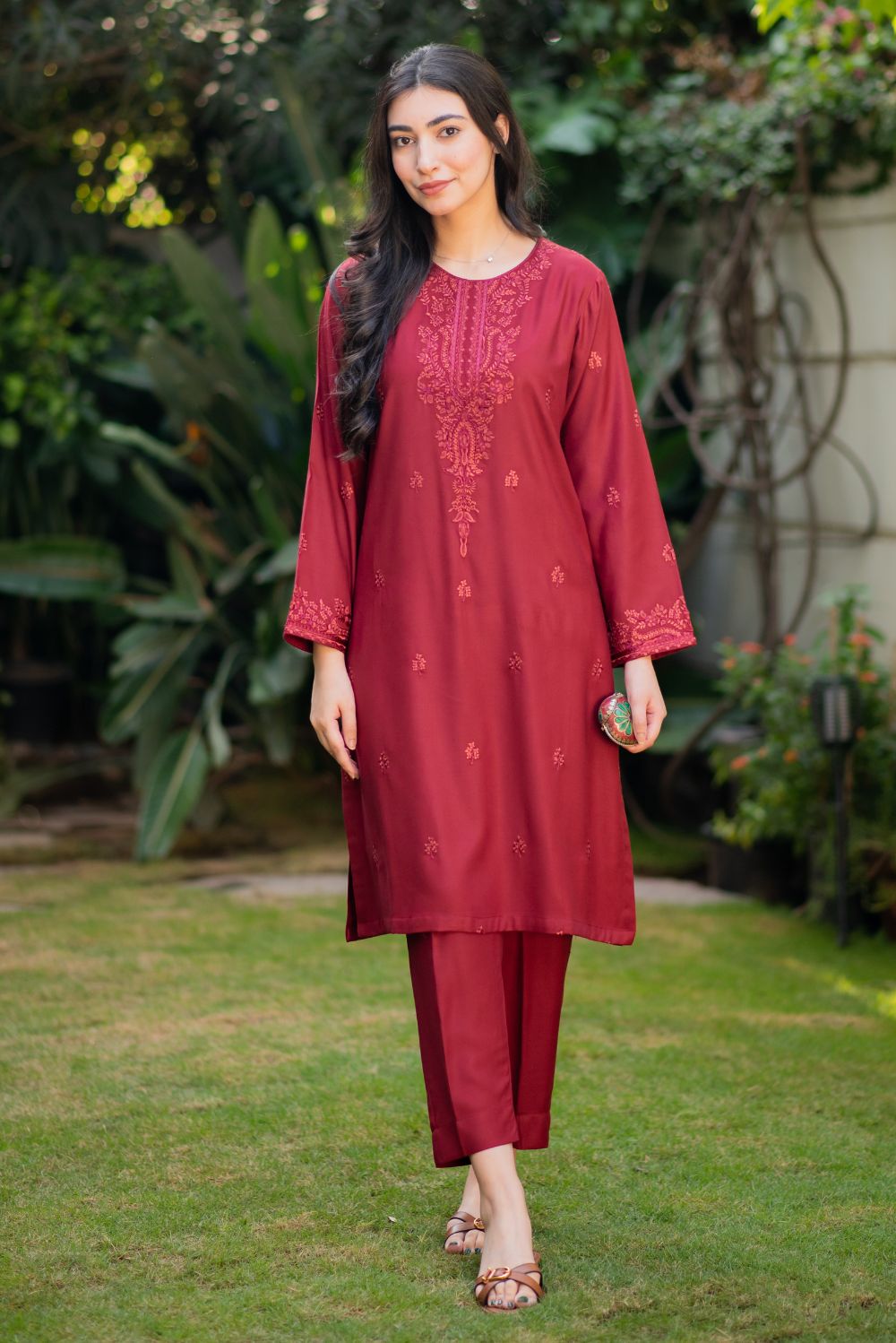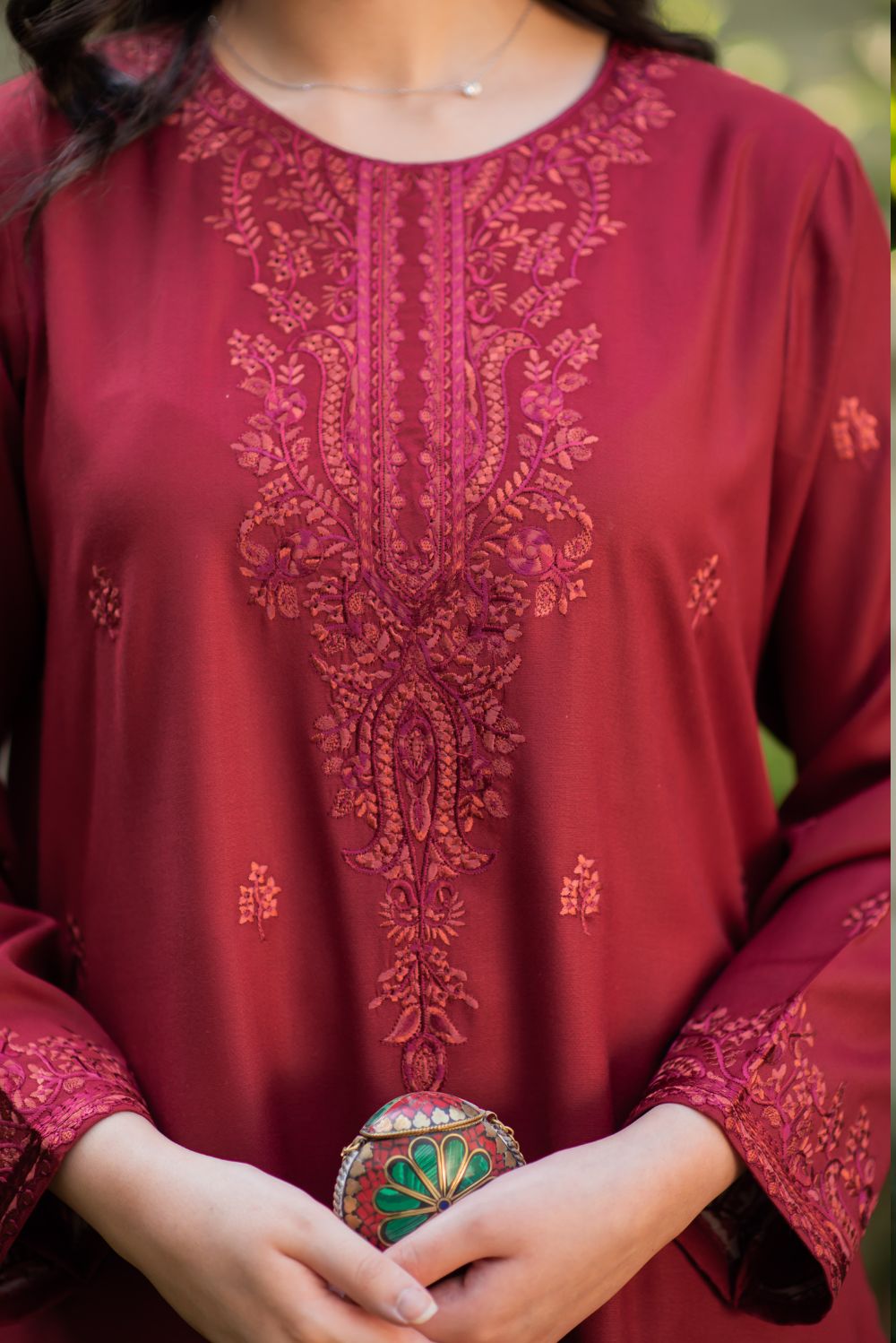 Ready to wear, 2 piece suit in red with embroidery on neck, sleeves and shirt front, paired with matching straight trousers.