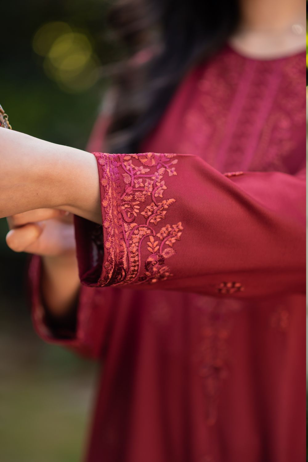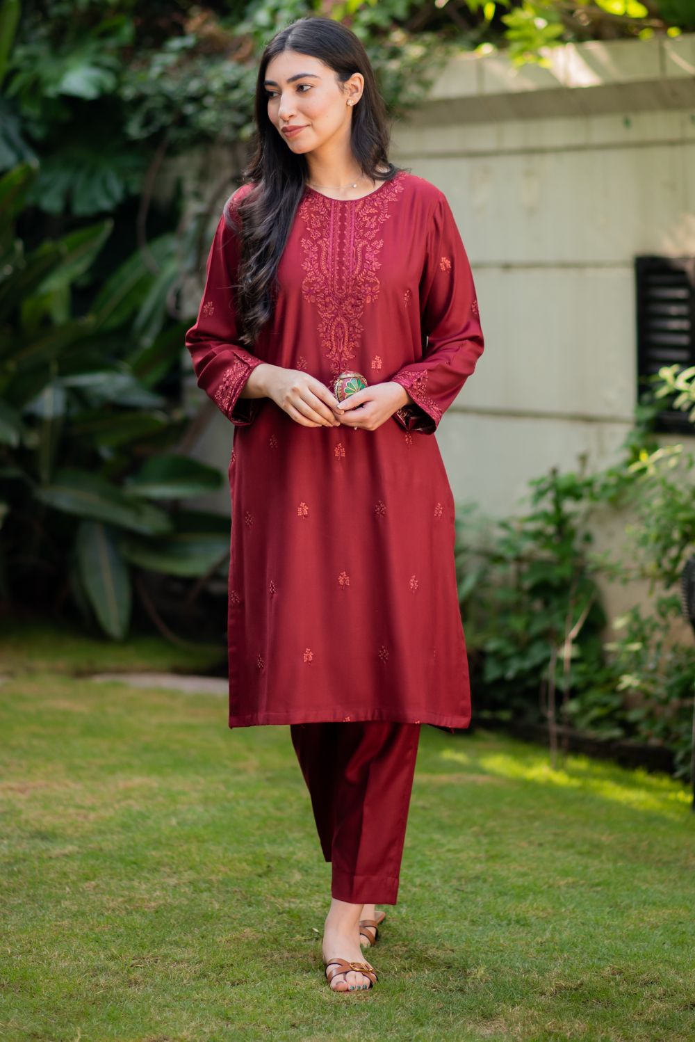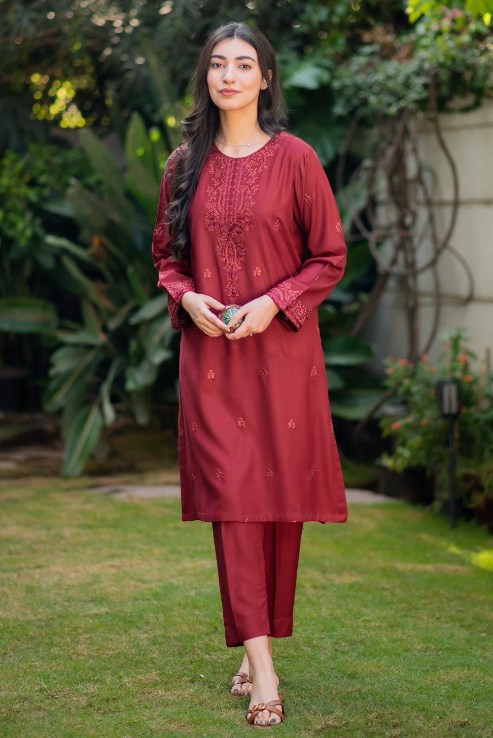 Ready to wear, 2 piece suit in red with embroidery on neck, sleeves and shirt front, paired with matching straight trousers.
