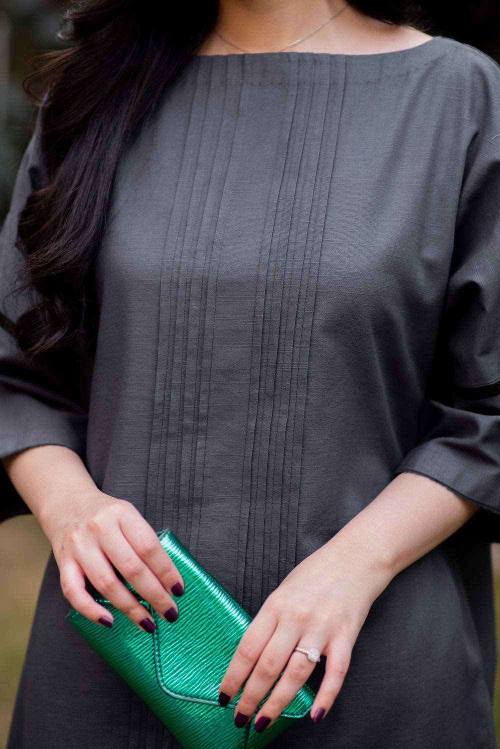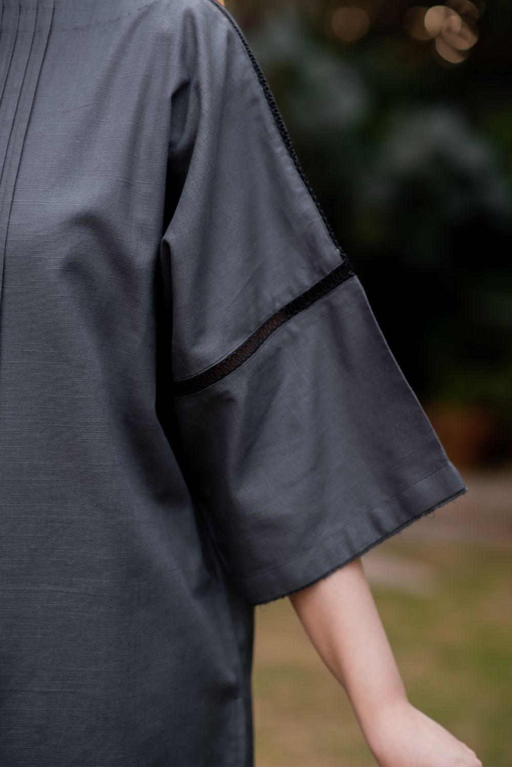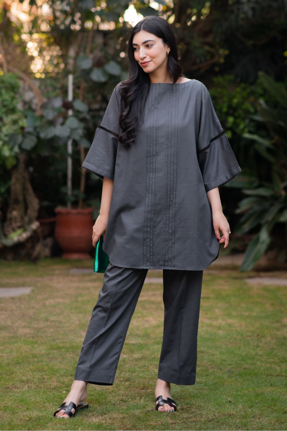 Discover sophistication in our Jet Grey ready-to-wear two-piece matching set. It has pleated details on the shirt front and delicate lace details on sleeves, paired with matching straight trousers.