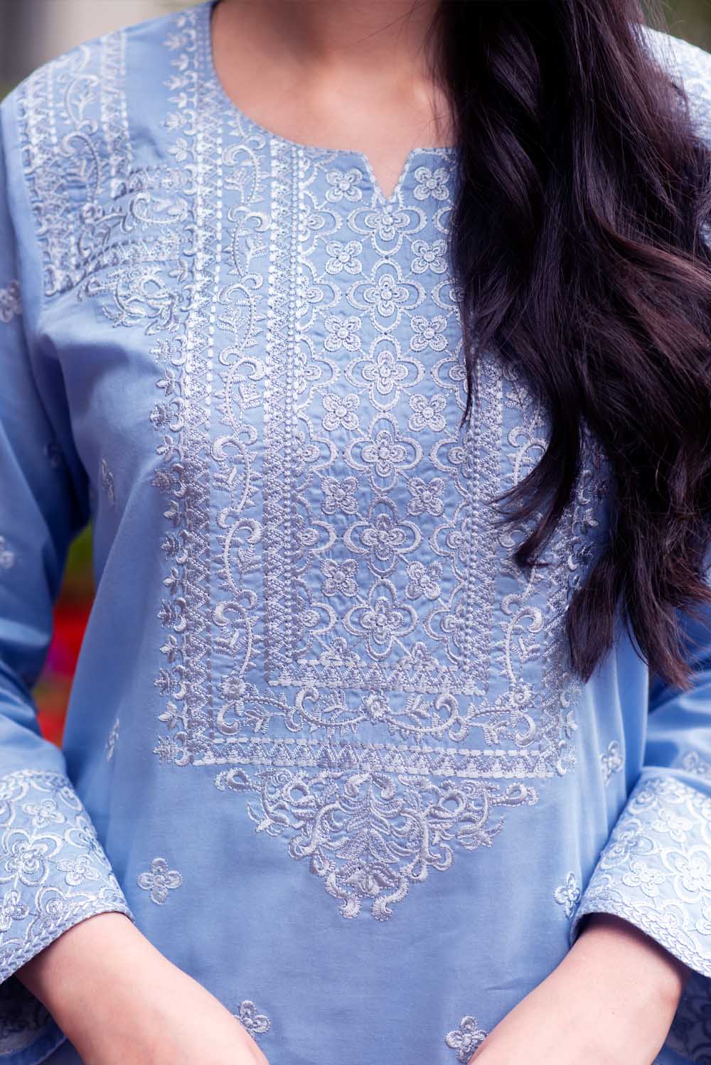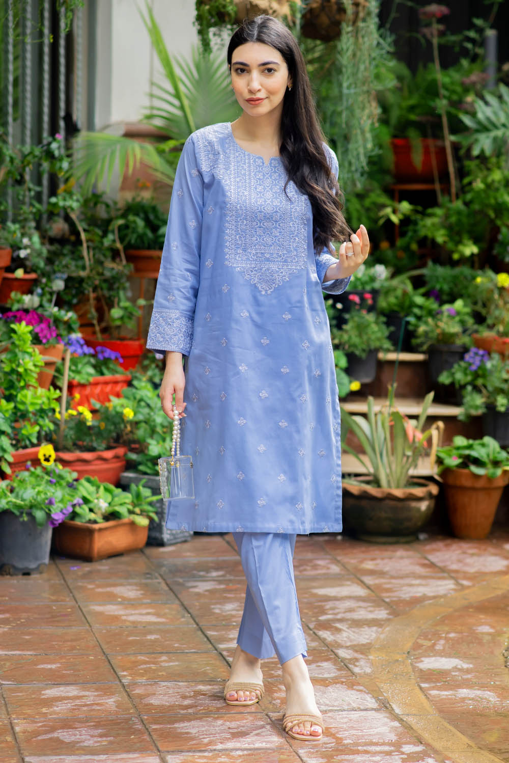 A Powder-blue 2-piece article with bluish-grey embroidery details on the shirt front, neckline and sleeves, paired with straight matching trousers.