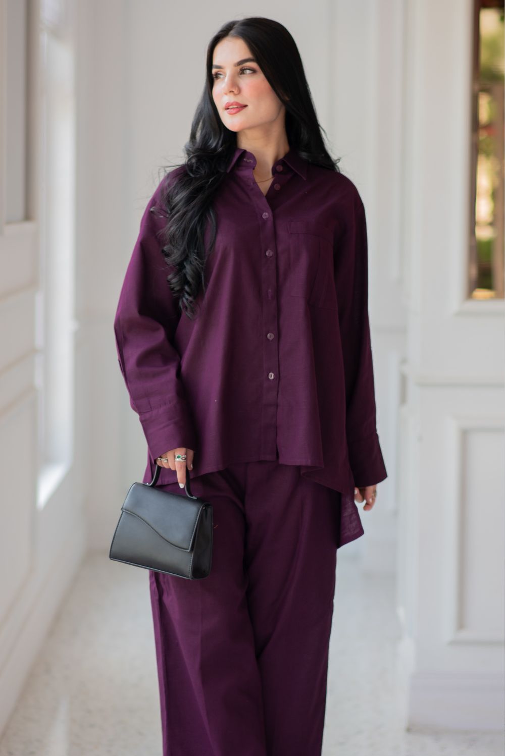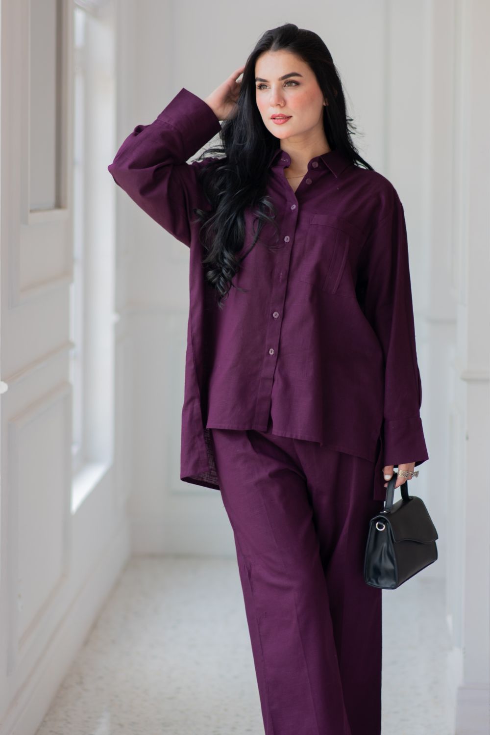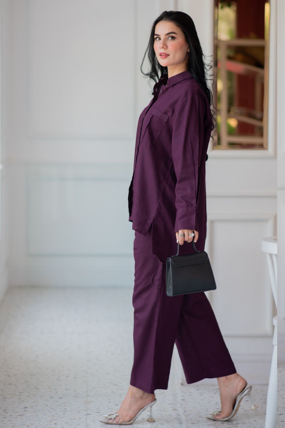 Elevate your style with our chic purple co-ord set, designed to make a bold and vibrant statement with a shorter shirt front, collar, and button-down details, paired with wide-leg trousers.