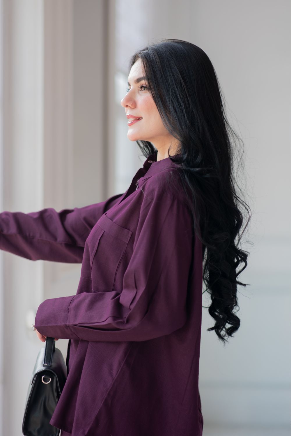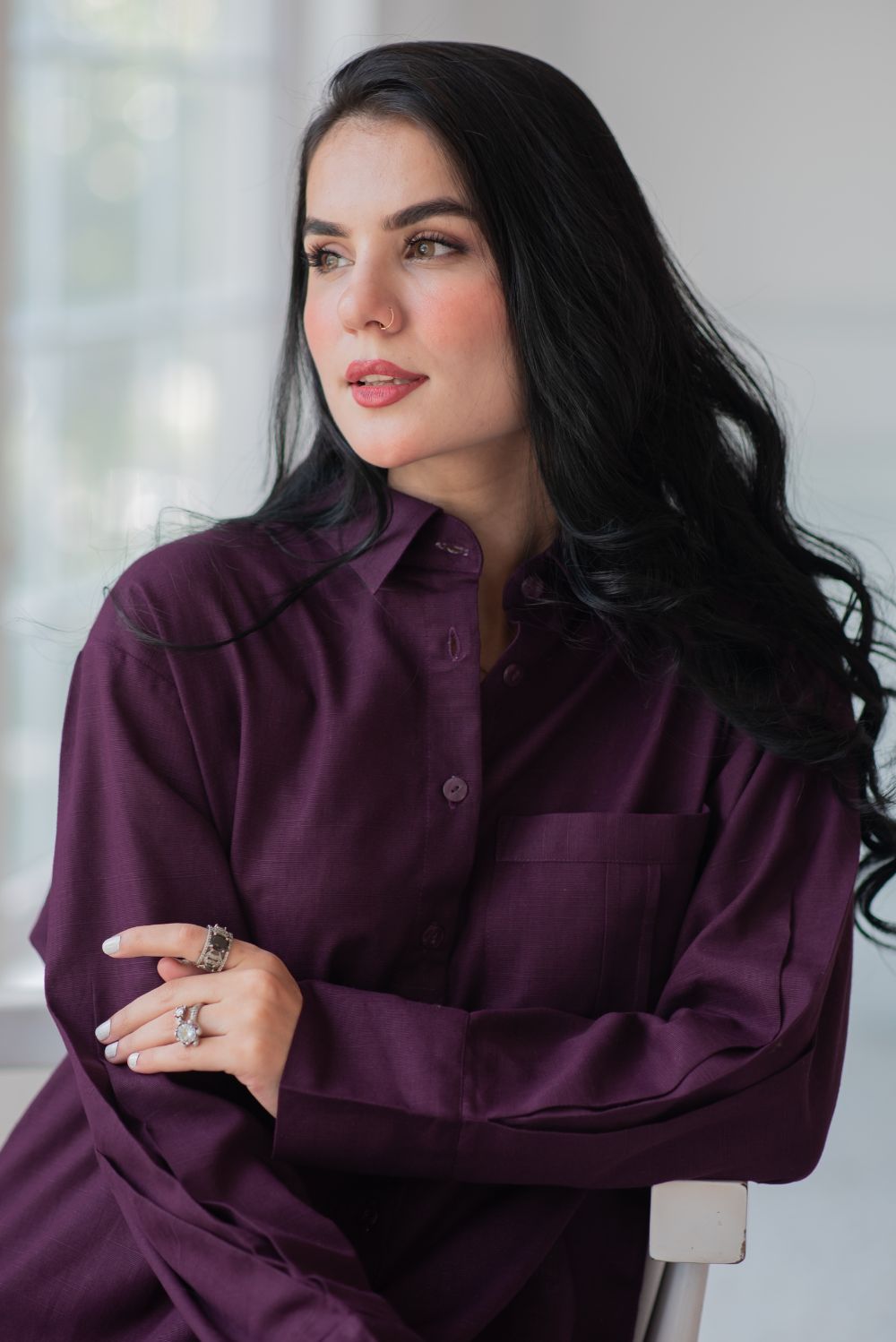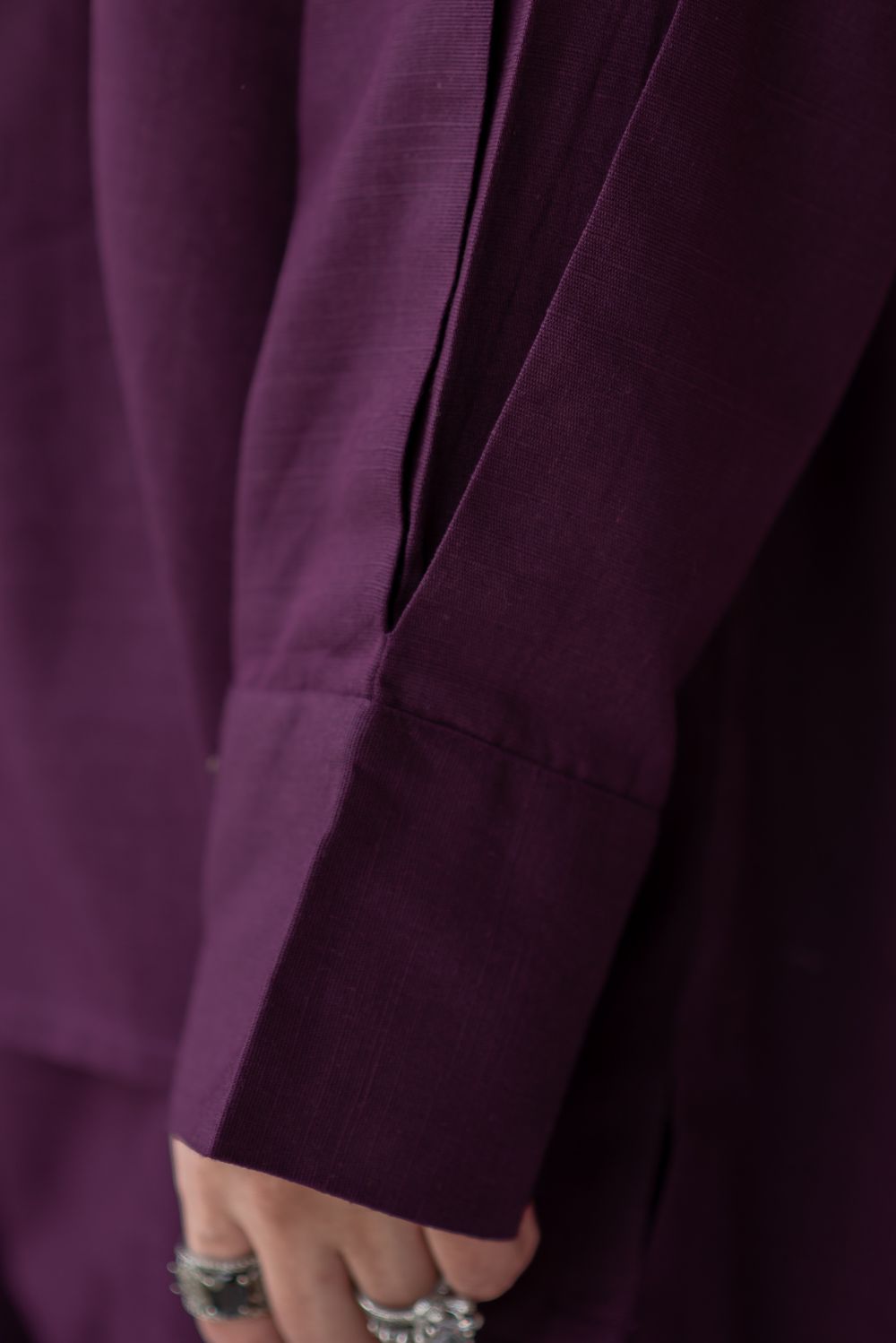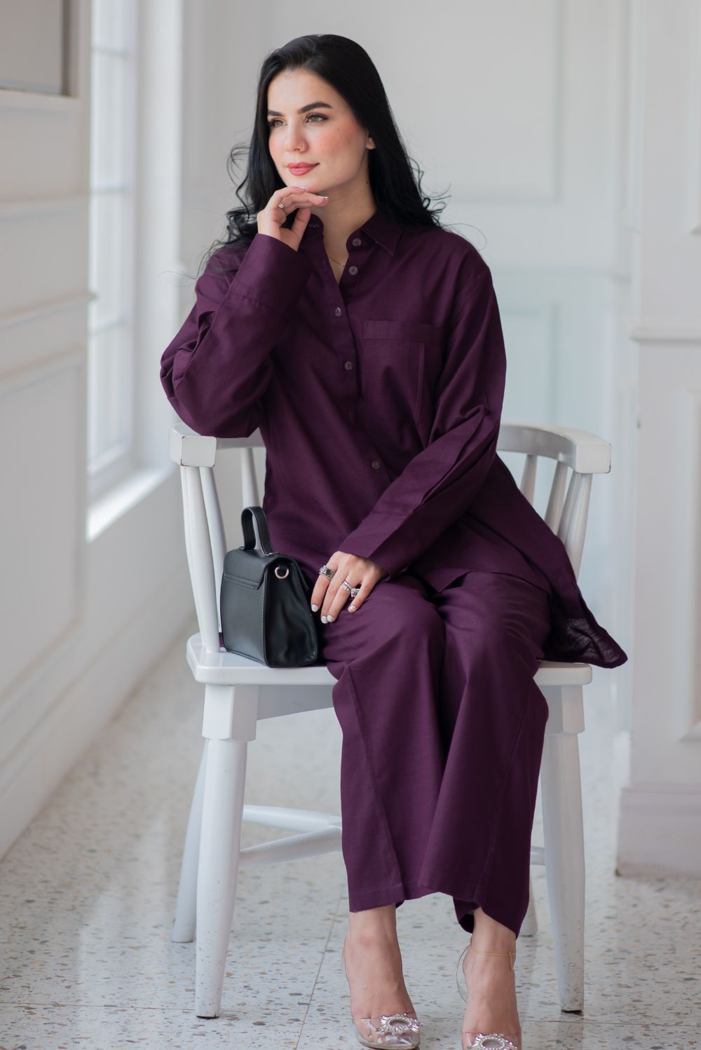 Elevate your style with our chic purple co-ord set, designed to make a bold and vibrant statement with a shorter shirt front, collar, and button-down details, paired with wide-leg trousers.
