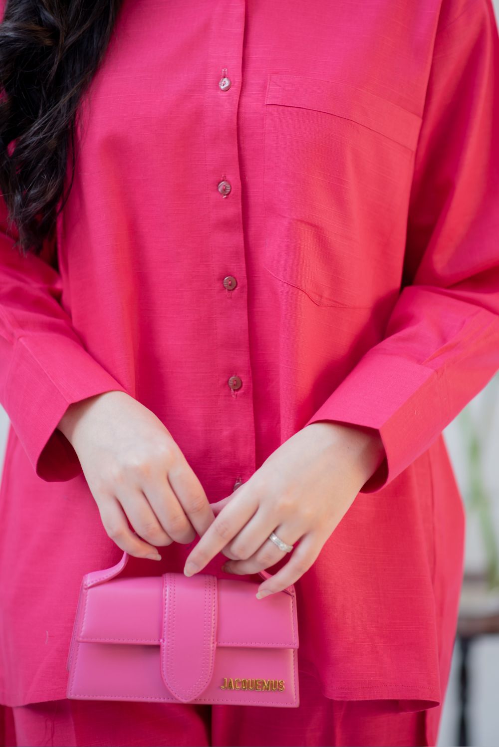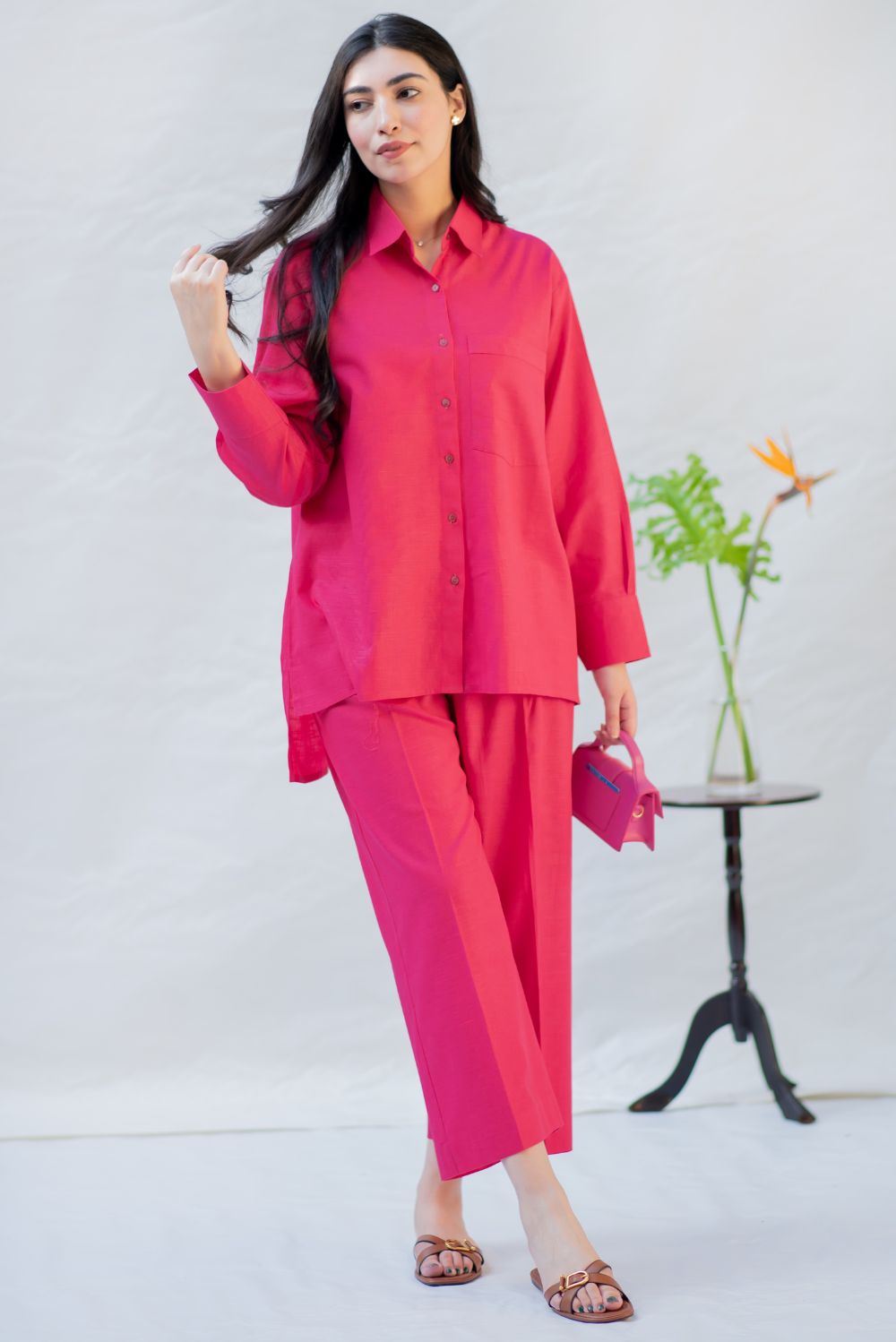 Experience a burst of colour with our Hot Pink ready-to-wear 2-piece Co-ord set. Complete with a stylish button-down shirt and matching pants, is your go-to outfit for a bold and trendy statement.
