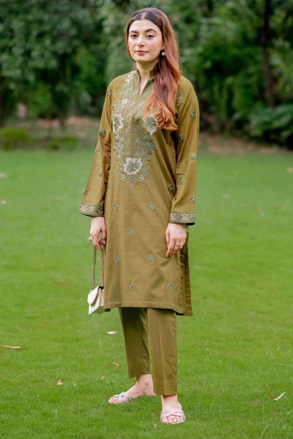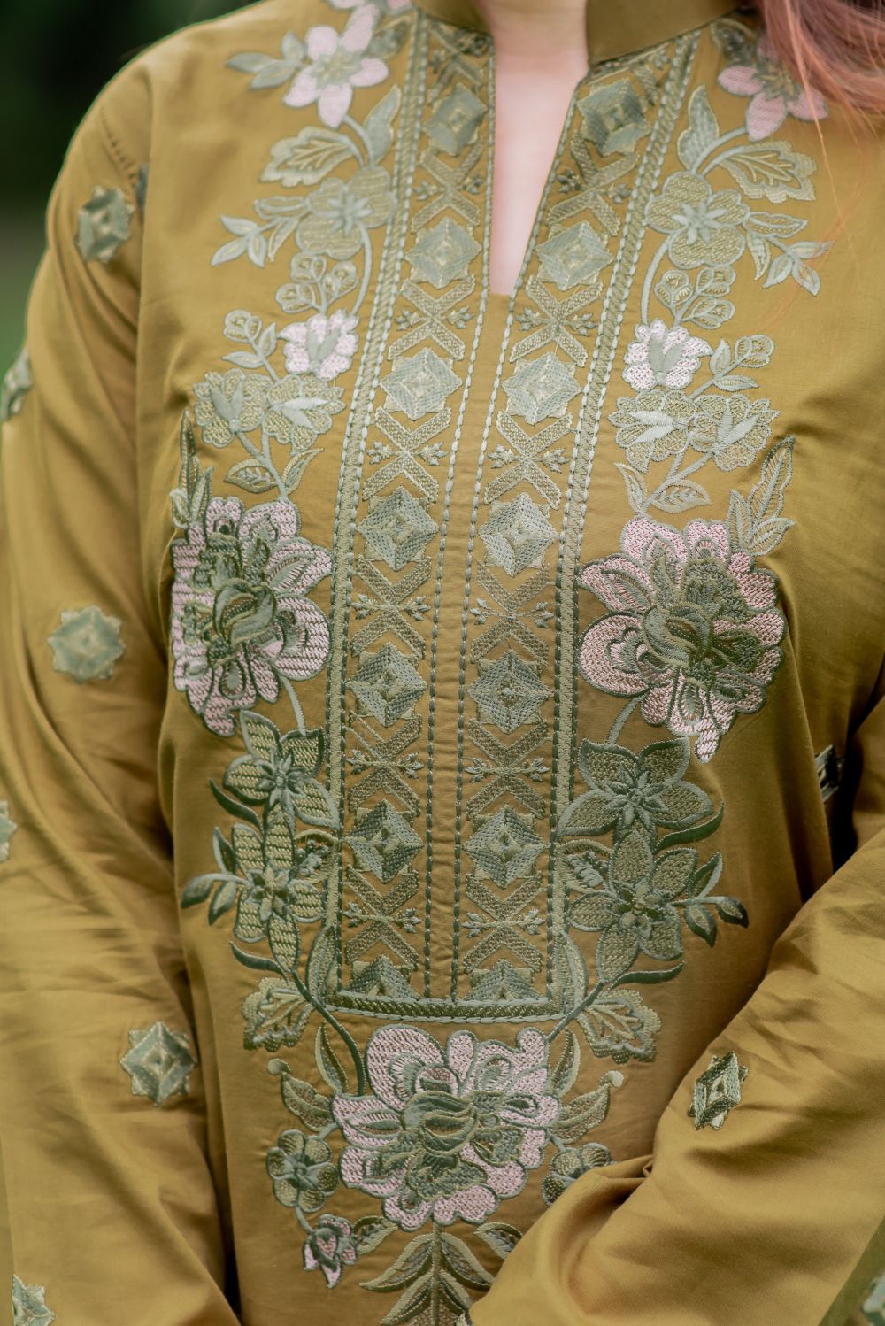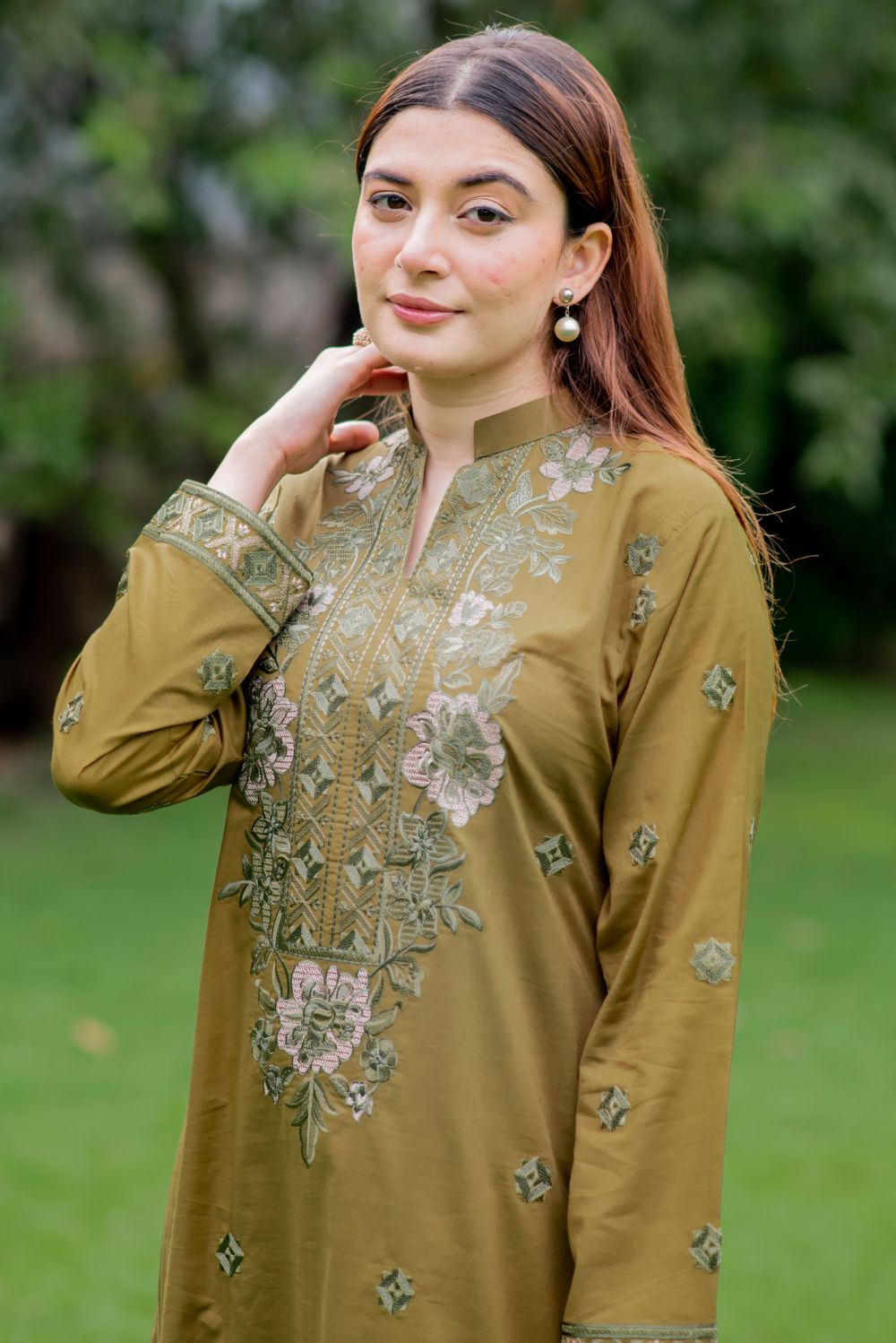 This olive two-piece outfit features intricate embroidery in various shades on the front and sleeves of the shirt. It is styled with matching straight trousers for a complete look.