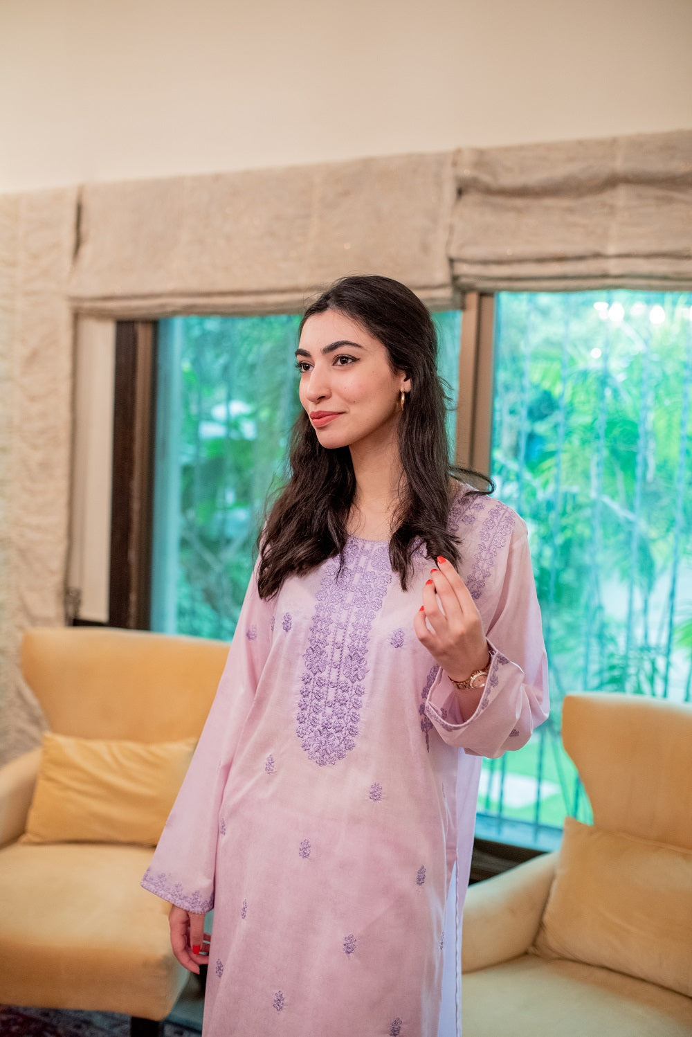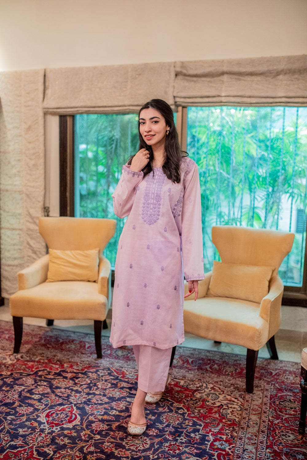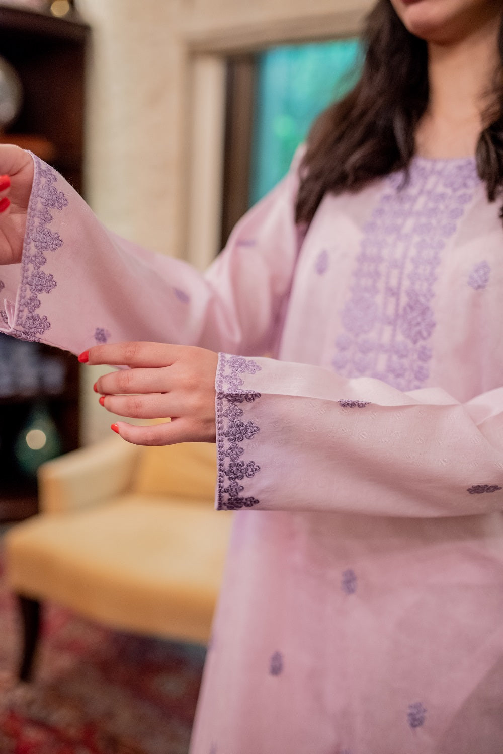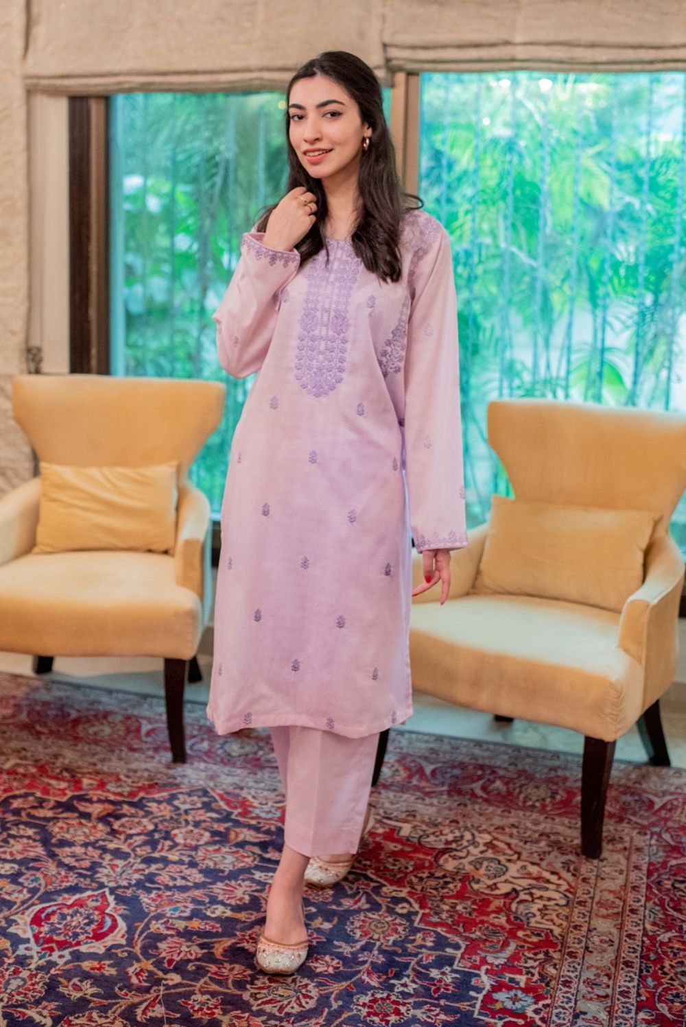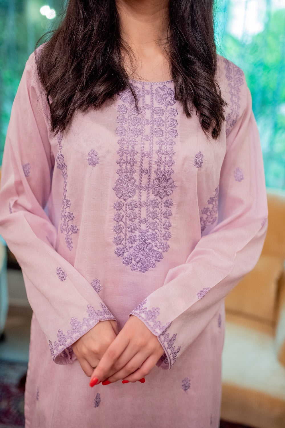 A light lilac-coloured ready-to-wear ensemble has a shirt and trousers. It has lavender embroidery on the neckline, sleeves and front panel as well.