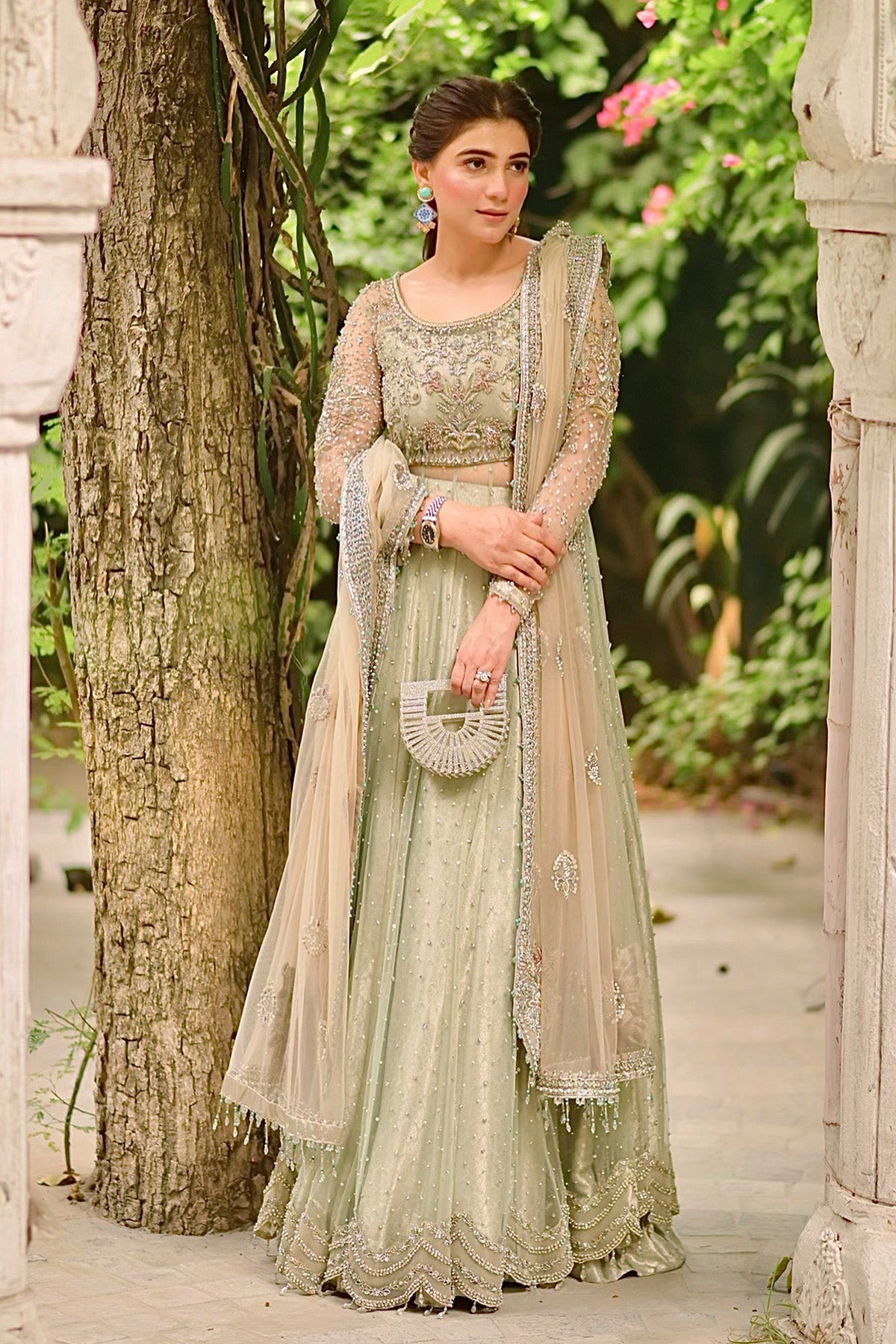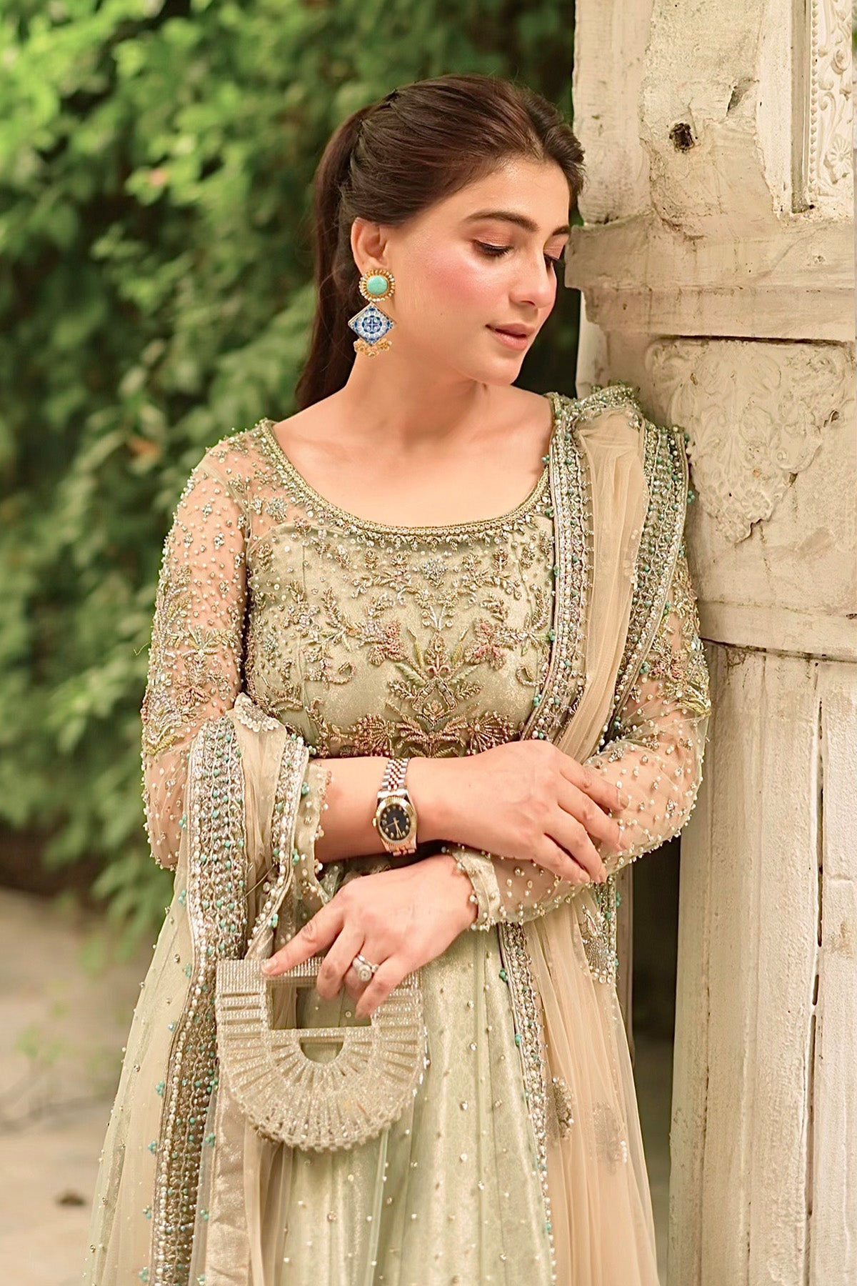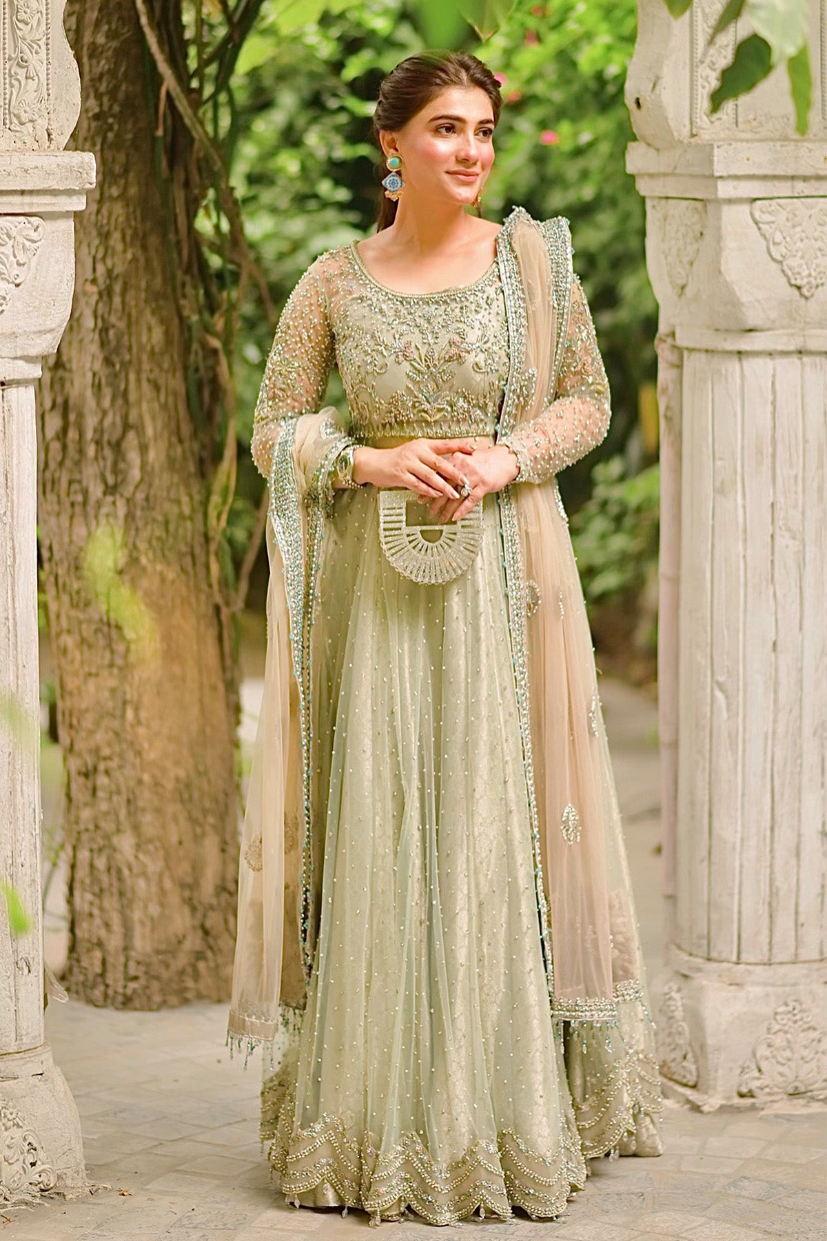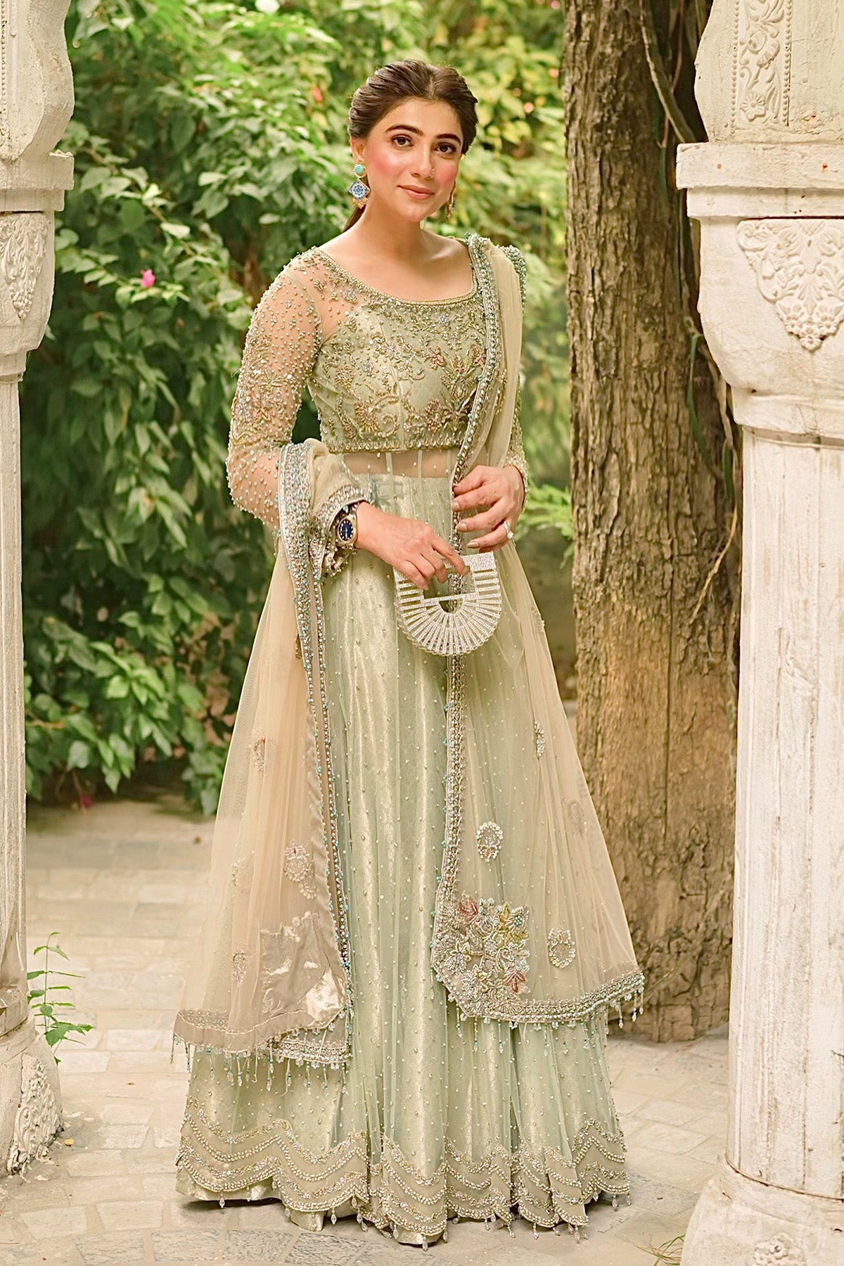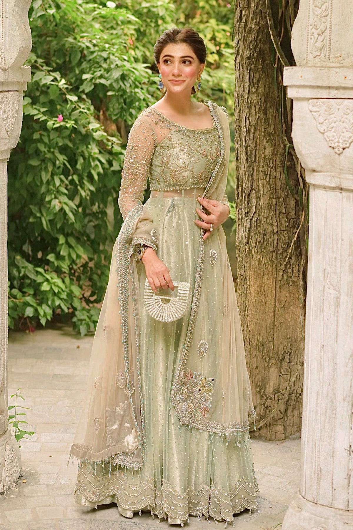 A heavily worked bodice and a floral hand worked border makes up this mint greencolored peshwas. A pastel peach draped net dupatta with work on four sides adds a dramatic twist to the ensemble. The gorgeous sheer kalidaar is layered over a subtly shimmering, jamewaar lehgna for an amazingly flattering silhouette.