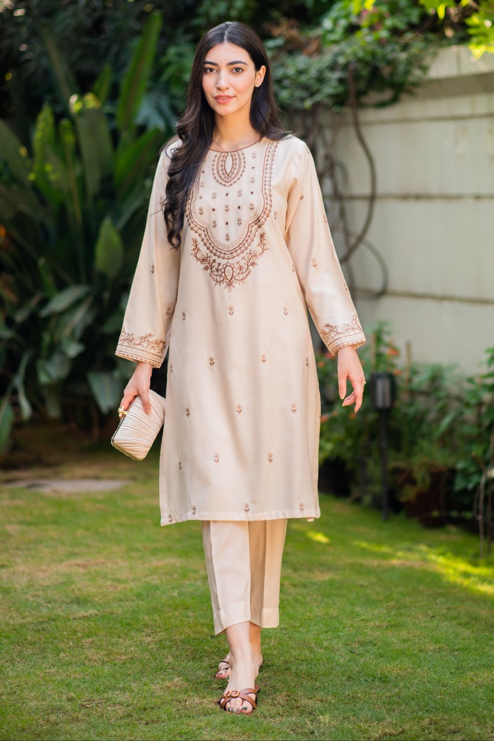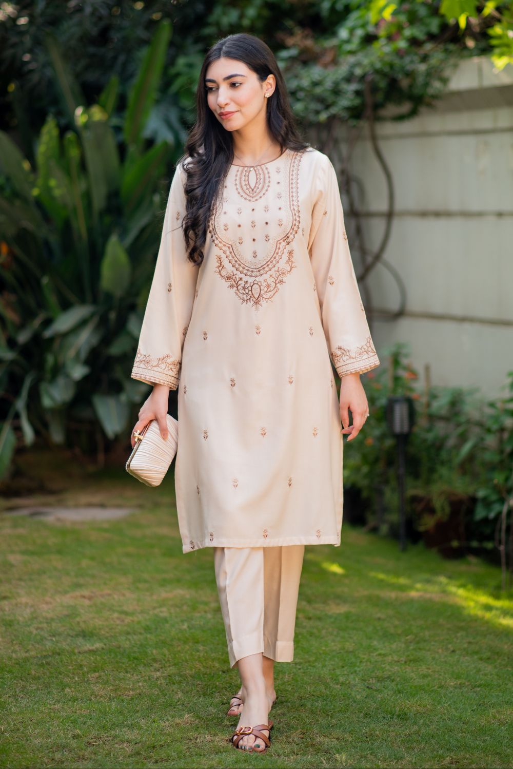 A ready-to-wear two-piece suit in gentle pastel hues, featuring contrasting colour embroidery gracing the entire shirt front, as well as adorning the neck and sleeves, elegantly paired with straight trousers in a matching shade.