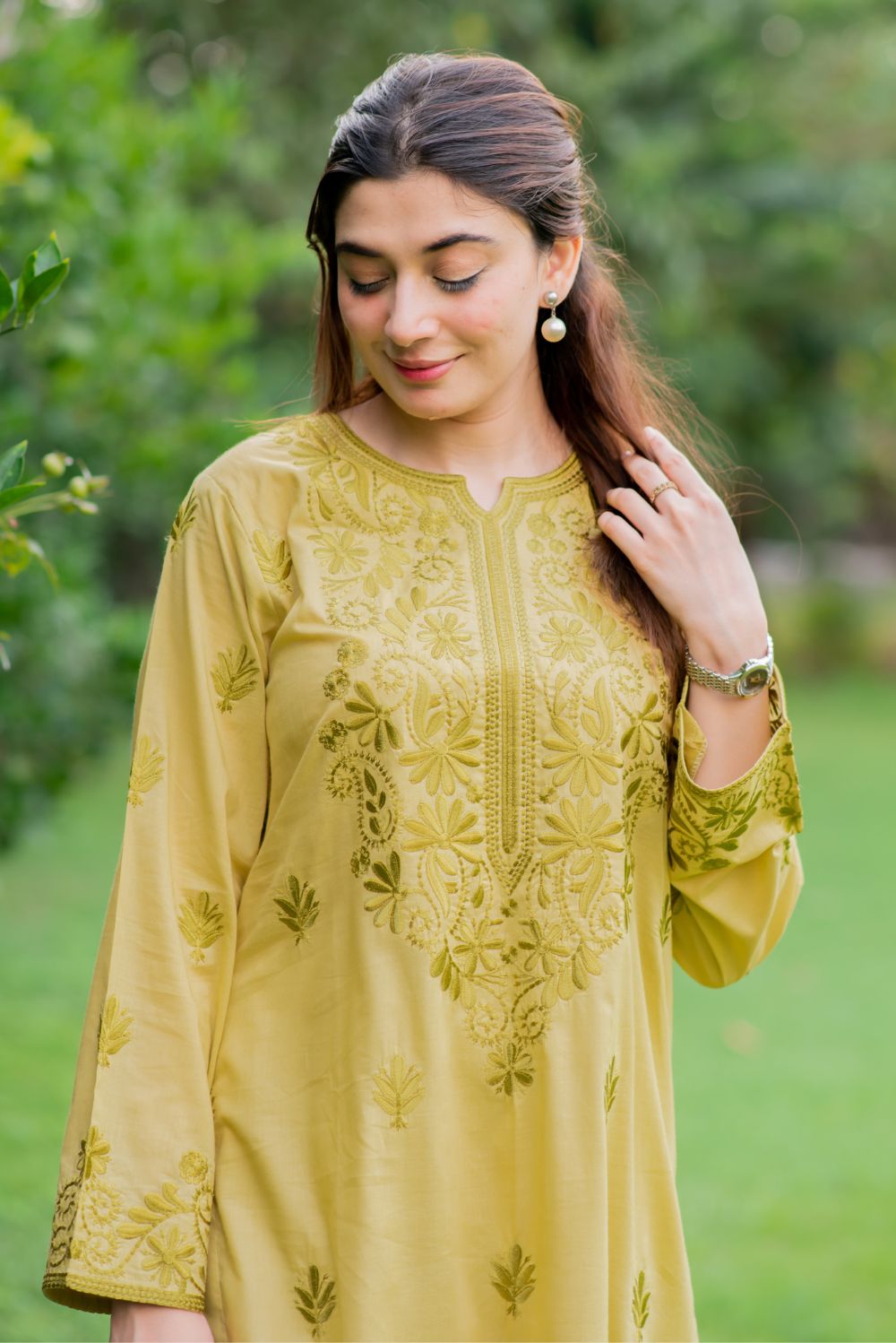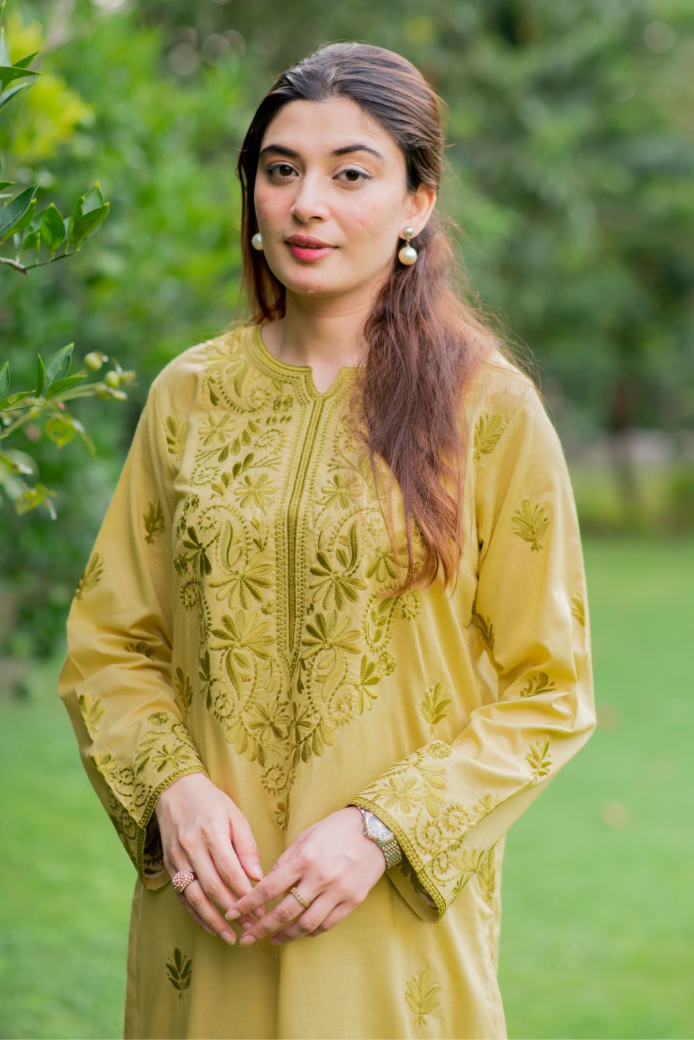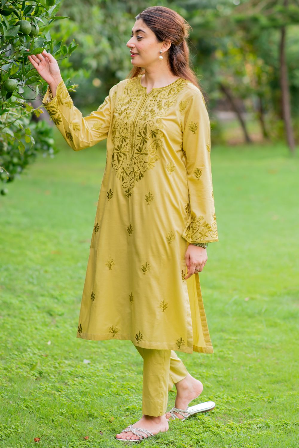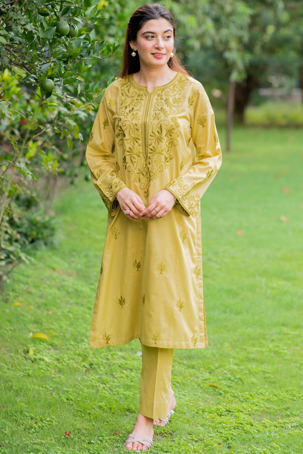 Ready to wear, two-piece summer outfit with contrasting embroidery all over the shirt front and sleeves, paired with matching straight pants.