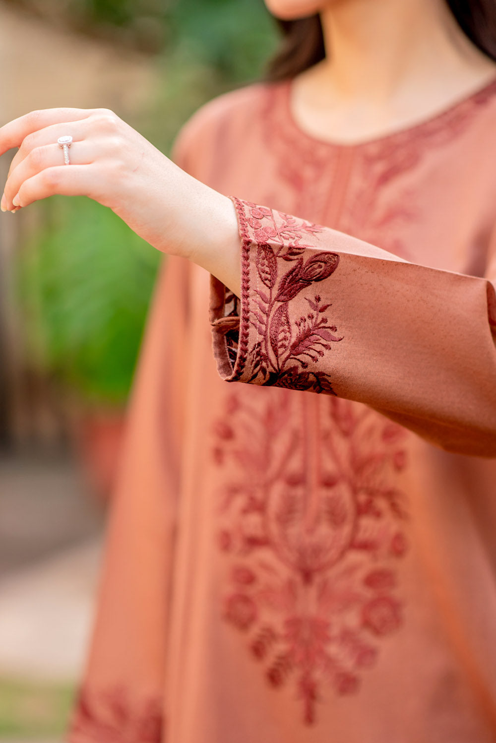 Tabrezi is a 2 piece suit for ladies in brown with chocolate embroidery details over the shirt front and sleeve cuffs, paired with matching straight trousers.