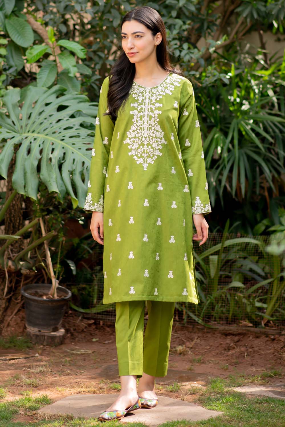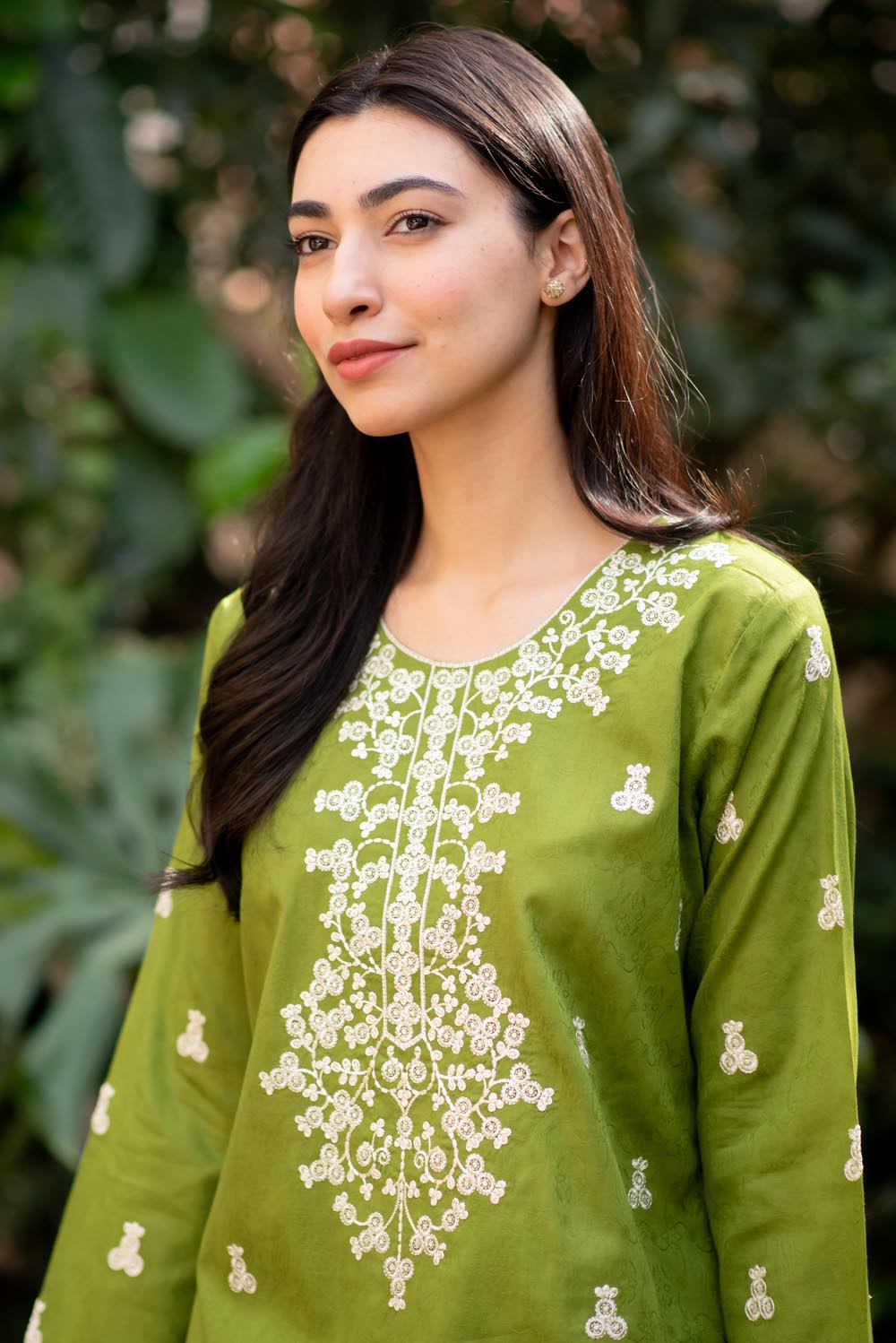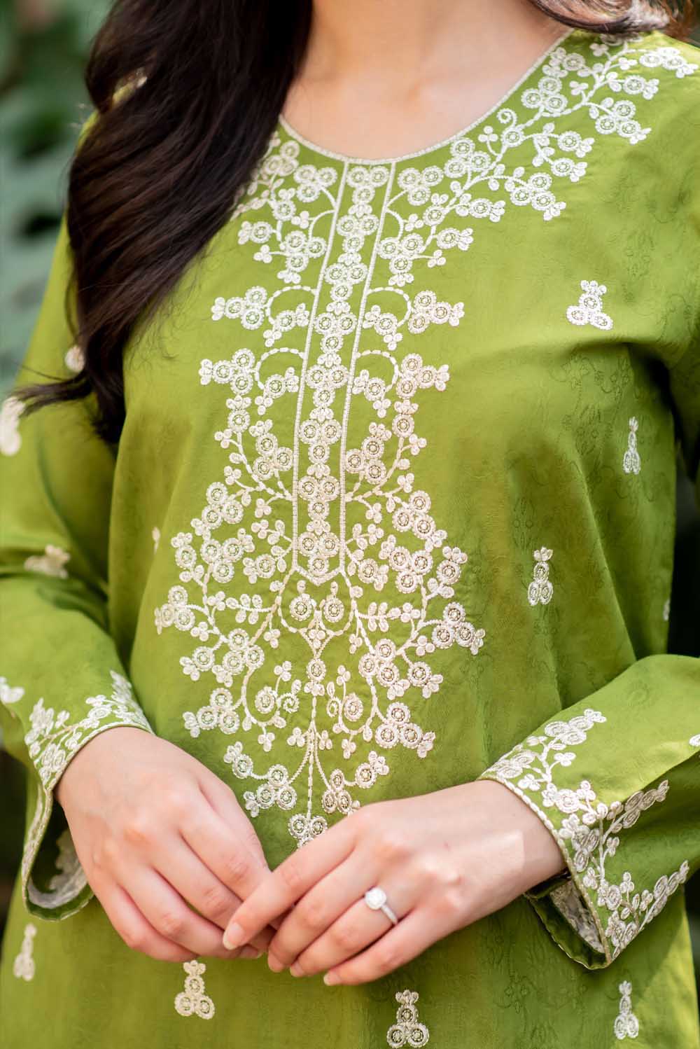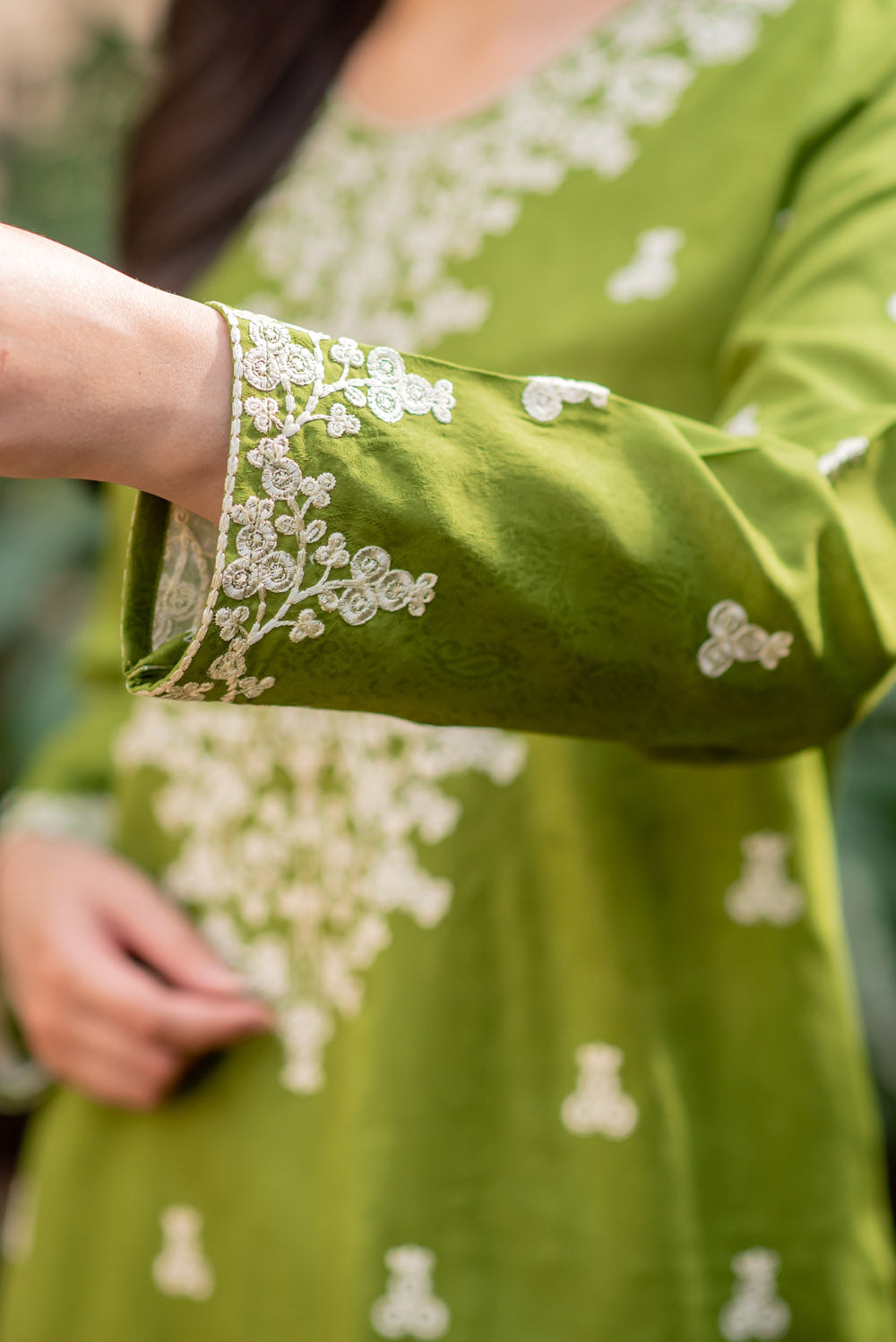 Ready-to-wear 2 piece suit design in true green with embroidery details all over the shirt front and sleeve cuffs, paired with matching straight trousers.