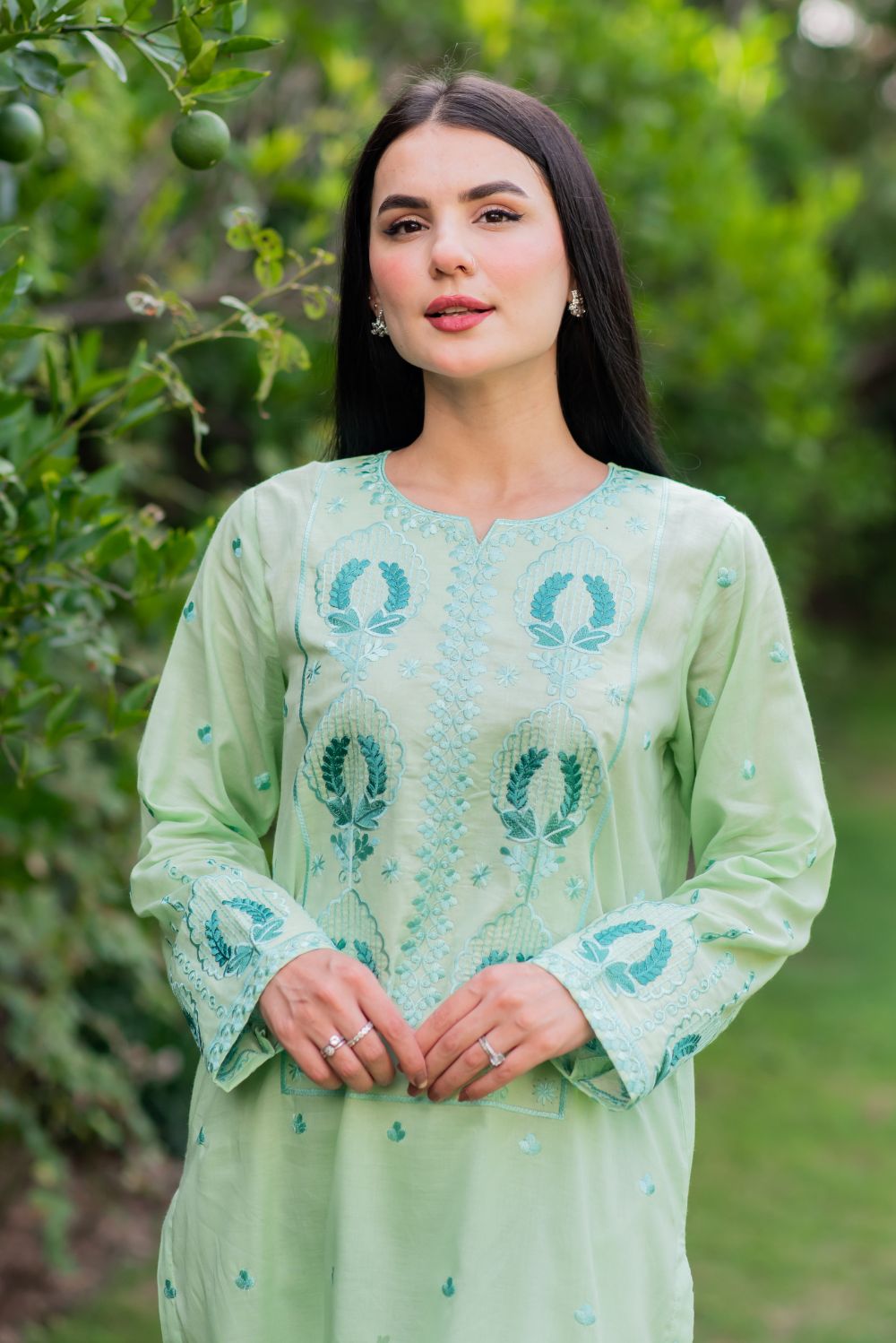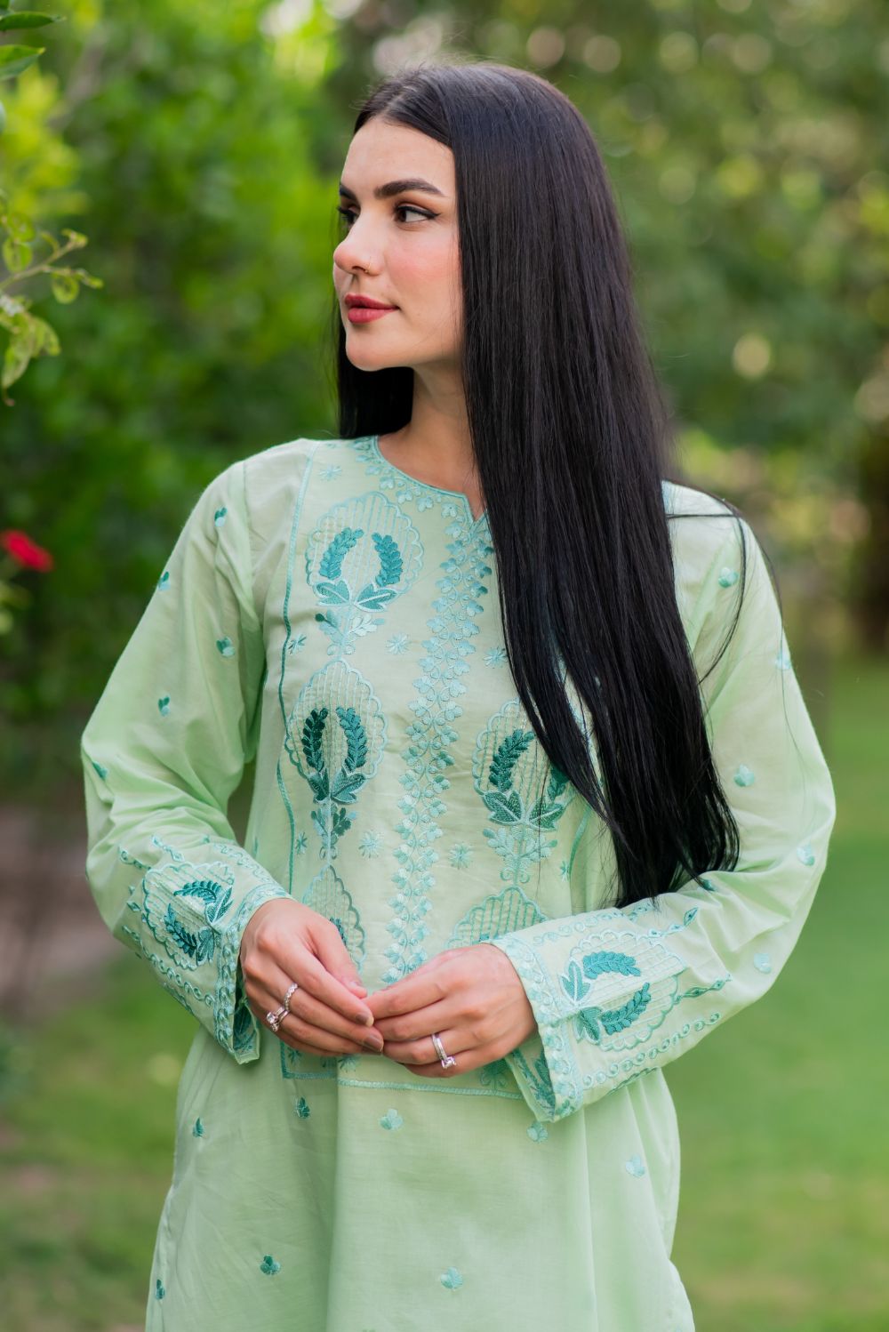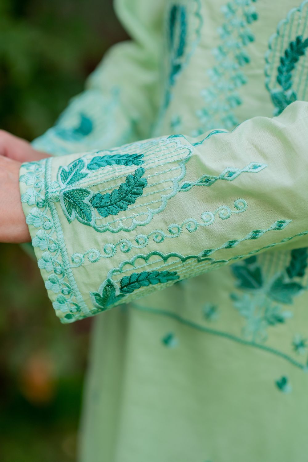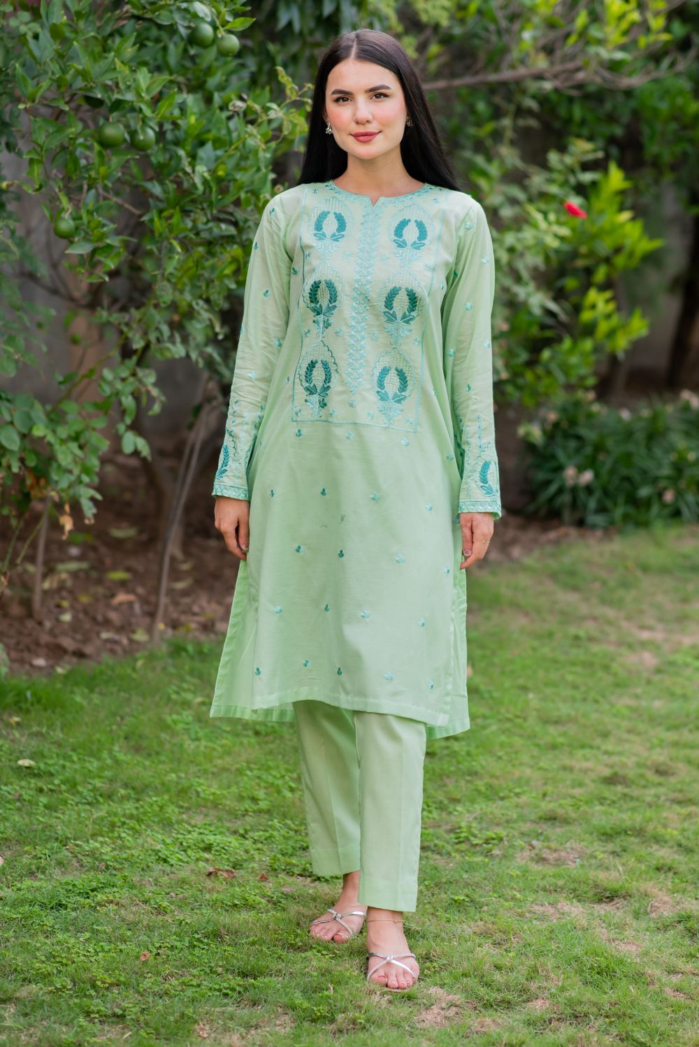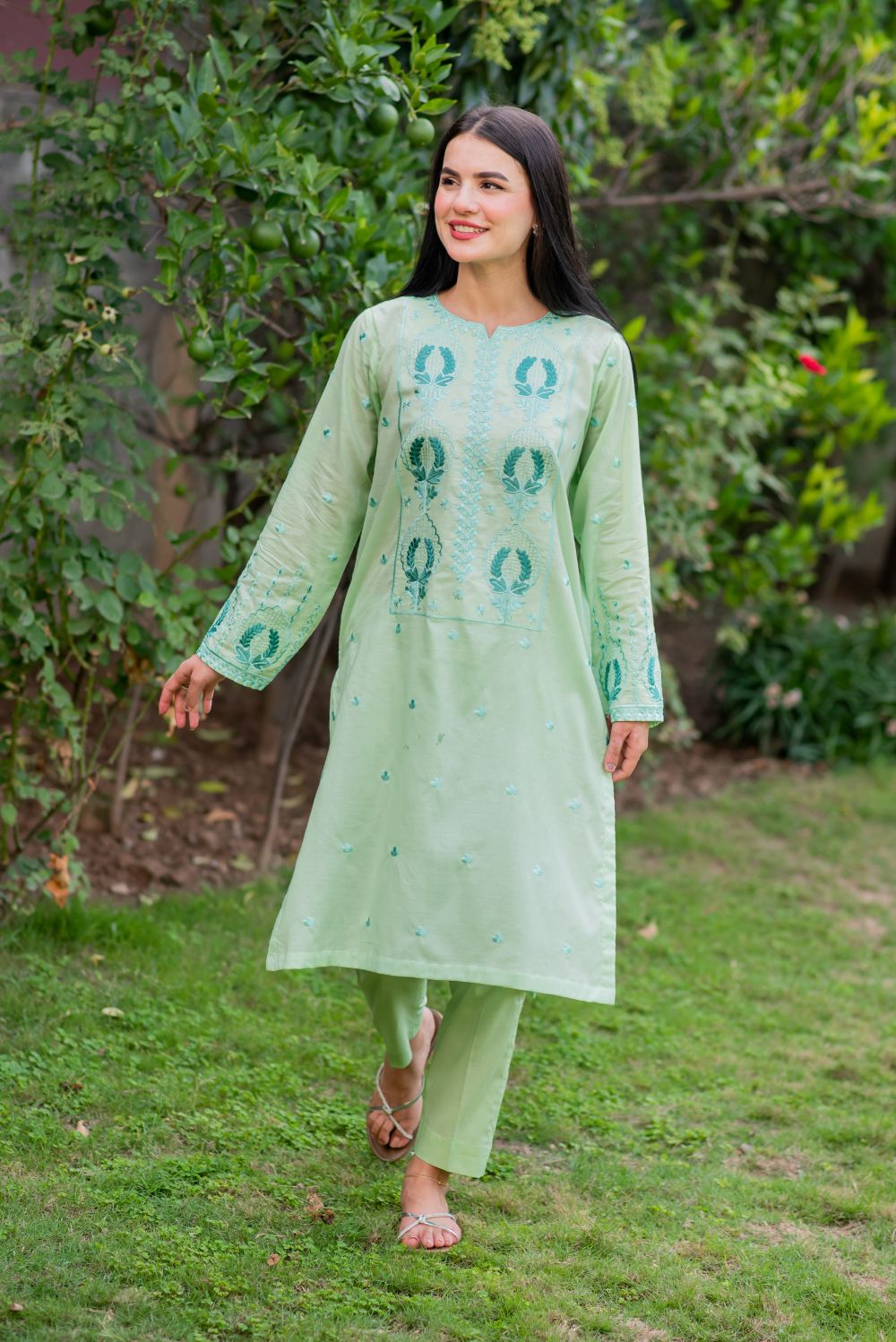 Greenish-Cyan coloured 2 piece Ready-to-wear suit comes with embroidery details all over the shirt front and sleeves, paired with matching straight trousers.