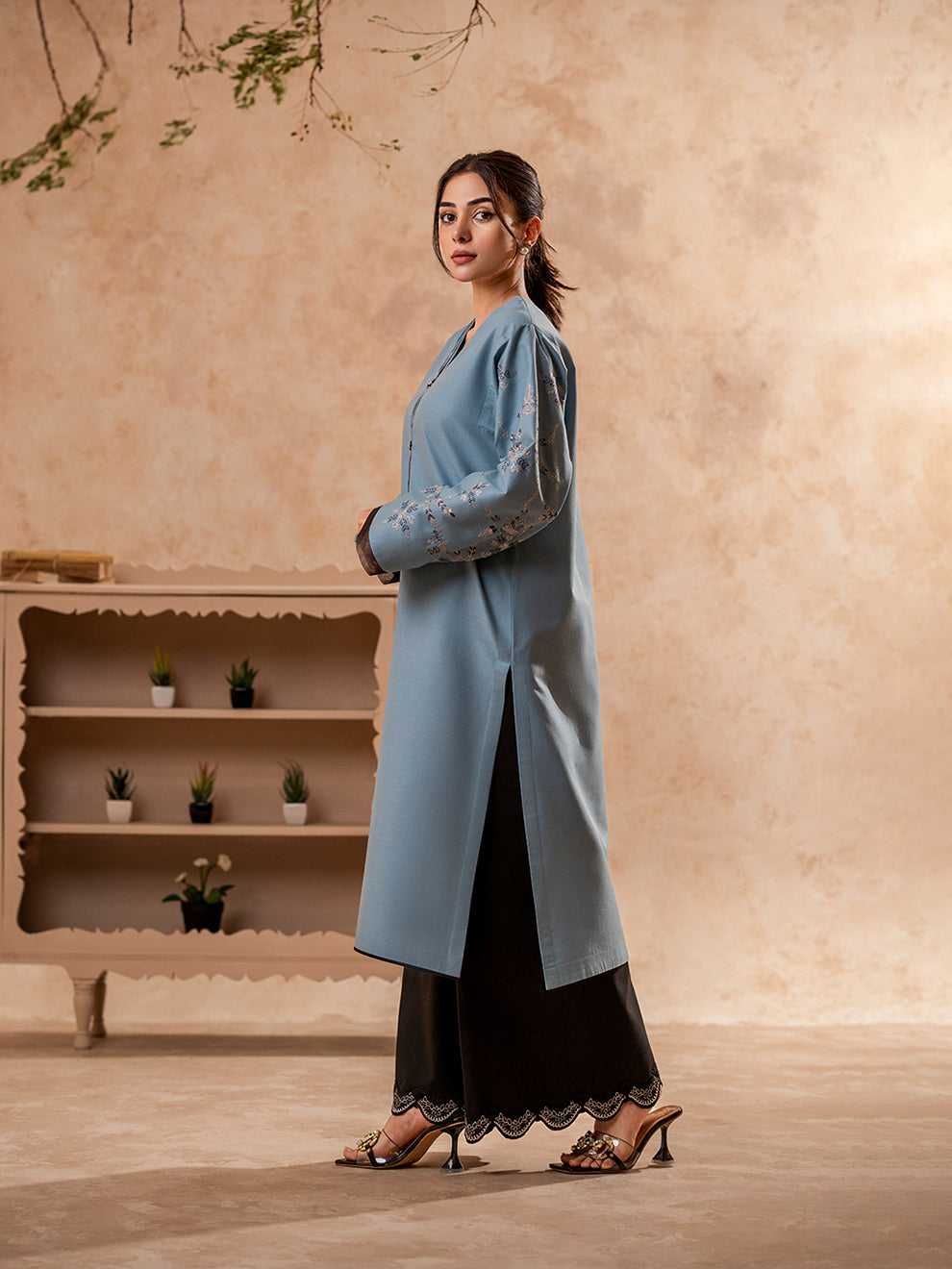 A minimal look featuring embroidered sleeves in contrasting tones on silver and black. The pleated neckline is adorned with hand embellished buttons.