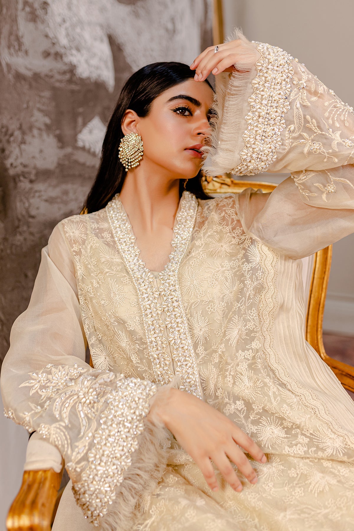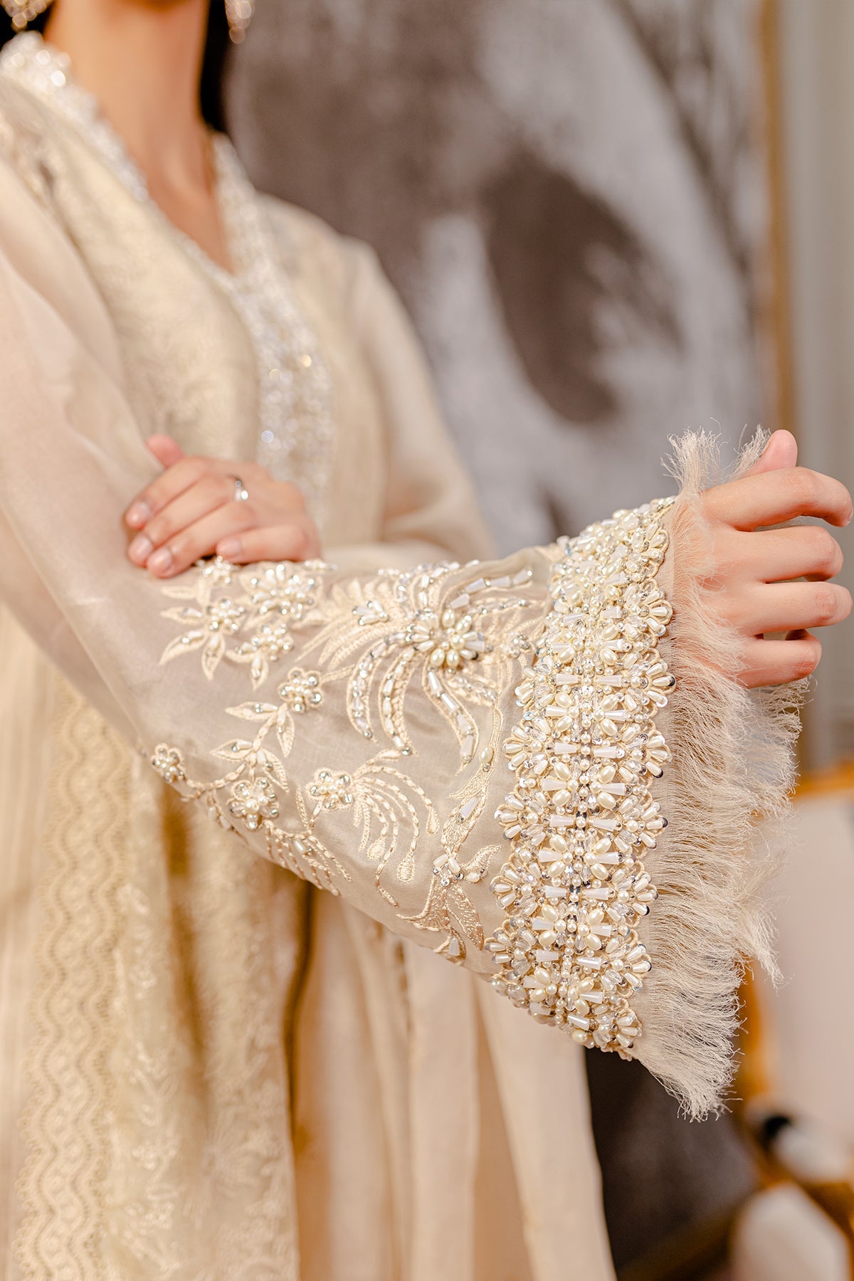 Composed of an appealingly white organza shirt accentuated with pleats and lace detailing. The overlapping neckline and sleeves are further enhanced with heavy hand embellishment featuring different materials. The ruffles on the edges adds an extra depth to the sleeves. The stunning organza dupatta is adorned with marvelous work and scalloped edges. This is paired with Korean Silk pants, making the whole outfit stand out among the crowd!