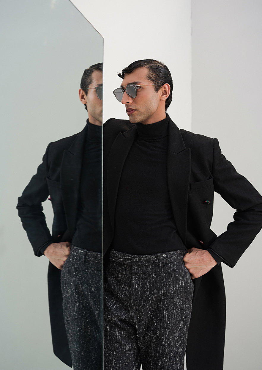 Introducing Bagarre, a luxurious black wool men's winter coat. Its long cut and superior craftsmanship make it the perfect choice for those cold winter days, ensuring your look is both comfortable and stylish. Enjoy unparalleled warmth and comfort with Bagarre.