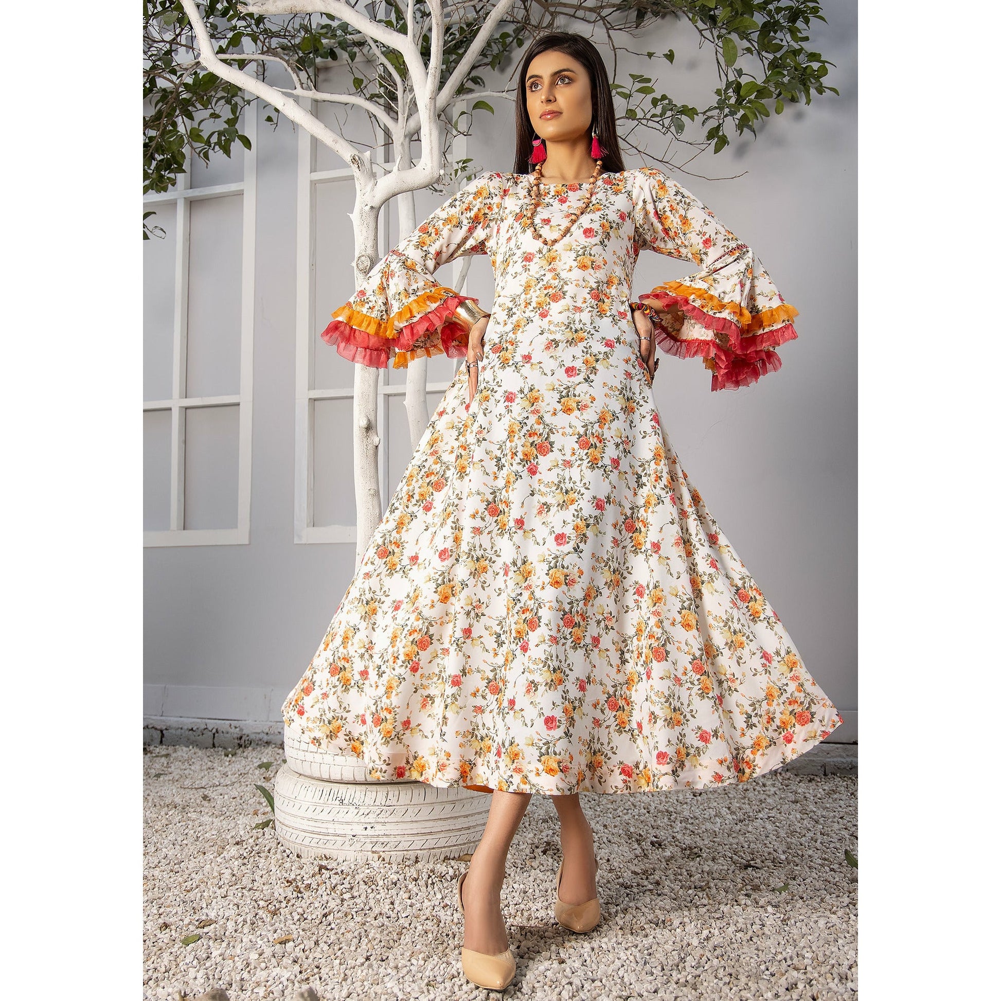 A dapper look is illustrated on this Grip maxi. The elegant look is enhanced with sewing detail and organza at sleeves. This is ready to wear.