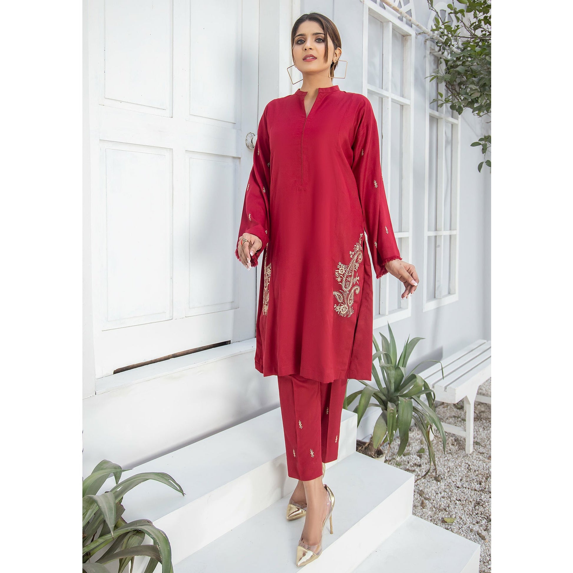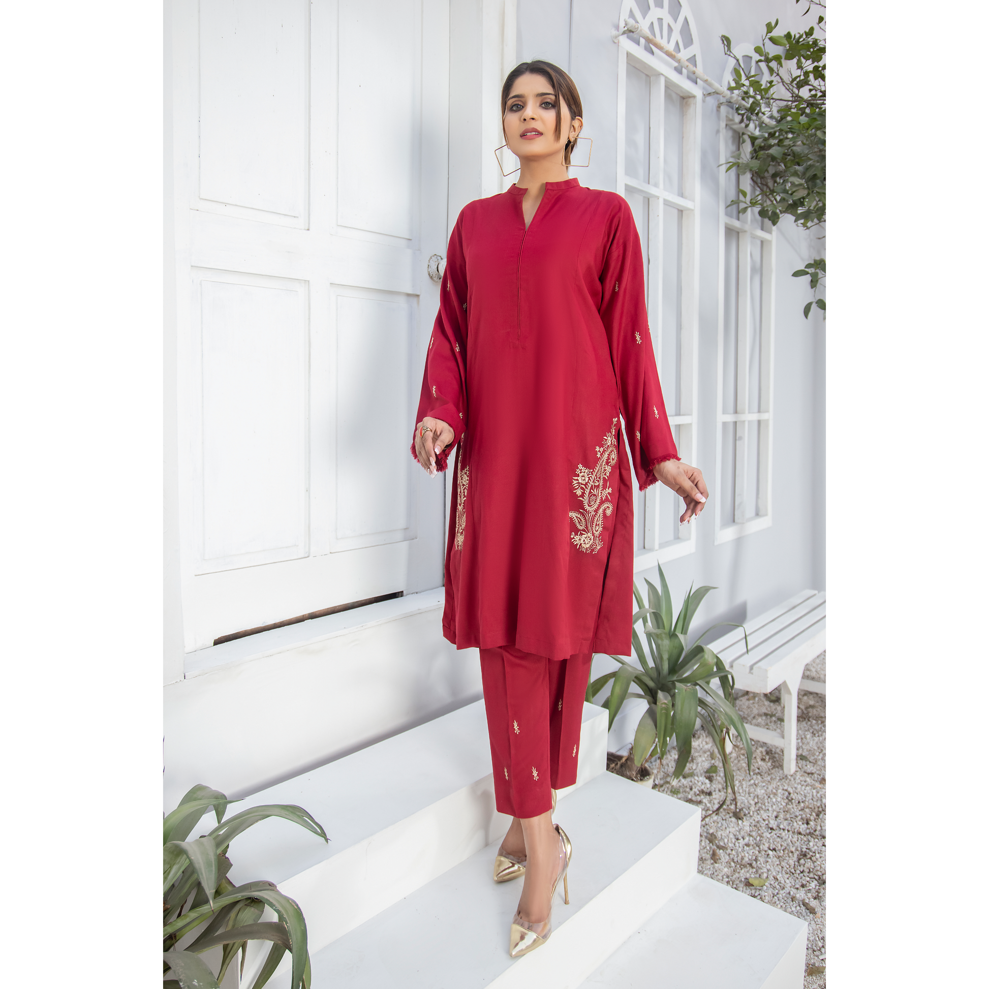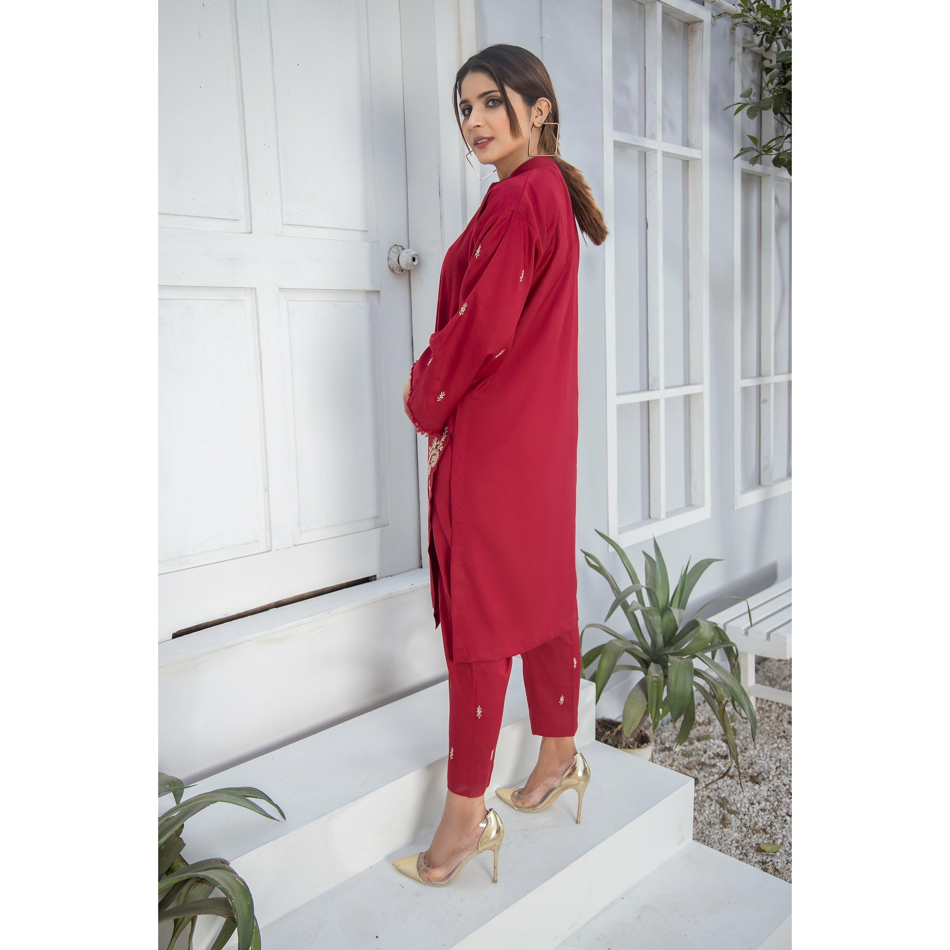 A matter-of-fact definition of elegance features a fine cotton shirt elegantly designed in a kurta shape Enriched with elaborate embroidery on both front sides, this sophisticated ensemble is an ideal option for the upcoming summer.