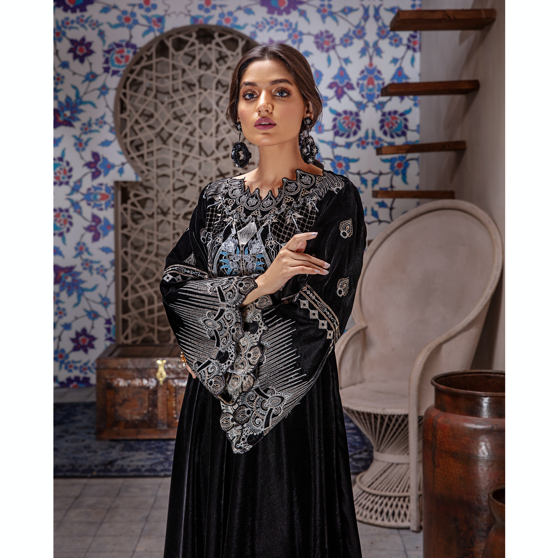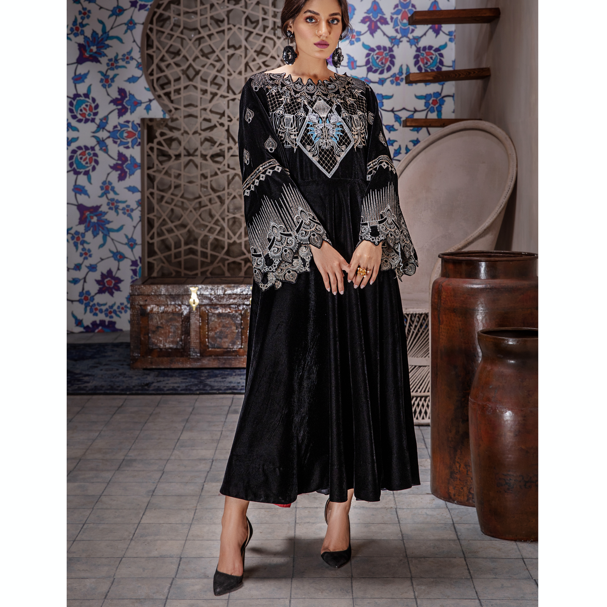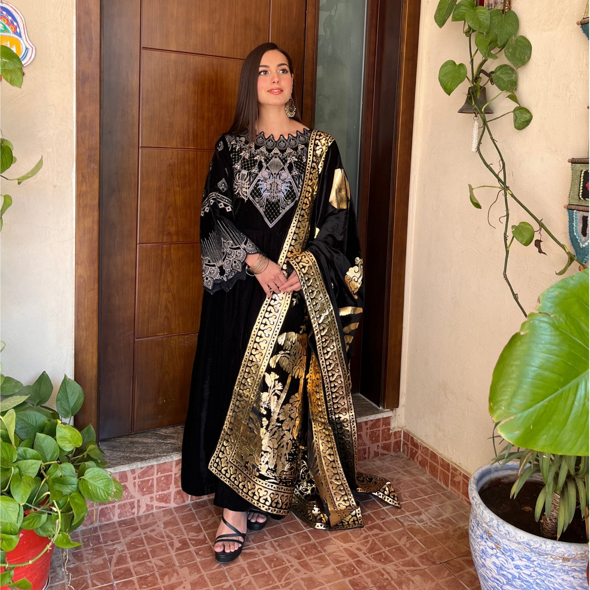 This glorious velvet combo is artfully illustrated with intricate gleaming details to create an enchanting festive look.