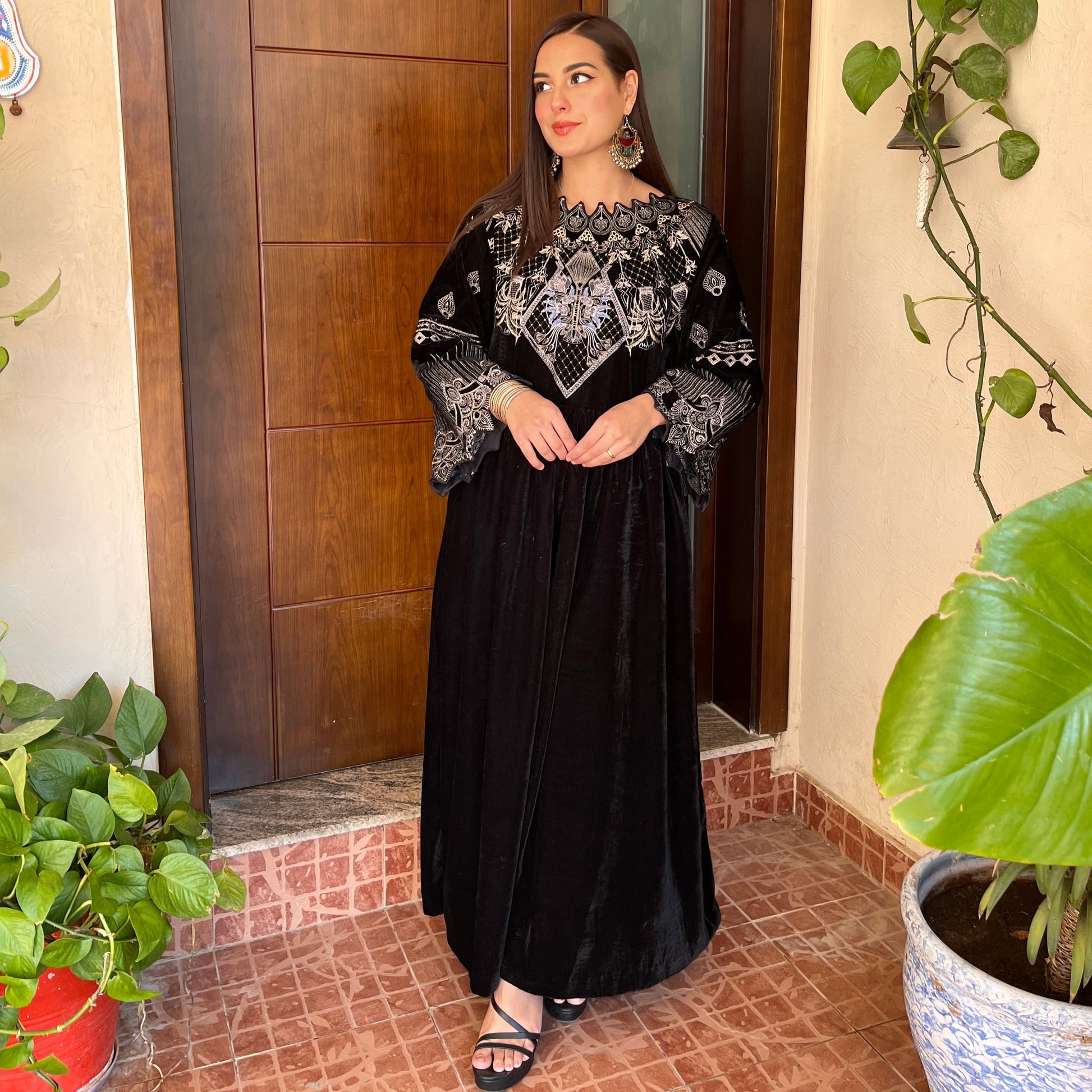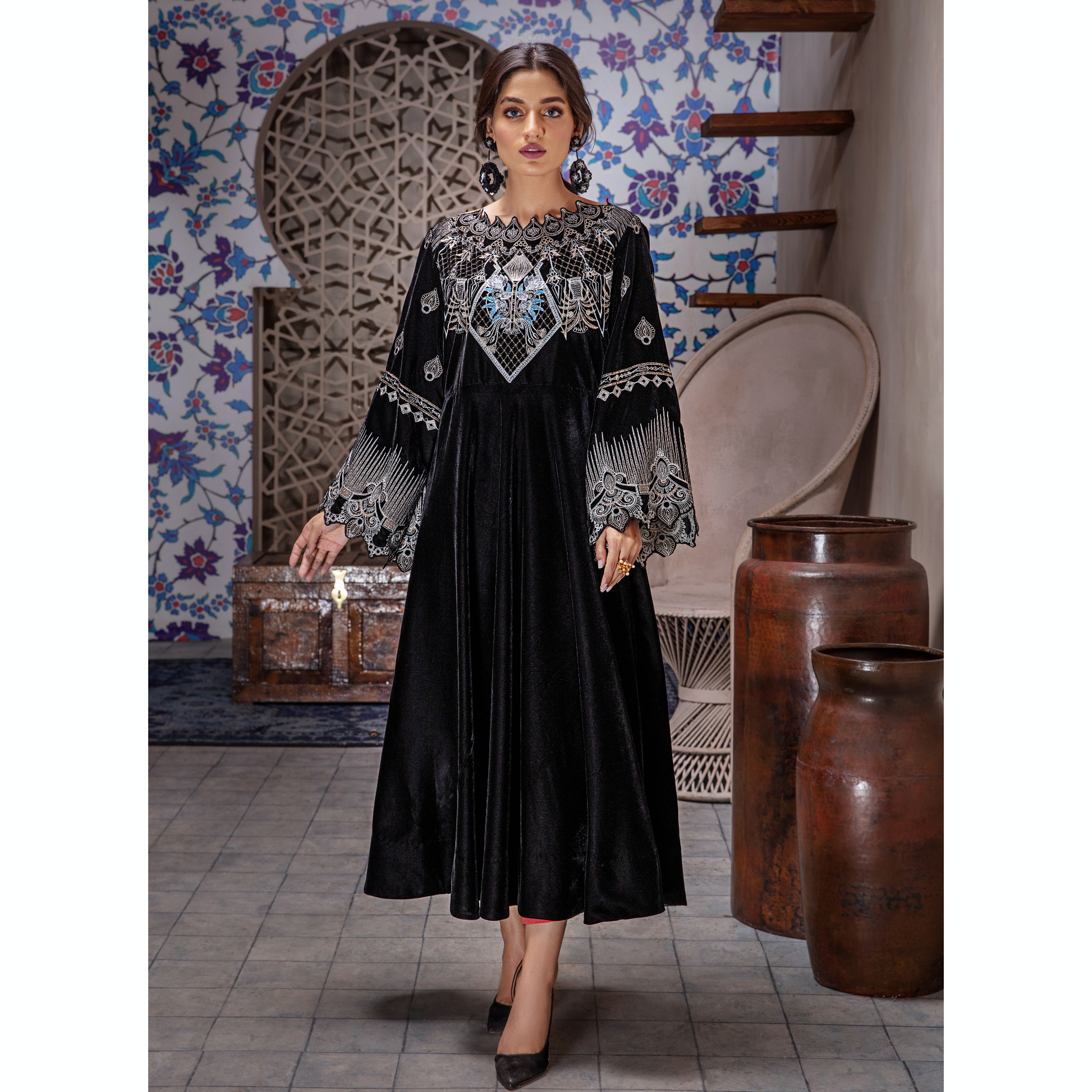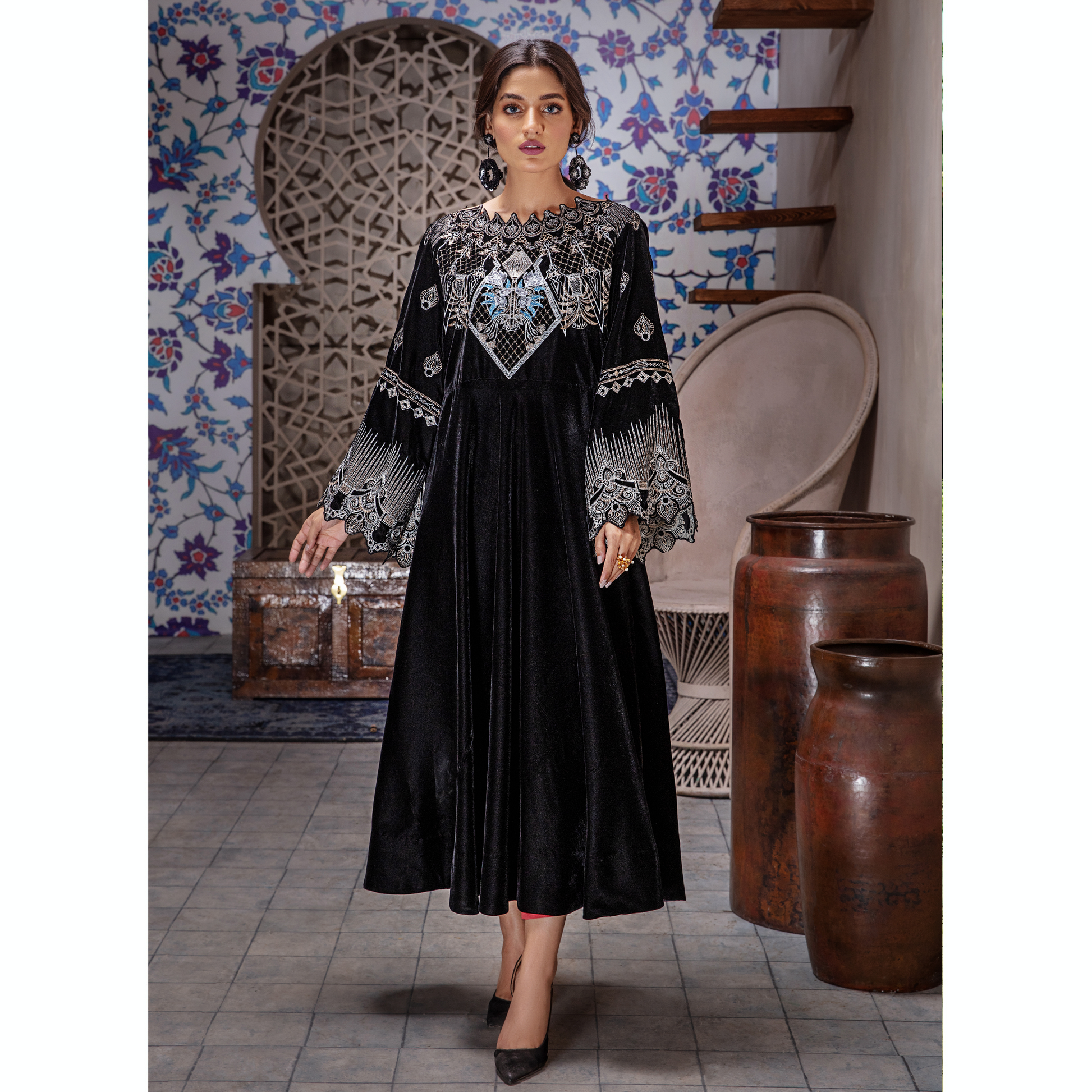 This glorious velvet combo is artfully illustrated with intricate gleaming details to create an enchanting festive look.