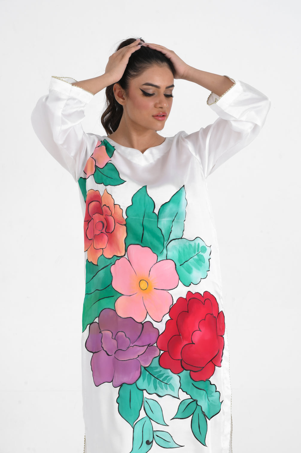 Floral patterns bring hope! Fann is a lustrous white silk dress with beautiful hand paint over the shirt front. The hand paint is a floral pattern in the energetic hues of pinks, purples and green adding energy and life into the glossy silk base. This beautiful shirt piece is paired with plain shamoz silk pants.