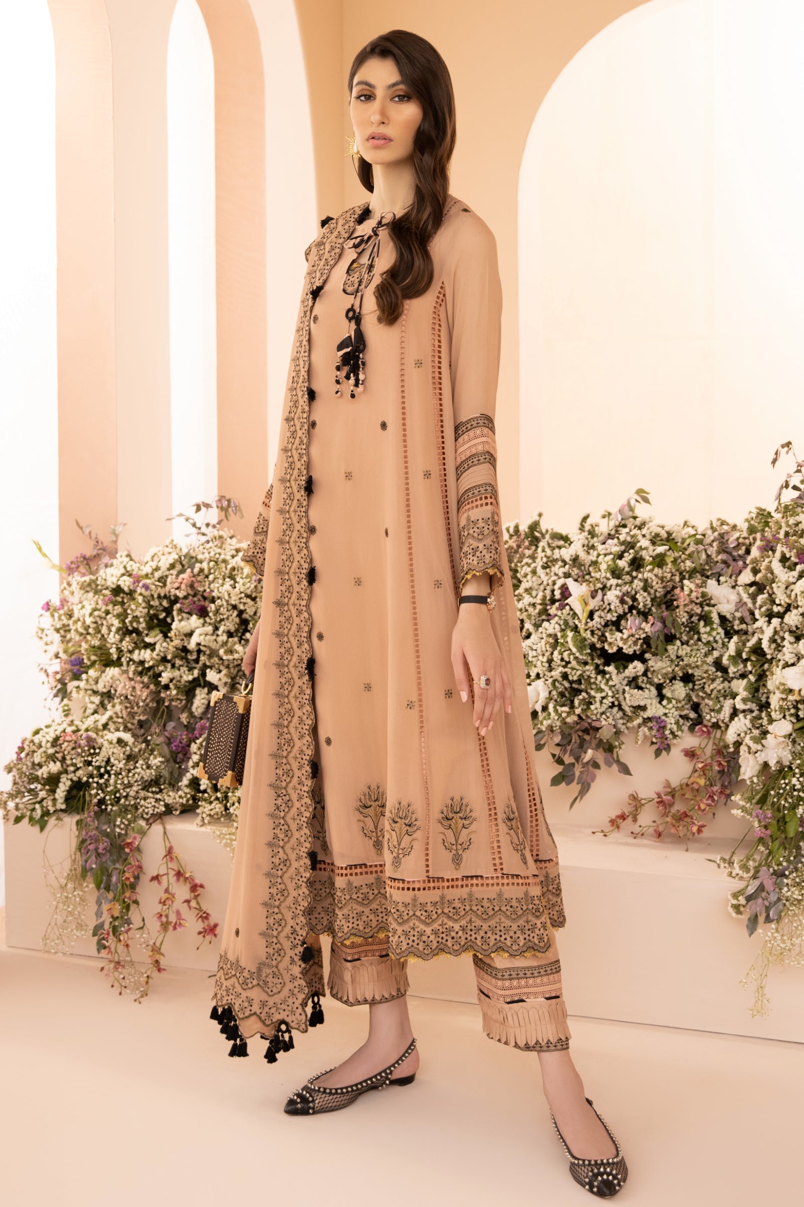 A minimalist's dream, 'Cappuccino' is crafted from creamy coffee hued crepe silk and adorned with delicate ebony embroideries. Paired with a bordered dupatta with ebony tassels and tonal trousers, this classic look will never go out of style.