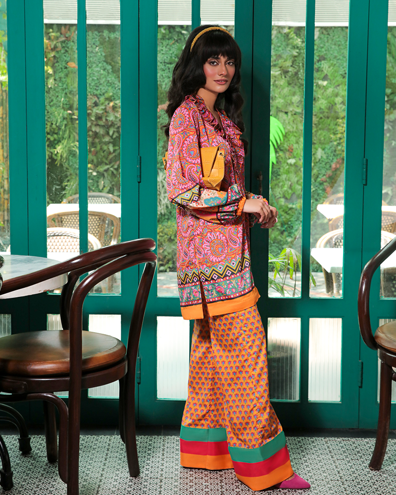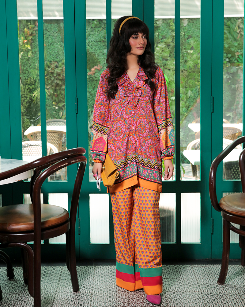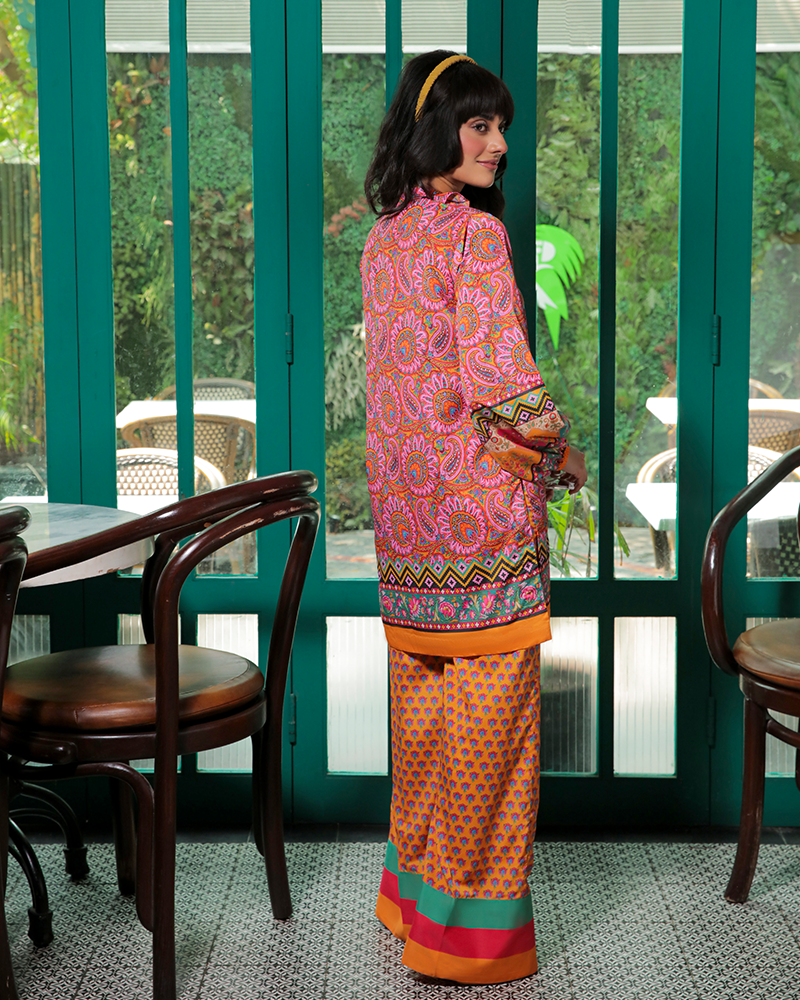 Dreamscape is a gorgeously crafted tea pink 2-piece grip fabric set designed with delicate florals and multi-colored patterns exuding a funky retro vibe.