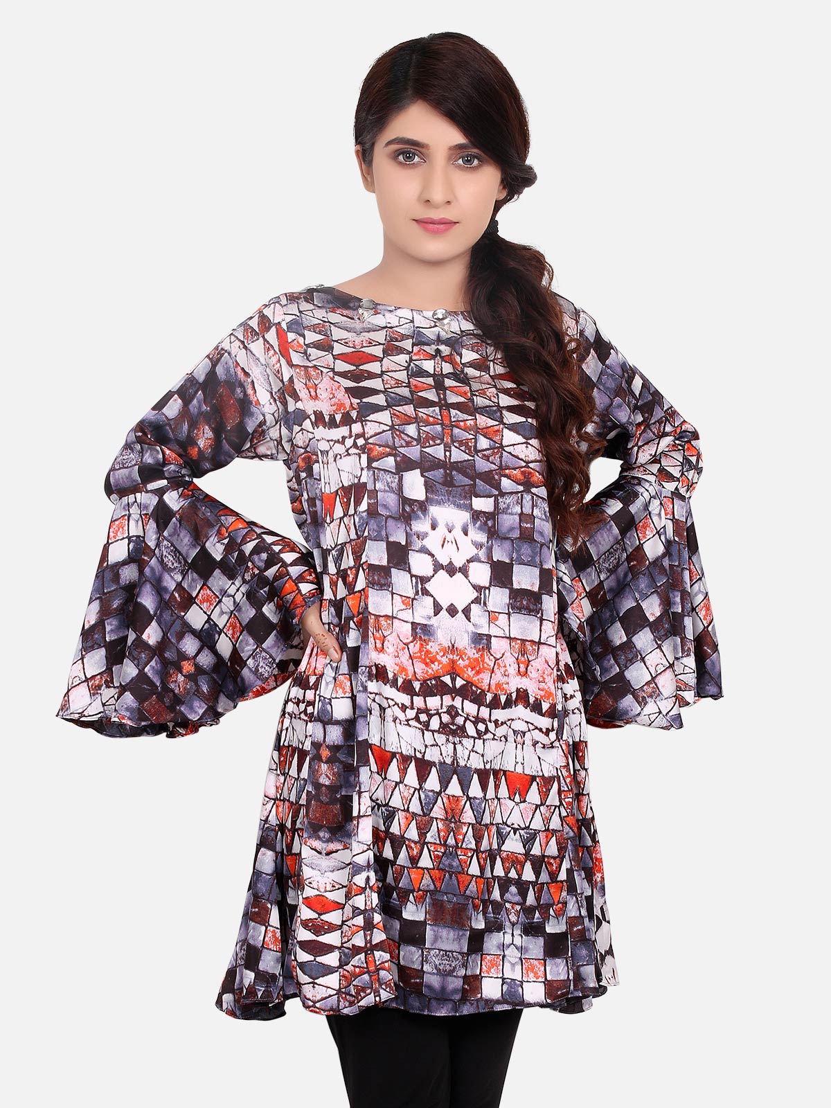 Fabric: Silkflare a-line tunic with princess panels in a bias cut and flared sleeves enhanced with jewels at the neck line.