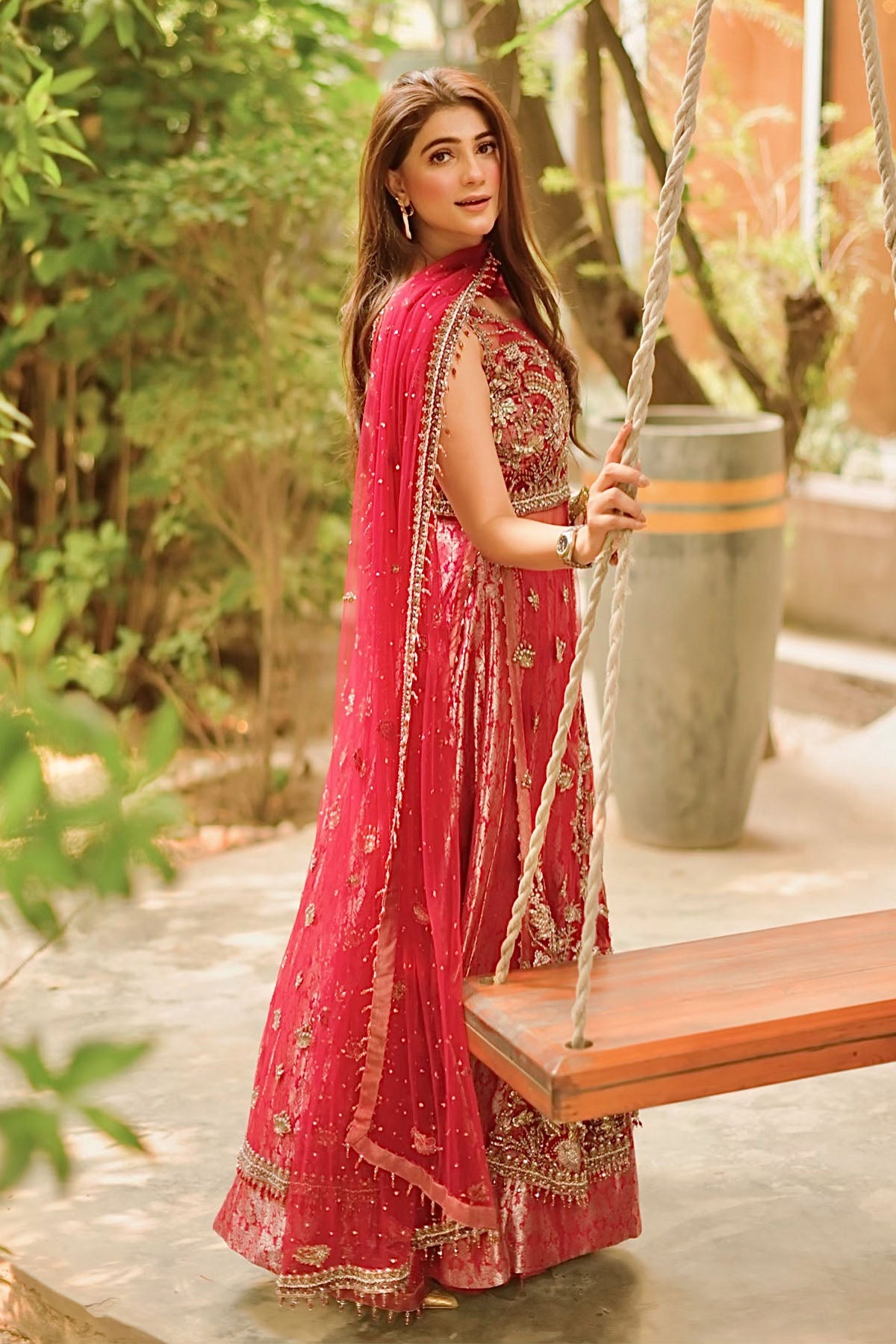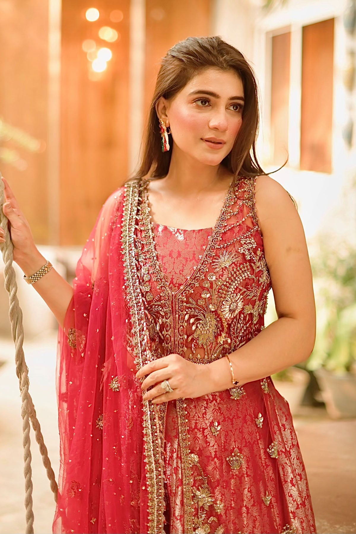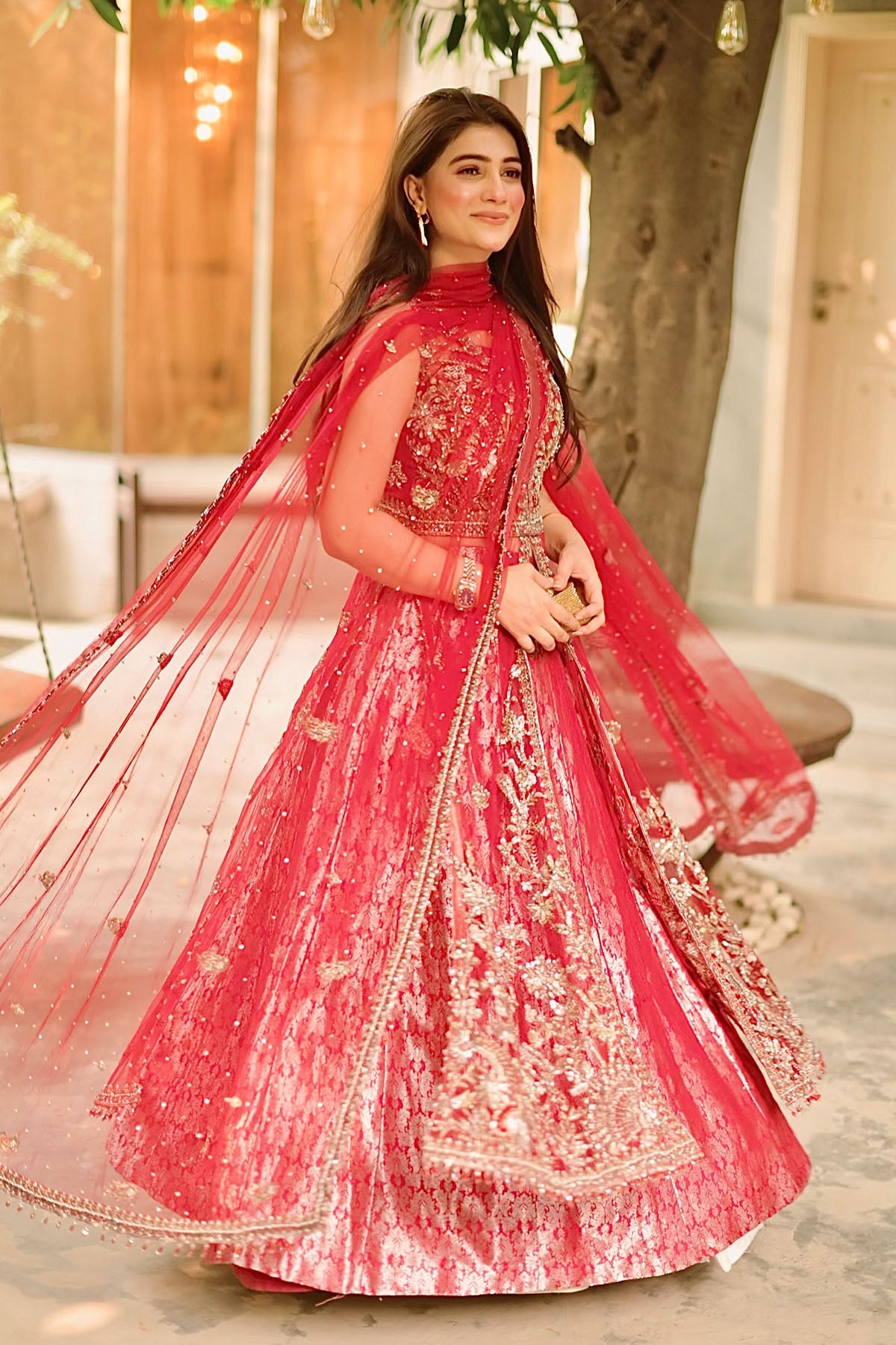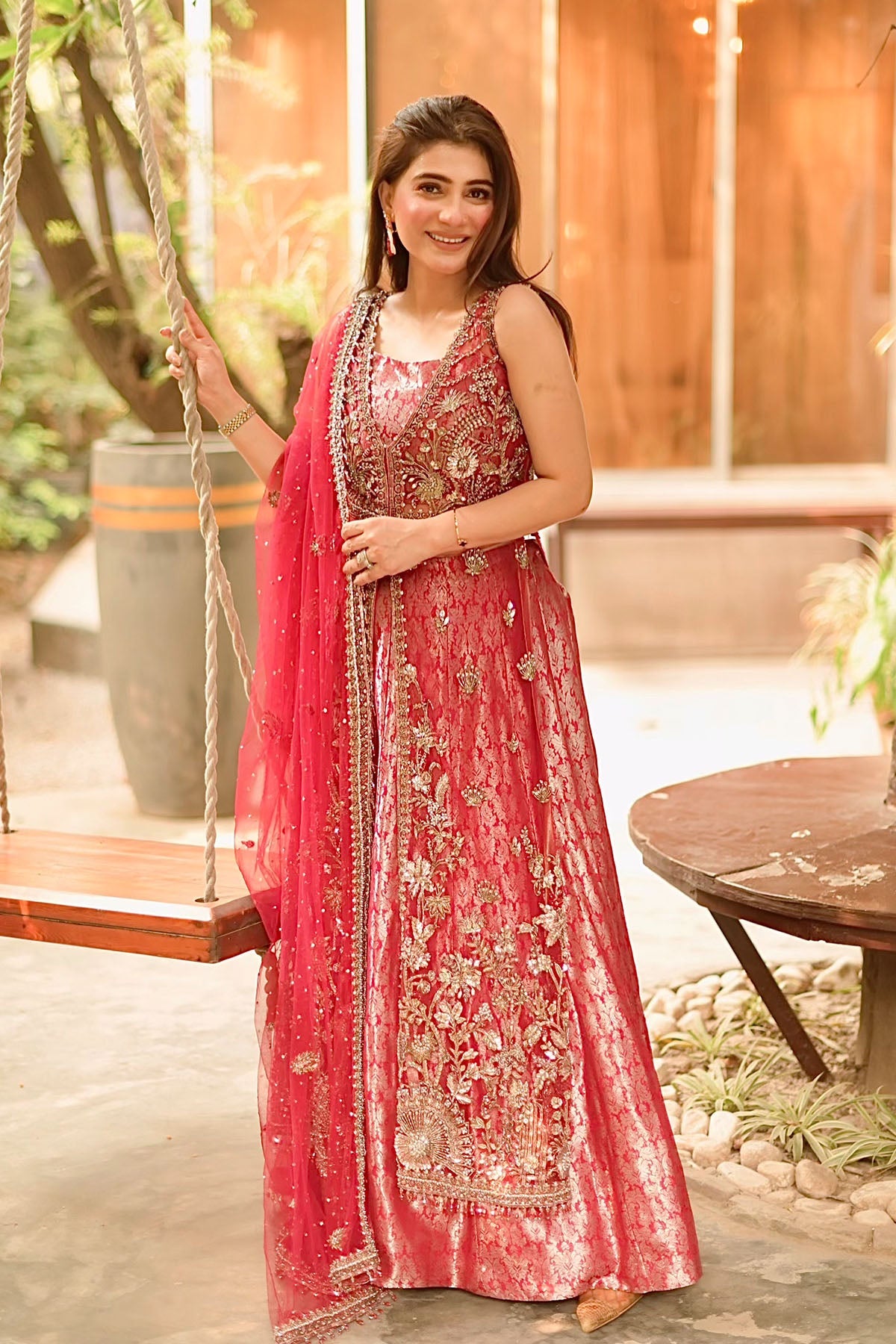 Showcasing detailed craftsmanship, a front-open net shirt in a coral pink shade is handcrafted with aari and zardoze work with kora and dabka makes bold statement like east meets west.. A Jamewar lehnga sits beneath the long open shirt. This regal ensemble is completed with a net dupatta with sequin and zardoze work