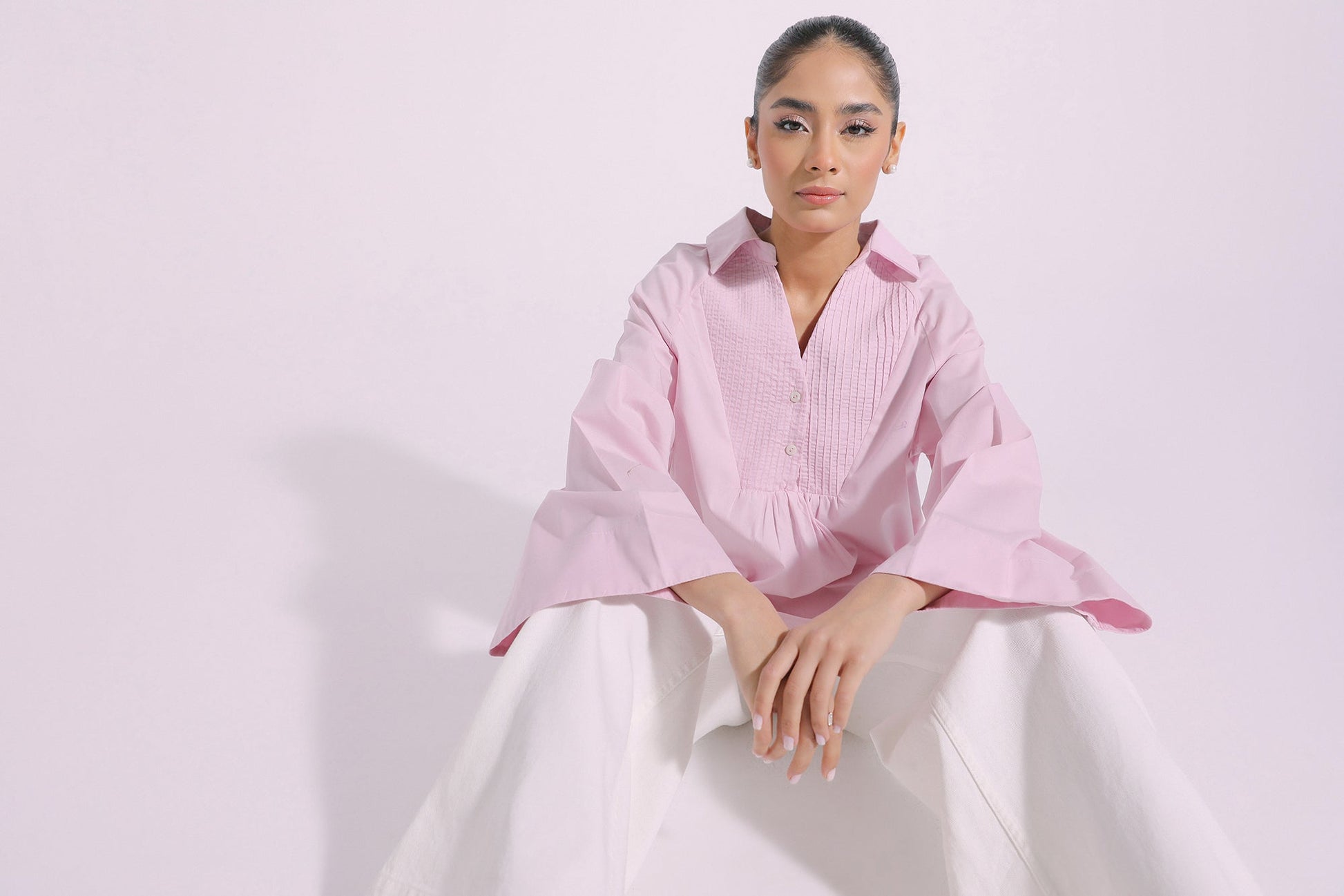 A fascinating design is portrayed on this trendy top rendered in a classy orchid pink shade. It illustrates a trendy peplum silhouette adorned with pleated details at front and enhanced with gathers. Style this elegant collar neck top at fun gatherings this happening season.